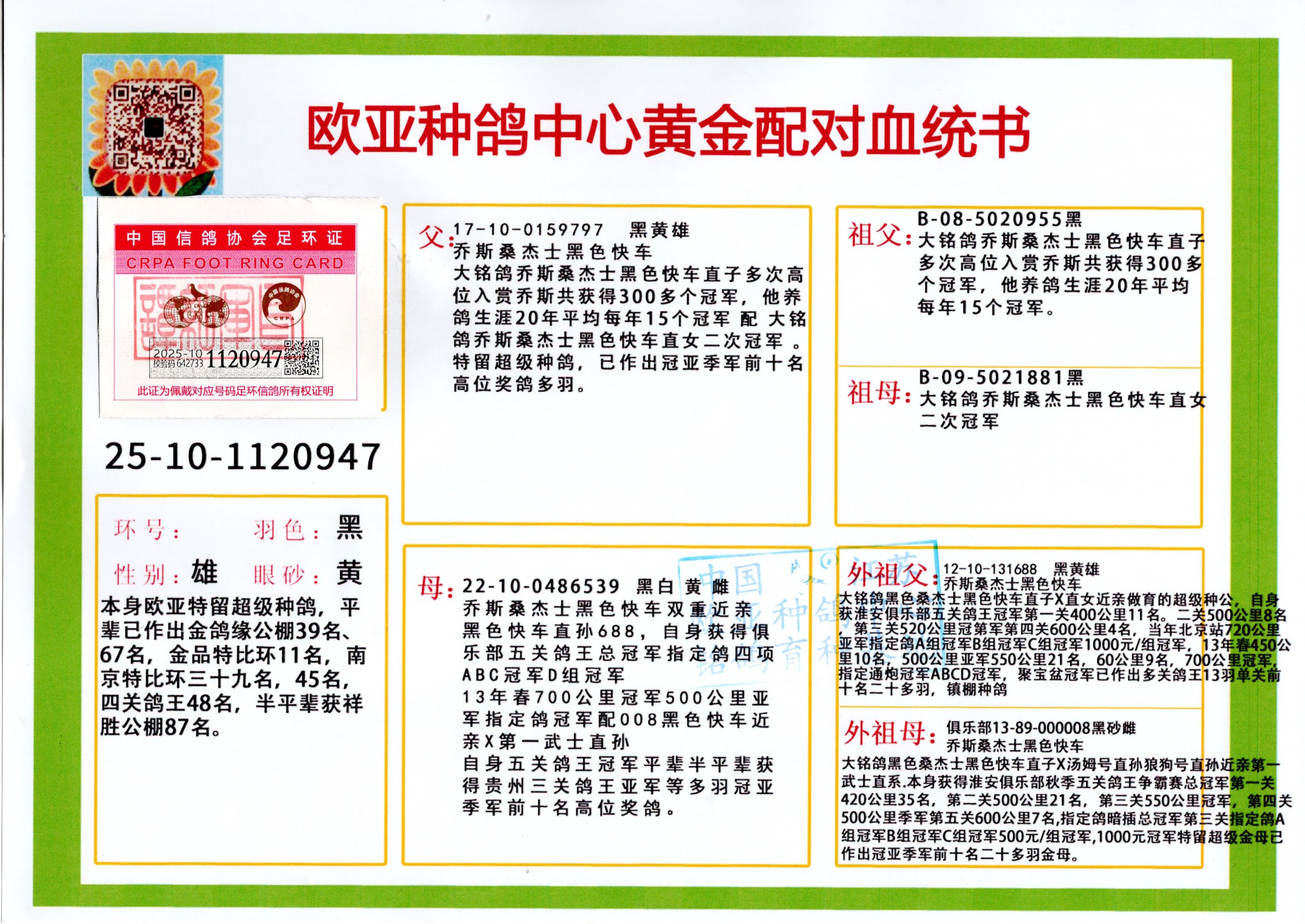 24年秋南京特比环欧亚荣获大团体冠军.小团体冠军551公里大特比13名.14名.16名.19名.20名.21名.24名.26名.27名.28名.42名.52名.54名.57名.65名.66名.68名.70名.71名.72名.74名.76名.80名.82名.83名.84名.85名.86名.90名.92名.110名.116名.121名.122名.128名.131名.158名.161名.164名.165名.166名.172名.174名.177名.182名.195名.196名.201名.205名.208名.210名.216名.253名.269名.275名.276名.294名.296名.299名,,24年秋云南天南铜都公棚决赛415名.天南铜都小棚决赛409名.云南玉活公棚决赛102名.490名.团体32名上笼二羽进二羽,天南铜都大棚506公里决赛445名。热烈祝贺河北省巨鹿县李兰生老师用欧亚泰山号血系连续十一年夺冠军,河北省国家赛冠军.全国季军等多次前十名高位,扬州王军王总用欧亚利奥24年春季获山东翔宇公棚决赛33名盖比53名。南京刘正龙刘总用欧亚盖比获得24年秋山东潍坊国际公棚决赛42名.精英赛30名.三关鸽王71名.决赛86名.加站赛16名.南京市特比环A组鸽王9名.B组鸽王5名.6名.C组鸽王5名.精英赛冠军4名.技能赛A组冠军4名.5名.秦淮区特比环荣获15名.46名.48名.87名。四川西昌徐亮徐总用欧亚利奥获得凉山州聚友决赛177名.第二关亚军双关鸽王19名.三关鸽王105名.云南豪庭公棚决赛603名。热烈祝贺24年四川重庆翔园鸽舍用欧亚泰山号荣获春季400公里冠军.秋季500公里冠军,河北王总用詹森X利奥获得千羽千翔公棚400公里冠军,广东蔡楷焕荣获24年秋爱好者 赛鸽俱乐部三关鸽王季军.一关420公里99名.二关450公里11名.三关520公里32名.单关季军.7名.12名,江西李卫兴荣获贵州红枫公棚8名.共翔俱乐部寄养棚四关综合鸽王30名.一关400公里78名.二关500公里55名.三关520公里37名.四关500公里57名.同父母获公棚18名.雷鸣获得武汉黄浦育翔中心冠军,四川陈文获得四川明鸿俱乐部300公里梦幻2名.3名.4名.9名.10名.13名.14名.15名.31名.34名.40名.41名.42名.43名.69名.71名.72名.73名.74名.94名.95名.97名.98名.99名.419公里决赛荣获总冠军7名.总共归巢9羽,四川徐亮获豪庭决赛603名,山西郑勇获得山西泰鑫公棚决赛255名詹森红狐,热烈祝贺马总获得开尔(飞跃队)决赛9名获奖金1310000万元.第一关52名,天津津福资赛180公里96名.获奖金429543万元,欧亚支持全国鸽友24年秋多人报喜 祝大家取得更好成绩,给欧亚报喜鸽友欧亚决定给每人赠送一羽超级种鸽。欧亚俱乐部特比环多关鸽王成绩:15年秋淮安特比环黑色星期一全会上笼9700多羽,当天无鸽归巢,第二天全会归巢357羽,本舍归巢158羽.前十名八羽.前一百名归巢57羽,16年春季获五关鸽王总冠军,总亚军四名.六名.七名.九名.十名.晶艺俱乐部520公里冠亚季军5名.6名.7名.9名.11名等,火车头冠军.季军6名.8名.9名.10名,16年秋晶艺俱乐部特比环520公里亚军.季军4名.6名.7名.9名,15年春南京白下特比环冠军.亚军.季军6名.7名.8名.9名.10名.指定鸽A B组获得冠军.亚军.季军4名.5名.,17年淮安特比环亚军.4名.5名.7名.8名.10名.六关鸽王总冠军.4名.6名.9名.10名,寄养棚宿迁刘总20羽特比环获冠军.季军.4名.7名.8名.9名等。18年荣获万羽特比环六关鸽王总冠军.总亚军.总季军.6名.8名.十名.单关四羽冠军.二羽亚军.四羽季军.前十名27羽。19年秋万羽特比环六关鸽王总亚军.总季军.5名.8名等,单关二羽冠军.三羽亚军.一羽季军前十名31羽。20年秋淮安市鸽会四关特比环大赛风雨无阻鸽王亚军.鸽王六名,金品俱乐部万羽特比环六关鸽王总冠军,总亚军.四名.五名.六名.七名.八名.十名.前二百名鸽王35羽,单关冠亚季军前十名四十多羽,火车头五关鸽王季军.六名.八名.前二百名鸽王十七羽。20年春荣获淮安五区一市四关鸽王总冠军.亚军.四名.八名.九名。21年秋荣获金品万羽特比环大赛六关鸽王总亚军.总季军.四名.七名.九名.十名.单关冠亚军季军前十名三十多羽。火车头协会鸽王六名.七名.十名.单关前十名十七羽。22年秋荣获鸽王总冠军.总亚军.5名.7名.8名.9名.11名.单关冠亚季军前十名三十多羽,第一关单关前二百名四十多羽,第二关前二百名三十多羽,第三关前二百名四十多羽,第四关前二百名四十多羽,第五关前一百名53羽。23年秋荣获鸽王季军.五名.八名.十名.13名.17名.20名.27名等多羽鸽王.单关前十名二十多羽。公棚.寄养棚部分成绩:16年秋宁夏黄河公棚总冠军电脑戈马力指定通炮冠军,17年送八羽参赛获得鸽王八名进奖四名,支持韩总荣获八名。支持鸽友荣获宁夏中卫公棚决赛总冠军.精英赛冠军,支持18年宁夏黄河公棚决赛冠军詹森X泰山。安徽鼎博寄养棚院内外四关鸽王总冠军.鸽王十七名.三十七名同窝,鸽王39名.42名.58名.67名。18年山东公棚预赛冠军.决赛65名.送八羽进奖五羽.指定获奔驰汽车一辆。支持鸽友获得云南蓝云公棚冠军.盖比X佛卡门。支持鸽友荣获云南银集公棚决赛冠军 詹森427X520血系 速度赛6700羽冠军。17年荣获金马俱乐部寄养棚四关鸽王总冠军.季军.六名.八名.第一关冠军.亚军.季军四名.七名.十一名.金牌教练奖。支持鸽友18年北京费翔公棚预赛九名电脑X桑杰士,支持鸽友荣获陕西威力公棚决赛11名.内蒙古临河寄养棚四关鸽王六名.詹森配泰山,支持河北王总用欧亚詹森427配胡本喜获20年秋开尔青年棚季军。云南东荣公棚16年预赛冠军.决赛77名.17年决赛12名.詹森红狐X泰山,17年平安公棚决赛4名 詹森427。欧亚获得21年金母寄养棚第一关四名.第二关5名.第三关5名.6名.7名.10名.三关鸽王总冠军,四关鸽王14名.十羽鸽王。支持河