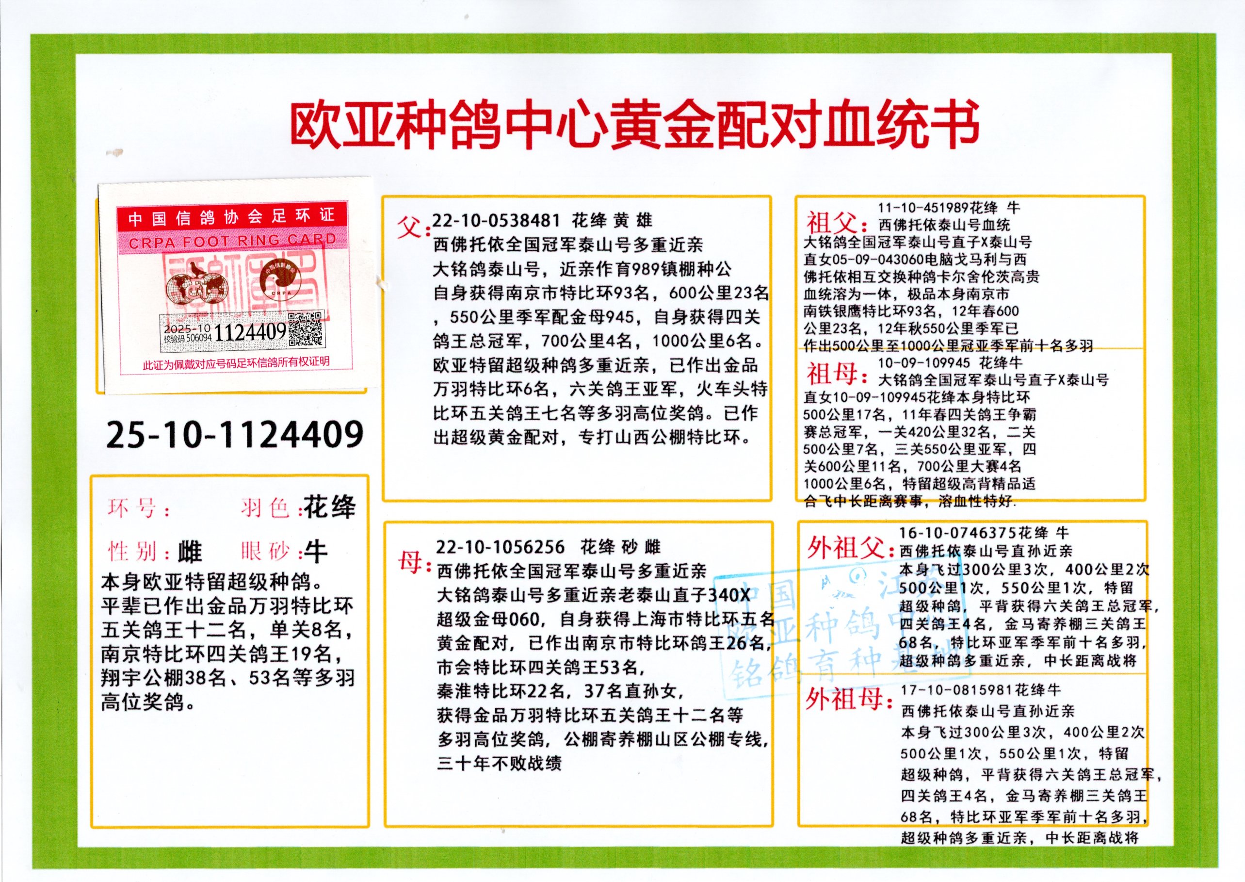 24年秋南京特比环欧亚荣获大团体冠军.小团体冠军551公里大特比13名.14名.16名.19名.20名.21名.24名.26名.27名.28名.42名.52名.54名.57名.65名.66名.68名.70名.71名.72名.74名.76名.80名.82名.83名.84名.85名.86名.90名.92名.110名.116名.121名.122名.128名.131名.158名.161名.164名.165名.166名.172名.174名.177名.182名.195名.196名.201名.205名.208名.210名.216名.253名.269名.275名.276名.294名.296名.299名,,24年秋云南天南铜都公棚决赛415名.天南铜都小棚决赛409名.云南玉活公棚决赛102名.490名.团体32名上笼二羽进二羽,天南铜都大棚506公里决赛445名。热烈祝贺河北省巨鹿县李兰生老师用欧亚泰山号血系连续十一年夺冠军,河北省国家赛冠军.全国季军等多次前十名高位,扬州王军王总用欧亚利奥24年春季获山东翔宇公棚决赛33名盖比53名。南京刘正龙刘总用欧亚盖比获得24年秋山东潍坊国际公棚决赛42名.精英赛30名.三关鸽王71名.决赛86名.加站赛16名.南京市特比环A组鸽王9名.B组鸽王5名.6名.C组鸽王5名.精英赛冠军4名.技能赛A组冠军4名.5名.秦淮区特比环荣获15名.46名.48名.87名。四川西昌徐亮徐总用欧亚利奥获得凉山州聚友决赛177名.第二关亚军双关鸽王19名.三关鸽王105名.云南豪庭公棚决赛603名。热烈祝贺24年四川重庆翔园鸽舍用欧亚泰山号荣获春季400公里冠军.秋季500公里冠军,河北王总用詹森X利奥获得千羽千翔公棚400公里冠军,广东蔡楷焕荣获24年秋爱好者 赛鸽俱乐部三关鸽王季军.一关420公里99名.二关450公里11名.三关520公里32名.单关季军.7名.12名,江西李卫兴荣获贵州红枫公棚8名.共翔俱乐部寄养棚四关综合鸽王30名.一关400公里78名.二关500公里55名.三关520公里37名.四关500公里57名.同父母获公棚18名.雷鸣获得武汉黄浦育翔中心冠军,四川陈文获得四川明鸿俱乐部300公里梦幻2名.3名.4名.9名.10名.13名.14名.15名.31名.34名.40名.41名.42名.43名.69名.71名.72名.73名.74名.94名.95名.97名.98名.99名.419公里决赛荣获总冠军7名.总共归巢9羽,四川徐亮获豪庭决赛603名,山西郑勇获得山西泰鑫公棚决赛255名詹森红狐,热烈祝贺马总获得开尔(飞跃队)决赛9名获奖金1310000万元.第一关52名,天津津福资赛180公里96名.获奖金429543万元,欧亚支持全国鸽友24年秋多人报喜 祝大家取得更好成绩,给欧亚报喜鸽友欧亚决定给每人赠送一羽超级种鸽。欧亚俱乐部特比环多关鸽王成绩:15年秋淮安特比环黑色星期一全会上笼9700多羽,当天无鸽归巢,第二天全会归巢357羽,本舍归巢158羽.前十名八羽.前一百名归巢57羽,16年春季获五关鸽王总冠军,总亚军四名.六名.七名.九名.十名.晶艺俱乐部520公里冠亚季军5名.6名.7名.9名.11名等,火车头冠军.季军6名.8名.9名.10名,16年秋晶艺俱乐部特比环520公里亚军.季军4名.6名.7名.9名,15年春南京白下特比环冠军.亚军.季军6名.7名.8名.9名.10名.指定鸽A B组获得冠军.亚军.季军4名.5名.,17年淮安特比环亚军.4名.5名.7名.8名.10名.六关鸽王总冠军.4名.6名.9名.10名,寄养棚宿迁刘总20羽特比环获冠军.季军.4名.7名.8名.9名等。18年荣获万羽特比环六关鸽王总冠军.总亚军.总季军.6名.8名.十名.单关四羽冠军.二羽亚军.四羽季军.前十名27羽。19年秋万羽特比环六关鸽王总亚军.总季军.5名.8名等,单关二羽冠军.三羽亚军.一羽季军前十名31羽。20年秋淮安市鸽会四关特比环大赛风雨无阻鸽王亚军.鸽王六名,金品俱乐部万羽特比环六关鸽王总冠军,总亚军.四名.五名.六名.七名.八名.十名.前二百名鸽王35羽,单关冠亚季军前十名四十多羽,火车头五关鸽王季军.六名.八名.前二百名鸽王十七羽。20年春荣获淮安五区一市四关鸽王总冠军.亚军.四名.八名.九名。21年秋荣获金品万羽特比环大赛六关鸽王总亚军.总季军.四名.七名.九名.十名.单关冠亚军季军前十名三十多羽。火车头协会鸽王六名.七名.十名.单关前十名十七羽。22年秋荣获鸽王总冠军.总亚军.5名.7名.8名.9名.11名.单关冠亚季军前十名三十多羽,第一关单关前二百名四十多羽,第二关前二百名三十多羽,第三关前二百名四十多羽,第四关前二百名四十多羽,第五关前一百名53羽。23年秋荣获鸽王季军.五名.八名.十名.13名.17名.20名.27名等多羽鸽王.单关前十名二十多羽。公棚.寄养棚部分成绩:16年秋宁夏黄河公棚总冠军电脑戈马力指定通炮冠军,17年送八羽参赛获得鸽王八名进奖四名,支持韩总荣获八名。支持鸽友荣获宁夏中卫公棚决赛总冠军.精英赛冠军,支持18年宁夏黄河公棚决赛冠军詹森X泰山。安徽鼎博寄养棚院内外四关鸽王总冠军.鸽王十七名.三十七名同窝,鸽王39名.42名.58名.67名。18年山东公棚预赛冠军.决赛65名.送八羽进奖五羽.指定获奔驰汽车一辆。支持鸽友获得云南蓝云公棚冠军.盖比X佛卡门。支持鸽友荣获云南银集公棚决赛冠军 詹森427X520血系 速度赛6700羽冠军。17年荣获金马俱乐部寄养棚四关鸽王总冠军.季军.六名.八名.第一关冠军.亚军.季军四名.七名.十一名.金牌教练奖。支持鸽友18年北京费翔公棚预赛九名电脑X桑杰士,支持鸽友荣获陕西威力公棚决赛11名.内蒙古临河寄养棚四关鸽王六名.詹森配泰山,支持河北王总用欧亚詹森427配胡本喜获20年秋开尔青年棚季军。云南东荣公棚16年预赛冠军.决赛77名.17年决赛12名.詹森红狐X泰山,17年平安公棚决赛4名 詹森427。欧亚获得21年金母寄养棚第一关四名.第二关5名.第三关5名.6名.7名.10名.三关鸽王总冠军,四关鸽王14名.十羽鸽王。支持河