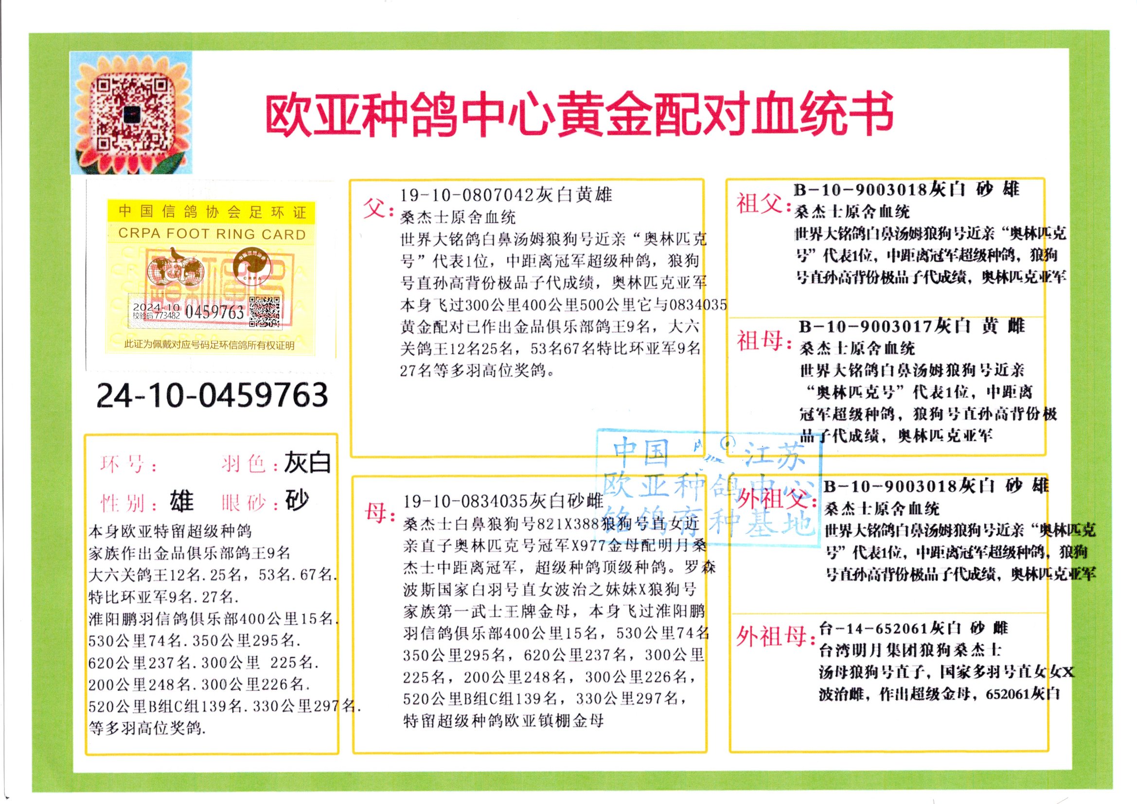 24年秋南京特比环欧亚荣获大团体冠军.小团体冠军551公里大特比13名.14名.16名.19名.20名.21名.24名.26名.27名.28名.42名.52名.54名.57名.65名.66名.68名.70名.71名.72名.74名.76名.80名.82名.83名.84名.85名.86名.90名.92名.110名.116名.121名.122名.128名.131名.158名.161名.164名.165名.166名.172名.174名.177名.182名.195名.196名.201名.205名.208名.210名.216名.253名.269名.275名.276名.294名.296名.299名,,24年秋云南天南铜都公棚决赛415名.天南铜都小棚决赛409名.云南玉活公棚决赛102名.490名.团体32名上笼二羽进二羽,天南铜都大棚506公里决赛445名。热烈祝贺河北省巨鹿县李兰生老师用欧亚泰山号血系连续十一年夺冠军,河北省国家赛冠军.全国季军等多次前十名高位,扬州王军王总用欧亚利奥24年春季获山东翔宇公棚决赛33名盖比53名。南京刘正龙刘总用欧亚盖比获得24年秋山东潍坊国际公棚决赛42名.精英赛30名.三关鸽王71名.决赛86名.加站赛16名.南京市特比环A组鸽王9名.B组鸽王5名.6名.C组鸽王5名.精英赛冠军4名.技能赛A组冠军4名.5名.秦淮区特比环荣获15名.46名.48名.87名。四川西昌徐亮徐总用欧亚利奥获得凉山州聚友决赛177名.第二关亚军双关鸽王19名.三关鸽王105名.云南豪庭公棚决赛603名。热烈祝贺24年四川重庆翔园鸽舍用欧亚泰山号荣获春季400公里冠军.秋季500公里冠军,河北王总用詹森X利奥获得千羽千翔公棚400公里冠军,广东蔡楷焕荣获24年秋爱好者 赛鸽俱乐部三关鸽王季军.一关420公里99名.二关450公里11名.三关520公里32名.单关季军.7名.12名,江西李卫兴荣获贵州红枫公棚8名.共翔俱乐部寄养棚四关综合鸽王30名.一关400公里78名.二关500公里55名.三关520公里37名.四关500公里57名.同父母获公棚18名.雷鸣获得武汉黄浦育翔中心冠军,四川陈文获得四川明鸿俱乐部300公里梦幻2名.3名.4名.9名.10名.13名.14名.15名.31名.34名.40名.41名.42名.43名.69名.71名.72名.73名.74名.94名.95名.97名.98名.99名.419公里决赛荣获总冠军7名.总共归巢9羽,四川徐亮获豪庭决赛603名,山西郑勇获得山西泰鑫公棚决赛255名詹森红狐,热烈祝贺马总获得开尔(飞跃队)决赛9名获奖金1310000万元.第一关52名,天津津福资赛180公里96名.获奖金429543万元,欧亚支持全国鸽友24年秋多人报喜 祝大家取得更好成绩,给欧亚报喜鸽友欧亚决定给每人赠送一羽超级种鸽。欧亚俱乐部特比环多关鸽王成绩:15年秋淮安特比环黑色星期一全会上笼9700多羽,当天无鸽归巢,第二天全会归巢357羽,本舍归巢158羽.前十名八羽.前一百名归巢57羽,16年春季获五关鸽王总冠军,总亚军四名.六名.七名.九名.十名.晶艺俱乐部520公里冠亚季军5名.6名.7名.9名.11名等,火车头冠军.季军6名.8名.9名.10名,16年秋晶艺俱乐部特比环520公里亚军.季军4名.6名.7名.9名,15年春南京白下特比环冠军.亚军.季军6名.7名.8名.9名.10名.指定鸽A B组获得冠军.亚军.季军4名.5名.,17年淮安特比环亚军.4名.5名.7名.8名.10名.六关鸽王总冠军.4名.6名.9名.10名,寄养棚宿迁刘总20羽特比环获冠军.季军.4名.7名.8名.9名等。18年荣获万羽特比环六关鸽王总冠军.总亚军.总季军.6名.8名.十名.单关四羽冠军.二羽亚军.四羽季军.前十名27羽。19年秋万羽特比环六关鸽王总亚军.总季军.5名.8名等,单关二羽冠军.三羽亚军.一羽季军前十名31羽。20年秋淮安市鸽会四关特比环大赛风雨无阻鸽王亚军.鸽王六名,金品俱乐部万羽特比环六关鸽王总冠军,总亚军.四名.五名.六名.七名.八名.十名.前二百名鸽王35羽,单关冠亚季军前十名四十多羽,火车头五关鸽王季军.六名.八名.前二百名鸽王十七羽。20年春荣获淮安五区一市四关鸽王总冠军.亚军.四名.八名.九名。21年秋荣获金品万羽特比环大赛六关鸽王总亚军.总季军.四名.七名.九名.十名.单关冠亚军季军前十名三十多羽。火车头协会鸽王六名.七名.十名.单关前十名十七羽。22年秋荣获鸽王总冠军.总亚军.5名.7名.8名.9名.11名.单关冠亚季军前十名三十多羽,第一关单关前二百名四十多羽,第二关前二百名三十多羽,第三关前二百名四十多羽,第四关前二百名四十多羽,第五关前一百名53羽。23年秋荣获鸽王季军.五名.八名.十名.13名.17名.20名.27名等多羽鸽王.单关前十名二十多羽。公棚.寄养棚部分成绩:16年秋宁夏黄河公棚总冠军电脑戈马力指定通炮冠军,17年送八羽参赛获得鸽王八名进奖四名,支持韩总荣获八名。支持鸽友荣获宁夏中卫公棚决赛总冠军.精英赛冠军,支持18年宁夏黄河公棚决赛冠军詹森X泰山。安徽鼎博寄养棚院内外四关鸽王总冠军.鸽王十七名.三十七名同窝,鸽王39名.42名.58名.67名。18年山东公棚预赛冠军.决赛65名.送八羽进奖五羽.指定获奔驰汽车一辆。支持鸽友获得云南蓝云公棚冠军.盖比X佛卡门。支持鸽友荣获云南银集公棚决赛冠军 詹森427X520血系 速度赛6700羽冠军。17年荣获金马俱乐部寄养棚四关鸽王总冠军.季军.六名.八名.第一关冠军.亚军.季军四名.七名.十一名.金牌教练奖。支持鸽友18年北京费翔公棚预赛九名电脑X桑杰士,支持鸽友荣获陕西威力公棚决赛11名.内蒙古临河寄养棚四关鸽王六名.詹森配泰山,支持河北王总用欧亚詹森427配胡本喜获20年秋开尔青年棚季军。云南东荣公棚16年预赛冠军.决赛77名.17年决赛12名.詹森红狐X泰山,17年平安公棚决赛4名 詹森427。欧亚获得21年金母寄养棚第一关四名.第二关5名.第三关5名.6名.7名.10名.三关鸽王总冠军,四关鸽王14名.十羽鸽王。支持河