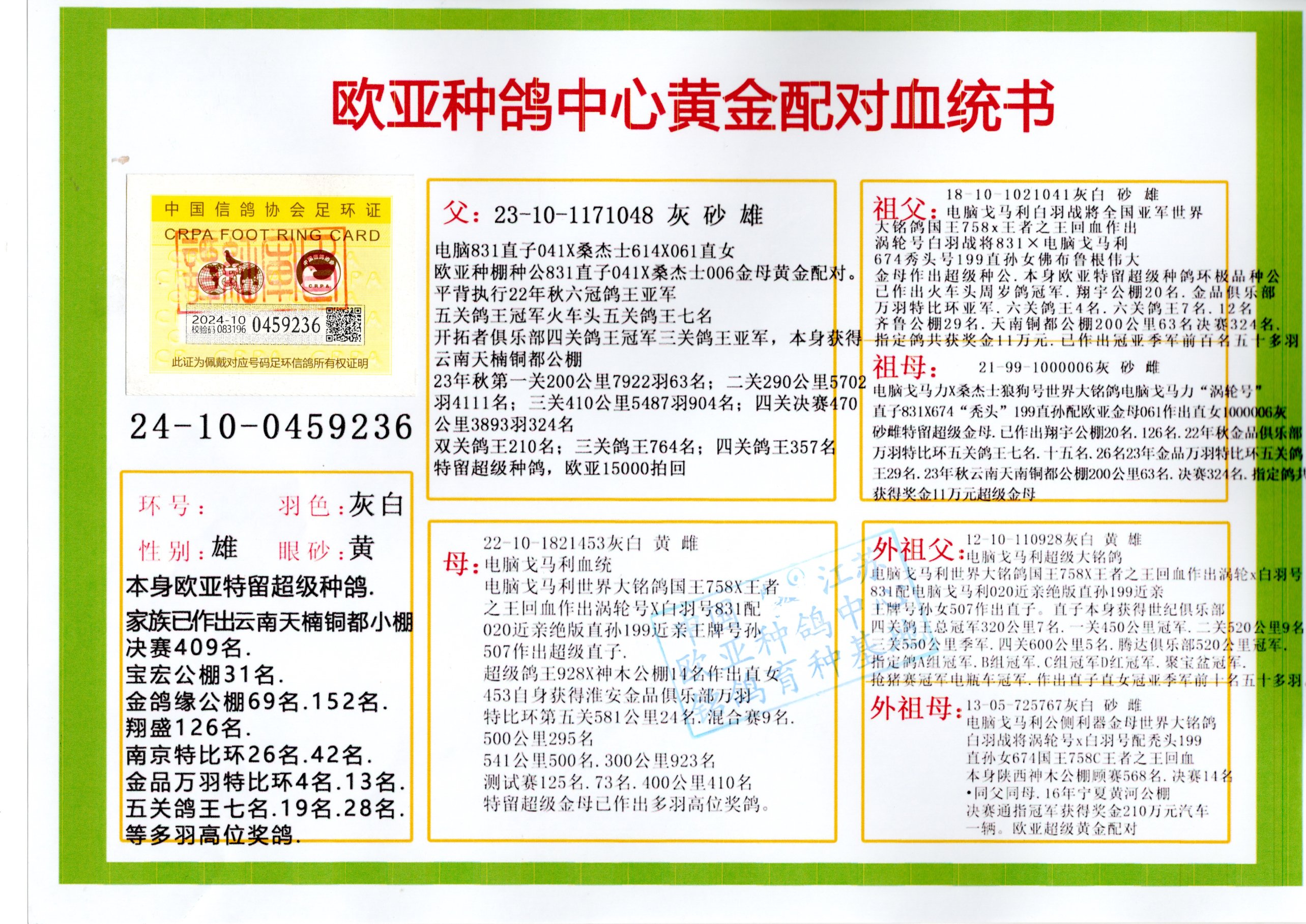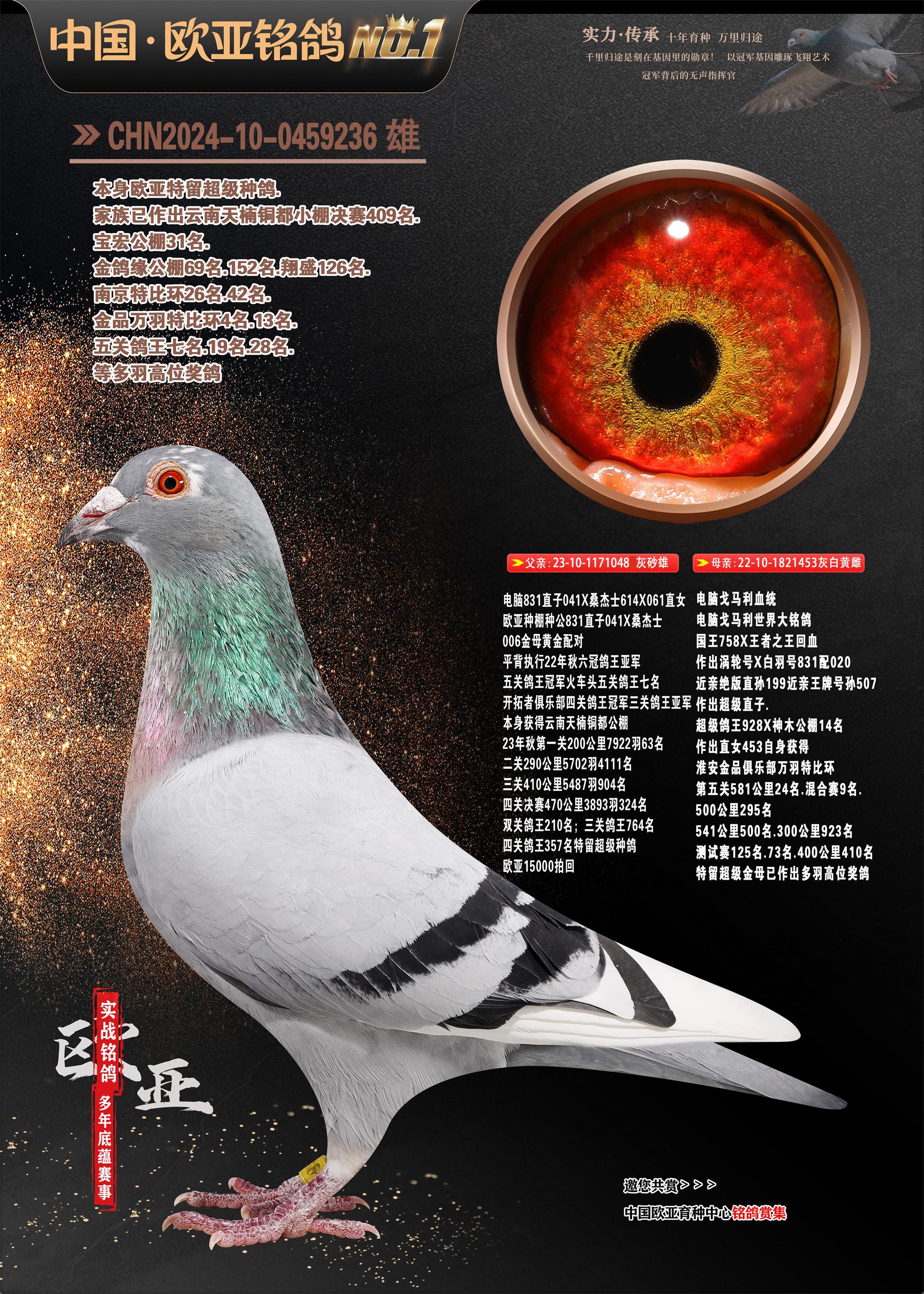 24年秋南京特比环欧亚荣获大团体冠军.小团体冠军551公里大特比13名.14名.16名.19名.20名.21名.24名.26名.27名.28名.42名.52名.54名.57名.65名.66名.68名.70名.71名.72名.74名.76名.80名.82名.83名.84名.85名.86名.90名.92名.110名.116名.121名.122名.128名.131名.158名.161名.164名.165名.166名.172名.174名.177名.182名.195名.196名.201名.205名.208名.210名.216名.253名.269名.275名.276名.294名.296名.299名,,24年秋云南天南铜都公棚决赛415名.天南铜都小棚决赛409名.云南玉活公棚决赛102名.490名.团体32名上笼二羽进二羽,天南铜都大棚506公里决赛445名。热烈祝贺河北省巨鹿县李兰生老师用欧亚泰山号血系连续十一年夺冠军,河北省国家赛冠军.全国季军等多次前十名高位,扬州王军王总用欧亚利奥24年春季获山东翔宇公棚决赛33名盖比53名。南京刘正龙刘总用欧亚盖比获得24年秋山东潍坊国际公棚决赛42名.精英赛30名.三关鸽王71名.决赛86名.加站赛16名.南京市特比环A组鸽王9名.B组鸽王5名.6名.C组鸽王5名.精英赛冠军4名.技能赛A组冠军4名.5名.秦淮区特比环荣获15名.46名.48名.87名。四川西昌徐亮徐总用欧亚利奥获得凉山州聚友决赛177名.第二关亚军双关鸽王19名.三关鸽王105名.云南豪庭公棚决赛603名。热烈祝贺24年四川重庆翔园鸽舍用欧亚泰山号荣获春季400公里冠军.秋季500公里冠军,河北王总用詹森X利奥获得千羽千翔公棚400公里冠军,广东蔡楷焕荣获24年秋爱好者 赛鸽俱乐部三关鸽王季军.一关420公里99名.二关450公里11名.三关520公里32名.单关季军.7名.12名,江西李卫兴荣获贵州红枫公棚8名.共翔俱乐部寄养棚四关综合鸽王30名.一关400公里78名.二关500公里55名.三关520公里37名.四关500公里57名.同父母获公棚18名.雷鸣获得武汉黄浦育翔中心冠军,四川陈文获得四川明鸿俱乐部300公里梦幻2名.3名.4名.9名.10名.13名.14名.15名.31名.34名.40名.41名.42名.43名.69名.71名.72名.73名.74名.94名.95名.97名.98名.99名.419公里决赛荣获总冠军7名.总共归巢9羽,四川徐亮获豪庭决赛603名,山西郑勇获得山西泰鑫公棚决赛255名詹森红狐,热烈祝贺马总获得开尔(飞跃队)决赛9名获奖金1310000万元.第一关52名,天津津福资赛180公里96名.获奖金429543万元,欧亚支持全国鸽友24年秋多人报喜 祝大家取得更好成绩,给欧亚报喜鸽友欧亚决定给每人赠送一羽超级种鸽。欧亚俱乐部特比环多关鸽王成绩:15年秋淮安特比环黑色星期一全会上笼9700多羽,当天无鸽归巢,第二天全会归巢357羽,本舍归巢158羽.前十名八羽.前一百名归巢57羽,16年春季获五关鸽王总冠军,总亚军四名.六名.七名.九名.十名.晶艺俱乐部520公里冠亚季军5名.6名.7名.9名.11名等,火车头冠军.季军6名.8名.9名.10名,16年秋晶艺俱乐部特比环520公里亚军.季军4名.6名.7名.9名,15年春南京白下特比环冠军.亚军.季军6名.7名.8名.9名.10名.指定鸽A B组获得冠军.亚军.季军4名.5名.,17年淮安特比环亚军.4名.5名.7名.8名.10名.六关鸽王总冠军.4名.6名.9名.10名,寄养棚宿迁刘总20羽特比环获冠军.季军.4名.7名.8名.9名等。18年荣获万羽特比环六关鸽王总冠军.总亚军.总季军.6名.8名.十名.单关四羽冠军.二羽亚军.四羽季军.前十名27羽。19年秋万羽特比环六关鸽王总亚军.总季军.5名.8名等,单关二羽冠军.三羽亚军.一羽季军前十名31羽。20年秋淮安市鸽会四关特比环大赛风雨无阻鸽王亚军.鸽王六名,金品俱乐部万羽特比环六关鸽王总冠军,总亚军.四名.五名.六名.七名.八名.十名.前二百名鸽王35羽,单关冠亚季军前十名四十多羽,火车头五关鸽王季军.六名.八名.前二百名鸽王十七羽。20年春荣获淮安五区一市四关鸽王总冠军.亚军.四名.八名.九名。21年秋荣获金品万羽特比环大赛六关鸽王总亚军.总季军.四名.七名.九名.十名.单关冠亚军季军前十名三十多羽。火车头协会鸽王六名.七名.十名.单关前十名十七羽。22年秋荣获鸽王总冠军.总亚军.5名.7名.8名.9名.11名.单关冠亚季军前十名三十多羽,第一关单关前二百名四十多羽,第二关前二百名三十多羽,第三关前二百名四十多羽,第四关前二百名四十多羽,第五关前一百名53羽。23年秋荣获鸽王季军.五名.八名.十名.13名.17名.20名.27名等多羽鸽王.单关前十名二十多羽。公棚.寄养棚部分成绩:16年秋宁夏黄河公棚总冠军电脑戈马力指定通炮冠军,17年送八羽参赛获得鸽王八名进奖四名,支持韩总荣获八名。支持鸽友荣获宁夏中卫公棚决赛总冠军.精英赛冠军,支持18年宁夏黄河公棚决赛冠军詹森X泰山。安徽鼎博寄养棚院内外四关鸽王总冠军.鸽王十七名.三十七名同窝,鸽王39名.42名.58名.67名。18年山东公棚预赛冠军.决赛65名.送八羽进奖五羽.指定获奔驰汽车一辆。支持鸽友获得云南蓝云公棚冠军.盖比X佛卡门。支持鸽友荣获云南银集公棚决赛冠军 詹森427X520血系 速度赛6700羽冠军。17年荣获金马俱乐部寄养棚四关鸽王总冠军.季军.六名.八名.第一关冠军.亚军.季军四名.七名.十一名.金牌教练奖。支持鸽友18年北京费翔公棚预赛九名电脑X桑杰士,支持鸽友荣获陕西威力公棚决赛11名.内蒙古临河寄养棚四关鸽王六名.詹森配泰山,支持河北王总用欧亚詹森427配胡本喜获20年秋开尔青年棚季军。云南东荣公棚16年预赛冠军.决赛77名.17年决赛12名.詹森红狐X泰山,17年平安公棚决赛4名 詹森427。欧亚获得21年金母寄养棚第一关四名.第二关5名.第三关5名.6名.7名.10名.三关鸽王总冠军,四关鸽王14名.十羽鸽王。支持河
