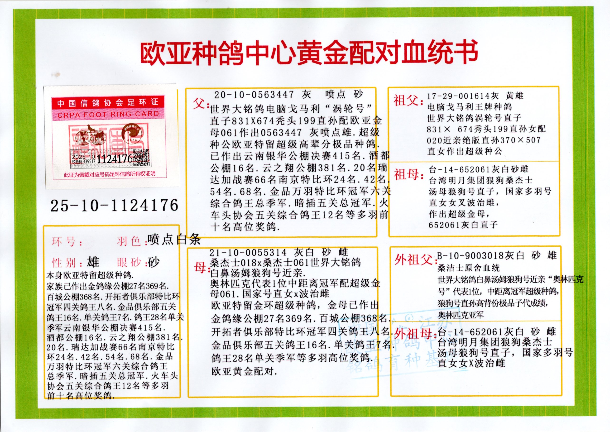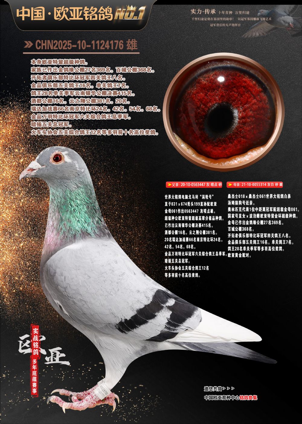 24年秋南京特比环欧亚荣获大团体冠军.小团体冠军551公里大特比13名.14名.16名.19名.20名.21名.24名.26名.27名.28名.42名.52名.54名.57名.65名.66名.68名.70名.71名.72名.74名.76名.80名.82名.83名.84名.85名.86名.90名.92名.110名.116名.121名.122名.128名.131名.158名.161名.164名.165名.166名.172名.174名.177名.182名.195名.196名.201名.205名.208名.210名.216名.253名.269名.275名.276名.294名.296名.299名,,24年秋云南天南铜都公棚决赛415名.天南铜都小棚决赛409名.云南玉活公棚决赛102名.490名.团体32名上笼二羽进二羽,天南铜都大棚506公里决赛445名。热烈祝贺河北省巨鹿县李兰生老师用欧亚泰山号血系连续十一年夺冠军,河北省国家赛冠军.全国季军等多次前十名高位,扬州王军王总用欧亚利奥24年春季获山东翔宇公棚决赛33名盖比53名。南京刘正龙刘总用欧亚盖比获得24年秋山东潍坊国际公棚决赛42名.精英赛30名.三关鸽王71名.决赛86名.加站赛16名.南京市特比环A组鸽王9名.B组鸽王5名.6名.C组鸽王5名.精英赛冠军4名.技能赛A组冠军4名.5名.秦淮区特比环荣获15名.46名.48名.87名。四川西昌徐亮徐总用欧亚利奥获得凉山州聚友决赛177名.第二关亚军双关鸽王19名.三关鸽王105名.云南豪庭公棚决赛603名。热烈祝贺24年四川重庆翔园鸽舍用欧亚泰山号荣获春季400公里冠军.秋季500公里冠军,河北王总用詹森X利奥获得千羽千翔公棚400公里冠军,广东蔡楷焕荣获24年秋爱好者 赛鸽俱乐部三关鸽王季军.一关420公里99名.二关450公里11名.三关520公里32名.单关季军.7名.12名,江西李卫兴荣获贵州红枫公棚8名.共翔俱乐部寄养棚四关综合鸽王30名.一关400公里78名.二关500公里55名.三关520公里37名.四关500公里57名.同父母获公棚18名.雷鸣获得武汉黄浦育翔中心冠军,四川陈文获得四川明鸿俱乐部300公里梦幻2名.3名.4名.9名.10名.13名.14名.15名.31名.34名.40名.41名.42名.43名.69名.71名.72名.73名.74名.94名.95名.97名.98名.99名.419公里决赛荣获总冠军7名.总共归巢9羽,四川徐亮获豪庭决赛603名,山西郑勇获得山西泰鑫公棚决赛255名詹森红狐,热烈祝贺马总获得开尔(飞跃队)决赛9名获奖金1310000万元.第一关52名,天津津福资赛180公里96名.获奖金429543万元,欧亚支持全国鸽友24年秋多人报喜 祝大家取得更好成绩,给欧亚报喜鸽友欧亚决定给每人赠送一羽超级种鸽。欧亚俱乐部特比环多关鸽王成绩:15年秋淮安特比环黑色星期一全会上笼9700多羽,当天无鸽归巢,第二天全会归巢357羽,本舍归巢158羽.前十名八羽.前一百名归巢57羽,16年春季获五关鸽王总冠军,总亚军四名.六名.七名.九名.十名.晶艺俱乐部520公里冠亚季军5名.6名.7名.9名.11名等,火车头冠军.季军6名.8名.9名.10名,16年秋晶艺俱乐部特比环520公里亚军.季军4名.6名.7名.9名,15年春南京白下特比环冠军.亚军.季军6名.7名.8名.9名.10名.指定鸽A B组获得冠军.亚军.季军4名.5名.,17年淮安特比环亚军.4名.5名.7名.8名.10名.六关鸽王总冠军.4名.6名.9名.10名,寄养棚宿迁刘总20羽特比环获冠军.季军.4名.7名.8名.9名等。18年荣获万羽特比环六关鸽王总冠军.总亚军.总季军.6名.8名.十名.单关四羽冠军.二羽亚军.四羽季军.前十名27羽。19年秋万羽特比环六关鸽王总亚军.总季军.5名.8名等,单关二羽冠军.三羽亚军.一羽季军前十名31羽。20年秋淮安市鸽会四关特比环大赛风雨无阻鸽王亚军.鸽王六名,金品俱乐部万羽特比环六关鸽王总冠军,总亚军.四名.五名.六名.七名.八名.十名.前二百名鸽王35羽,单关冠亚季军前十名四十多羽,火车头五关鸽王季军.六名.八名.前二百名鸽王十七羽。20年春荣获淮安五区一市四关鸽王总冠军.亚军.四名.八名.九名。21年秋荣获金品万羽特比环大赛六关鸽王总亚军.总季军.四名.七名.九名.十名.单关冠亚军季军前十名三十多羽。火车头协会鸽王六名.七名.十名.单关前十名十七羽。22年秋荣获鸽王总冠军.总亚军.5名.7名.8名.9名.11名.单关冠亚季军前十名三十多羽,第一关单关前二百名四十多羽,第二关前二百名三十多羽,第三关前二百名四十多羽,第四关前二百名四十多羽,第五关前一百名53羽。23年秋荣获鸽王季军.五名.八名.十名.13名.17名.20名.27名等多羽鸽王.单关前十名二十多羽。公棚.寄养棚部分成绩:16年秋宁夏黄河公棚总冠军电脑戈马力指定通炮冠军,17年送八羽参赛获得鸽王八名进奖四名,支持韩总荣获八名。支持鸽友荣获宁夏中卫公棚决赛总冠军.精英赛冠军,支持18年宁夏黄河公棚决赛冠军詹森X泰山。安徽鼎博寄养棚院内外四关鸽王总冠军.鸽王十七名.三十七名同窝,鸽王39名.42名.58名.67名。18年山东公棚预赛冠军.决赛65名.送八羽进奖五羽.指定获奔驰汽车一辆。支持鸽友获得云南蓝云公棚冠军.盖比X佛卡门。支持鸽友荣获云南银集公棚决赛冠军 詹森427X520血系 速度赛6700羽冠军。17年荣获金马俱乐部寄养棚四关鸽王总冠军.季军.六名.八名.第一关冠军.亚军.季军四名.七名.十一名.金牌教练奖。支持鸽友18年北京费翔公棚预赛九名电脑X桑杰士,支持鸽友荣获陕西威力公棚决赛11名.内蒙古临河寄养棚四关鸽王六名.詹森配泰山,支持河北王总用欧亚詹森427配胡本喜获20年秋开尔青年棚季军。云南东荣公棚16年预赛冠军.决赛77名.17年决赛12名.詹森红狐X泰山,17年平安公棚决赛4名 詹森427。欧亚获得21年金母寄养棚第一关四名.第二关5名.第三关5名.6名.7名.10名.三关鸽王总冠军,四关鸽王14名.十羽鸽王。支持河