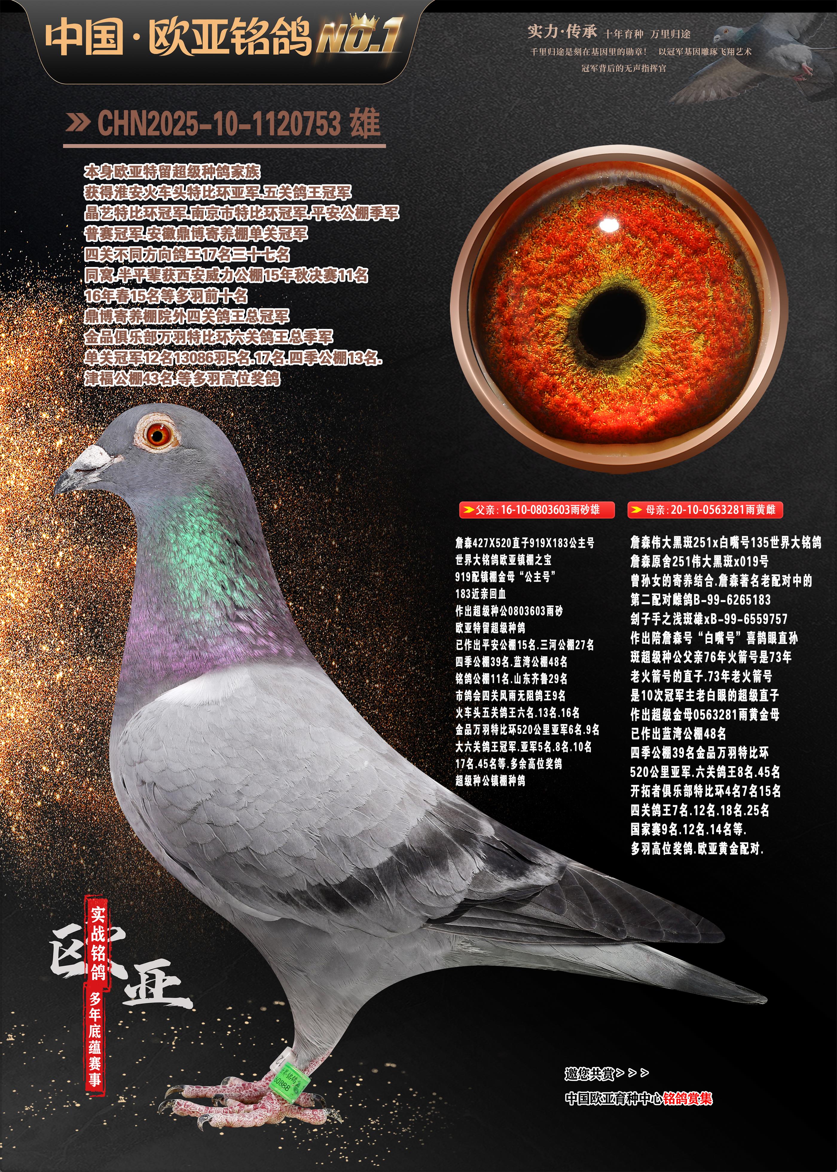 24年秋南京特比环欧亚荣获大团体冠军.小团体冠军551公里大特比13名.14名.16名.19名.20名.21名.24名.26名.27名.28名.42名.52名.54名.57名.65名.66名.68名.70名.71名.72名.74名.76名.80名.82名.83名.84名.85名.86名.90名.92名.110名.116名.121名.122名.128名.131名.158名.161名.164名.165名.166名.172名.174名.177名.182名.195名.196名.201名.205名.208名.210名.216名.253名.269名.275名.276名.294名.296名.299名,,24年秋云南天南铜都公棚决赛415名.天南铜都小棚决赛409名.云南玉活公棚决赛102名.490名.团体32名上笼二羽进二羽,天南铜都大棚506公里决赛445名。热烈祝贺河北省巨鹿县李兰生老师用欧亚泰山号血系连续十一年夺冠军,河北省国家赛冠军.全国季军等多次前十名高位,扬州王军王总用欧亚利奥24年春季获山东翔宇公棚决赛33名盖比53名。南京刘正龙刘总用欧亚盖比获得24年秋山东潍坊国际公棚决赛42名.精英赛30名.三关鸽王71名.决赛86名.加站赛16名.南京市特比环A组鸽王9名.B组鸽王5名.6名.C组鸽王5名.精英赛冠军4名.技能赛A组冠军4名.5名.秦淮区特比环荣获15名.46名.48名.87名。四川西昌徐亮徐总用欧亚利奥获得凉山州聚友决赛177名.第二关亚军双关鸽王19名.三关鸽王105名.云南豪庭公棚决赛603名。热烈祝贺24年四川重庆翔园鸽舍用欧亚泰山号荣获春季400公里冠军.秋季500公里冠军,河北王总用詹森X利奥获得千羽千翔公棚400公里冠军,广东蔡楷焕荣获24年秋爱好者 赛鸽俱乐部三关鸽王季军.一关420公里99名.二关450公里11名.三关520公里32名.单关季军.7名.12名,江西李卫兴荣获贵州红枫公棚8名.共翔俱乐部寄养棚四关综合鸽王30名.一关400公里78名.二关500公里55名.三关520公里37名.四关500公里57名.同父母获公棚18名.雷鸣获得武汉黄浦育翔中心冠军,四川陈文获得四川明鸿俱乐部300公里梦幻2名.3名.4名.9名.10名.13名.14名.15名.31名.34名.40名.41名.42名.43名.69名.71名.72名.73名.74名.94名.95名.97名.98名.99名.419公里决赛荣获总冠军7名.总共归巢9羽,四川徐亮获豪庭决赛603名,山西郑勇获得山西泰鑫公棚决赛255名詹森红狐,热烈祝贺马总获得开尔(飞跃队)决赛9名获奖金1310000万元.第一关52名,天津津福资赛180公里96名.获奖金429543万元,欧亚支持全国鸽友24年秋多人报喜 祝大家取得更好成绩,给欧亚报喜鸽友欧亚决定给每人赠送一羽超级种鸽。欧亚俱乐部特比环多关鸽王成绩:15年秋淮安特比环黑色星期一全会上笼9700多羽,当天无鸽归巢,第二天全会归巢357羽,本舍归巢158羽.前十名八羽.前一百名归巢57羽,16年春季获五关鸽王总冠军,总亚军四名.六名.七名.九名.十名.晶艺俱乐部520公里冠亚季军5名.6名.7名.9名.11名等,火车头冠军.季军6名.8名.9名.10名,16年秋晶艺俱乐部特比环520公里亚军.季军4名.6名.7名.9名,15年春南京白下特比环冠军.亚军.季军6名.7名.8名.9名.10名.指定鸽A B组获得冠军.亚军.季军4名.5名.,17年淮安特比环亚军.4名.5名.7名.8名.10名.六关鸽王总冠军.4名.6名.9名.10名,寄养棚宿迁刘总20羽特比环获冠军.季军.4名.7名.8名.9名等。18年荣获万羽特比环六关鸽王总冠军.总亚军.总季军.6名.8名.十名.单关四羽冠军.二羽亚军.四羽季军.前十名27羽。19年秋万羽特比环六关鸽王总亚军.总季军.5名.8名等,单关二羽冠军.三羽亚军.一羽季军前十名31羽。20年秋淮安市鸽会四关特比环大赛风雨无阻鸽王亚军.鸽王六名,金品俱乐部万羽特比环六关鸽王总冠军,总亚军.四名.五名.六名.七名.八名.十名.前二百名鸽王35羽,单关冠亚季军前十名四十多羽,火车头五关鸽王季军.六名.八名.前二百名鸽王十七羽。20年春荣获淮安五区一市四关鸽王总冠军.亚军.四名.八名.九名。21年秋荣获金品万羽特比环大赛六关鸽王总亚军.总季军.四名.七名.九名.十名.单关冠亚军季军前十名三十多羽。火车头协会鸽王六名.七名.十名.单关前十名十七羽。22年秋荣获鸽王总冠军.总亚军.5名.7名.8名.9名.11名.单关冠亚季军前十名三十多羽,第一关单关前二百名四十多羽,第二关前二百名三十多羽,第三关前二百名四十多羽,第四关前二百名四十多羽,第五关前一百名53羽。23年秋荣获鸽王季军.五名.八名.十名.13名.17名.20名.27名等多羽鸽王.单关前十名二十多羽。公棚.寄养棚部分成绩:16年秋宁夏黄河公棚总冠军电脑戈马力指定通炮冠军,17年送八羽参赛获得鸽王八名进奖四名,支持韩总荣获八名。支持鸽友荣获宁夏中卫公棚决赛总冠军.精英赛冠军,支持18年宁夏黄河公棚决赛冠军詹森X泰山。安徽鼎博寄养棚院内外四关鸽王总冠军.鸽王十七名.三十七名同窝,鸽王39名.42名.58名.67名。18年山东公棚预赛冠军.决赛65名.送八羽进奖五羽.指定获奔驰汽车一辆。支持鸽友获得云南蓝云公棚冠军.盖比X佛卡门。支持鸽友荣获云南银集公棚决赛冠军 詹森427X520血系 速度赛6700羽冠军。17年荣获金马俱乐部寄养棚四关鸽王总冠军.季军.六名.八名.第一关冠军.亚军.季军四名.七名.十一名.金牌教练奖。支持鸽友18年北京费翔公棚预赛九名电脑X桑杰士,支持鸽友荣获陕西威力公棚决赛11名.内蒙古临河寄养棚四关鸽王六名.詹森配泰山,支持河北王总用欧亚詹森427配胡本喜获20年秋开尔青年棚季军。云南东荣公棚16年预赛冠军.决赛77名.17年决赛12名.詹森红狐X泰山,17年平安公棚决赛4名 詹森427。欧亚获得21年金母寄养棚第一关四名.第二关5名.第三关5名.6名.7名.10名.三关鸽王总冠军,四关鸽王14名.十羽鸽王。支持河