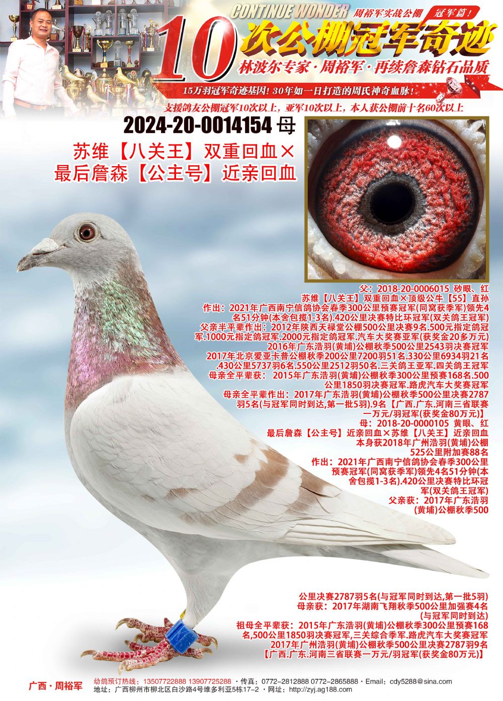 2021年广西南宁信鸽协会春季300公里预赛冠军(同窝获季军)领先4名51分钟(本舍包揽1-3名)、420公里决赛特比环冠军(双关鸽王冠军)