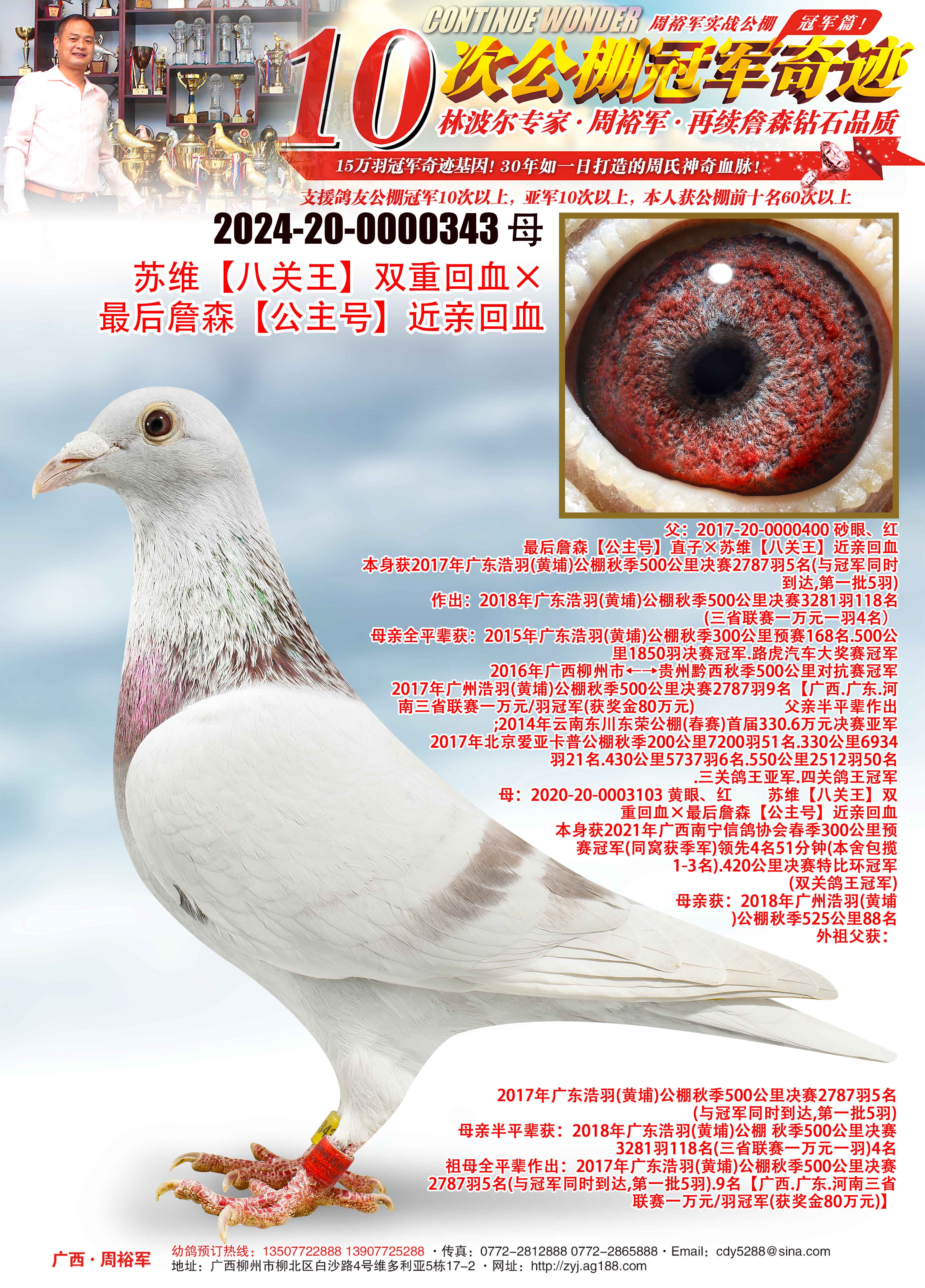 本身获2021年广西南宁信鸽协会春季300公里预赛冠军(同窝获季军)领先4名51分钟(本舍包揽1-3名)、420公里决赛特比环冠军(双关鸽王冠军)