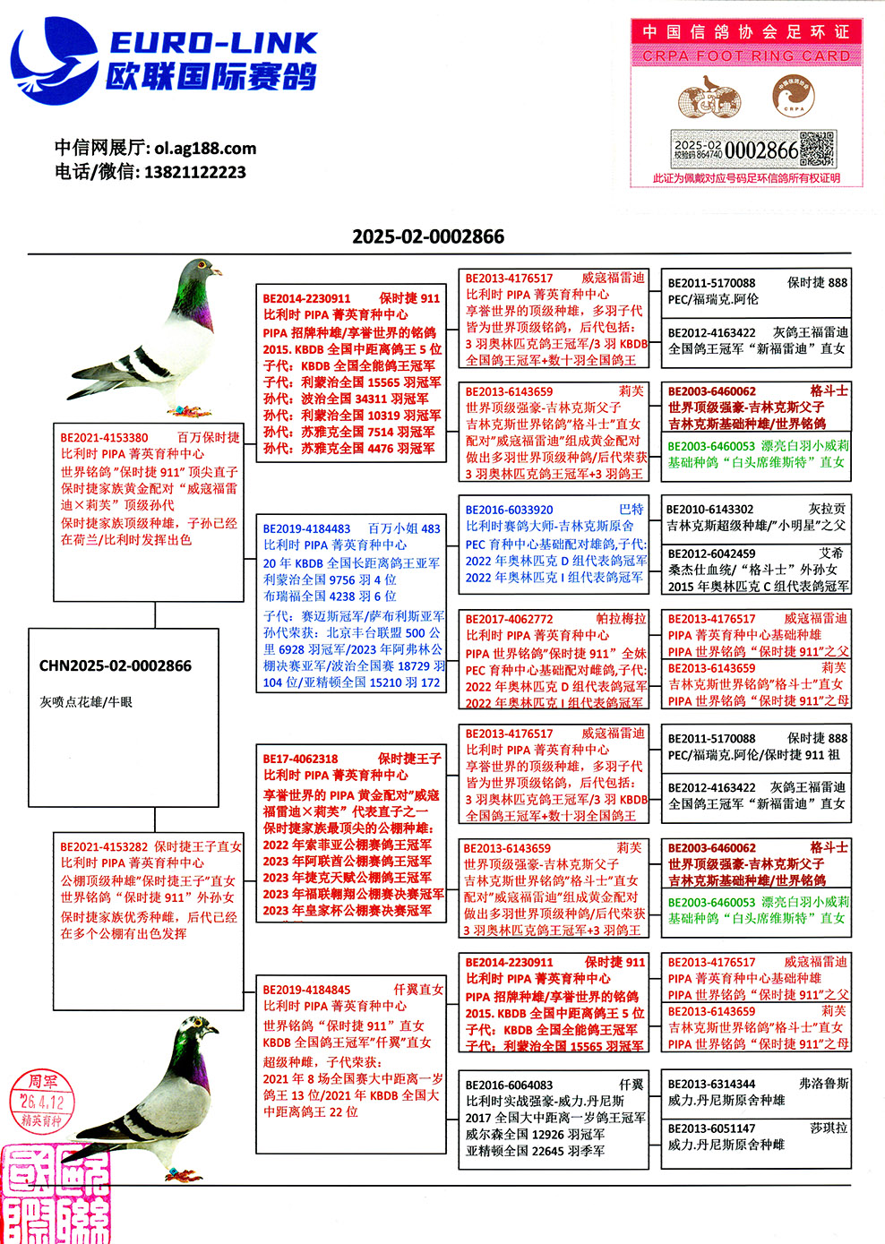 | 1660380 | 世界铭鸽“最佳基特尔”近亲直孙 | ¥15300元 | 24次 |