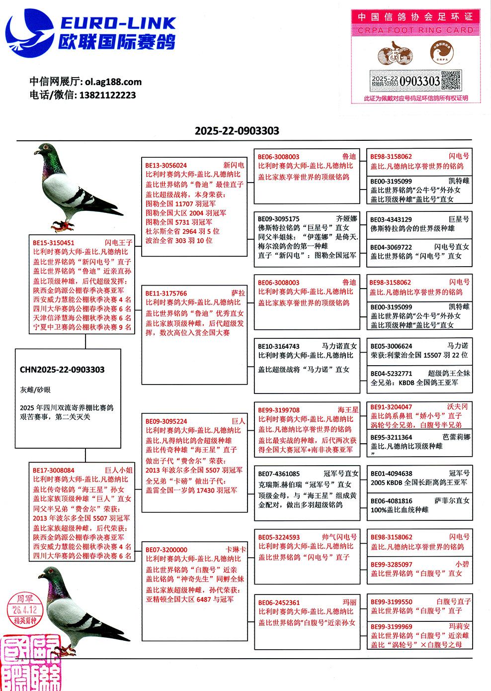 | 1660380 | 世界铭鸽“最佳基特尔”近亲直孙 | ¥15300元 | 24次 |