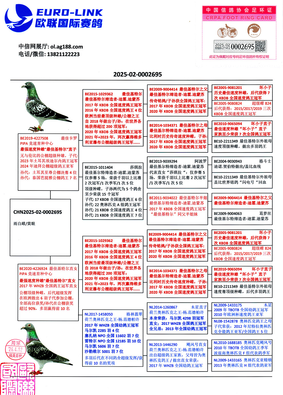 - 当前查看拍卖鸽:世界铭鸽“最佳基特尔”近亲直孙