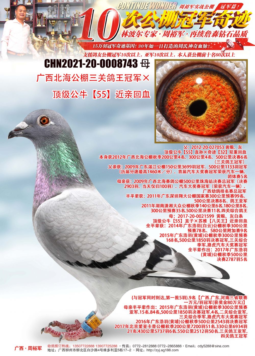 • 血统:广西北海公棚三关鸽王冠军×顶级公牛“55”近亲回血