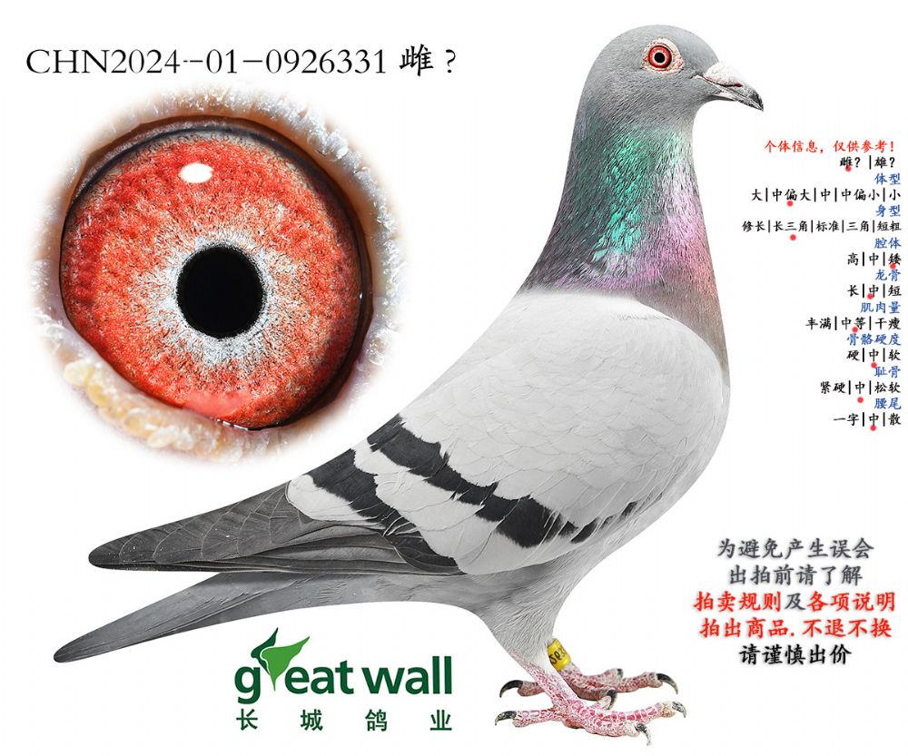 因拍卖鸽均是未做育过的种鸽或幼鸽,图内所标雌雄仅供参考,实际性别已实物为准。不做退换理由。