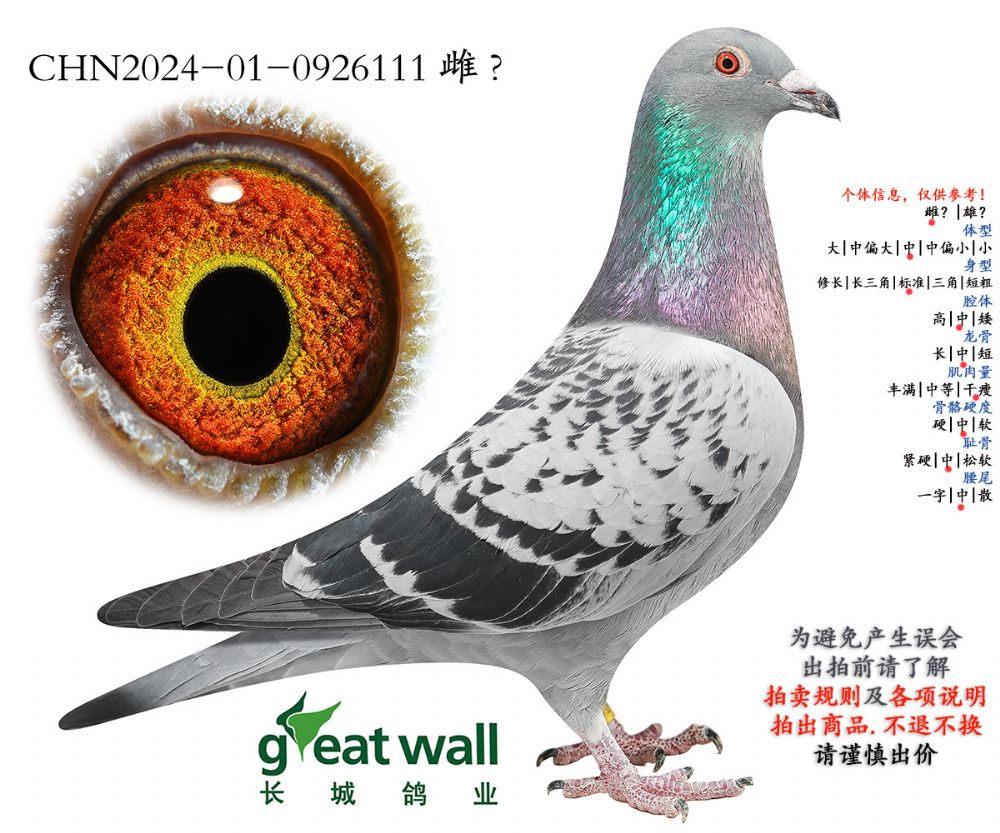 因拍卖鸽均是未做育过的种鸽或幼鸽,图内所标雌雄仅供参考,实际性别已实物为准。不做退换理由。