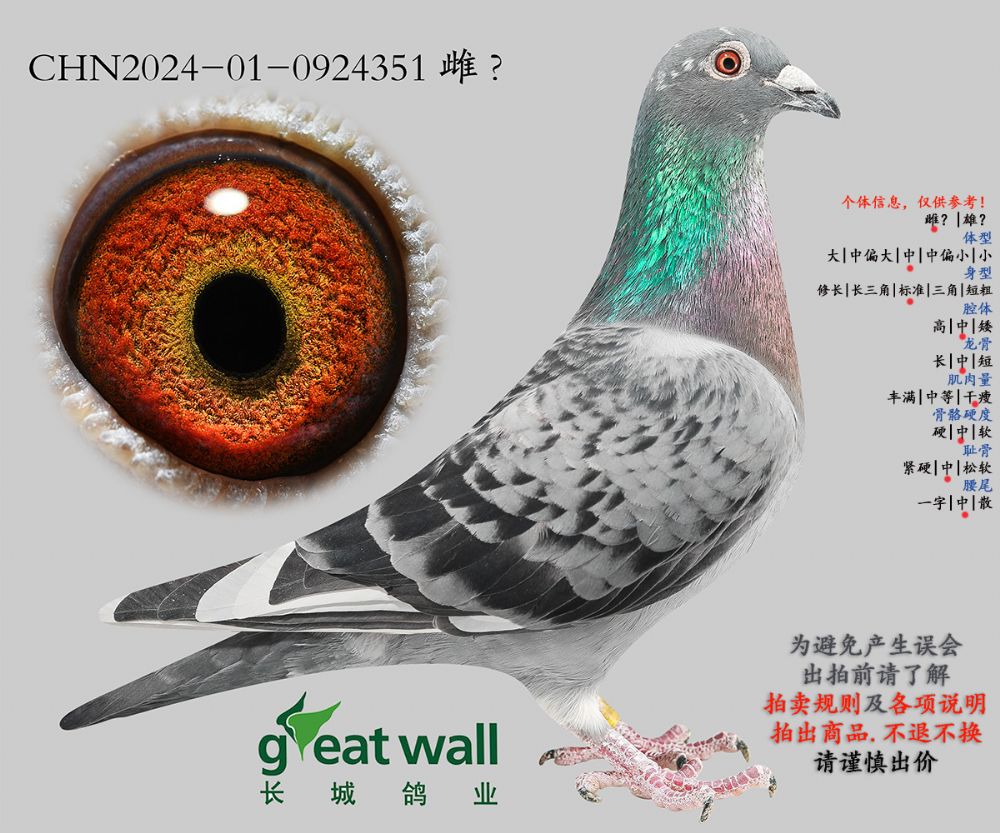 因拍卖鸽均是未做育过的种鸽或幼鸽,图内所标雌雄仅供参考,实际性别已实物为准。不做退换理由。