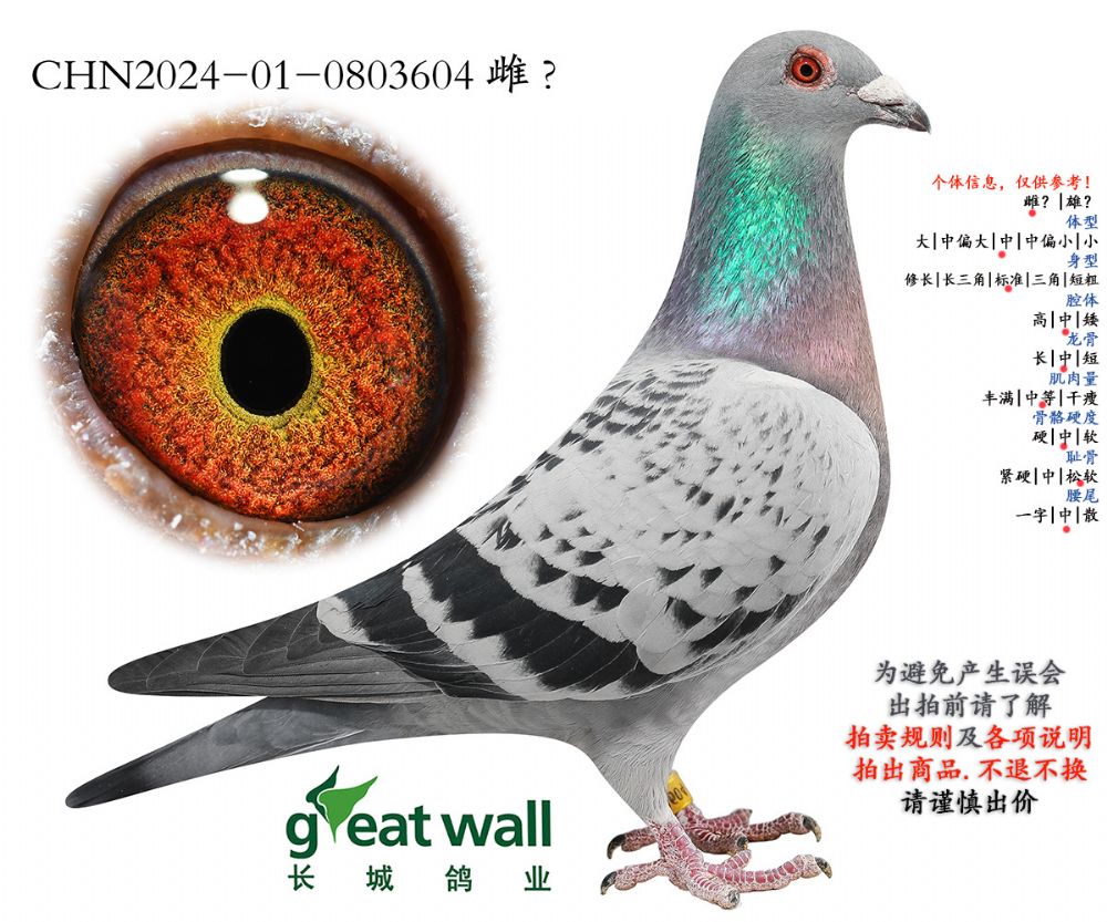 因拍卖鸽均是未做育过的种鸽或幼鸽,图内所标雌雄仅供参考,实际性别已实物为准。不做退换理由。