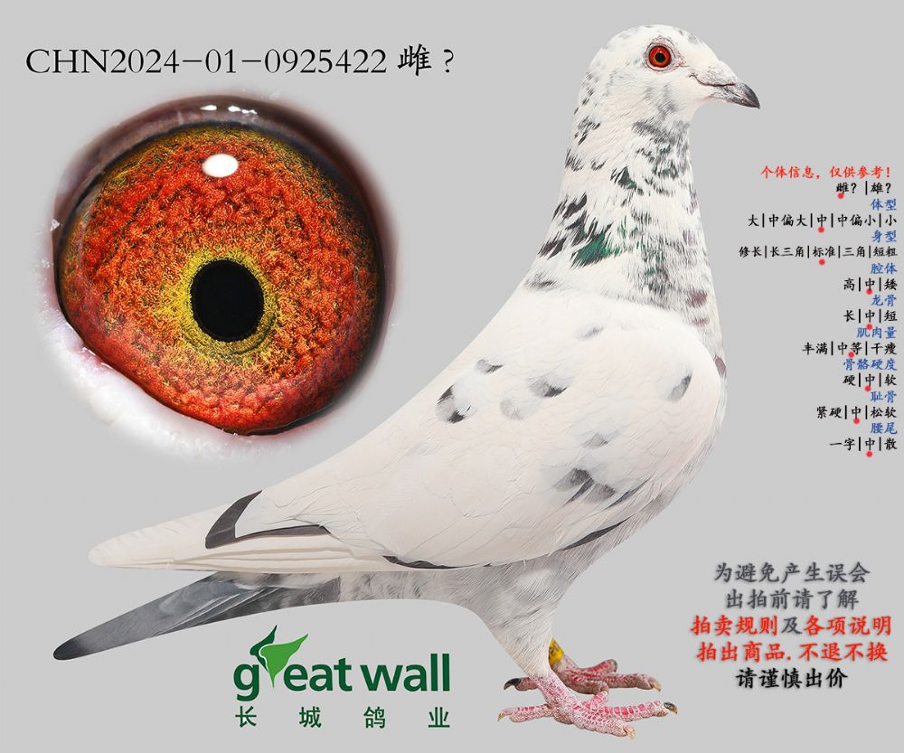 因拍卖鸽均是未做育过的种鸽或幼鸽,图内所标雌雄仅供参考,实际性别已实物为准。不做退换理由。