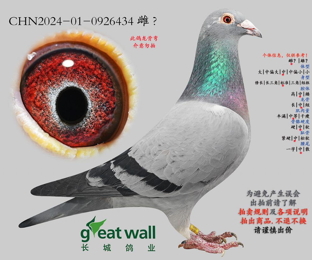 因拍卖鸽均是未做育过的种鸽或幼鸽,图内所标雌雄仅供参考,实际性别已实物为准。不做退换理由。