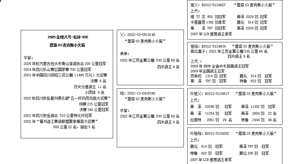 三关鸽王冠军,四关鸽王亚军,二关鸽王亚军,精英赛6名,500公里决赛9名,560公里加站赛3名,560公里排名赛6名(乔 花 飞奴)