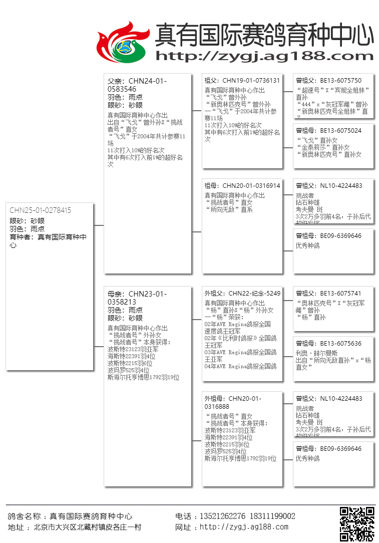 【在这三座金矿还未被世人发现之前,真有国际就第一时间把高品质的鸽子带到了国内,取得了空前的发挥。近几年大家才逐渐认识这几位大师鸽子的魅力。请记住!当任何商业鸽舍进入炒作后期的时候,他的鸽子质量与价值都会急剧下降,即便是詹森兄弟也难免于此。所以引进这家鸽舍最巅峰时期的鸽子,得以延续,才是真有国际成功的致胜法宝。】