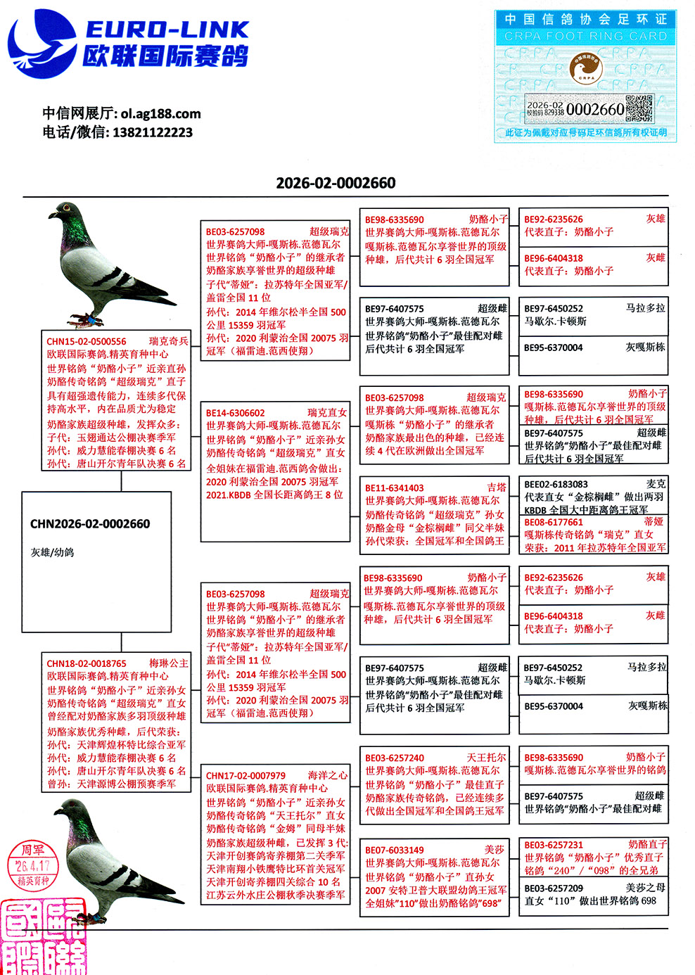 | 1660759 | 世界铭鸽“最佳基特尔”孙女 | ¥3300元 | 2次 |