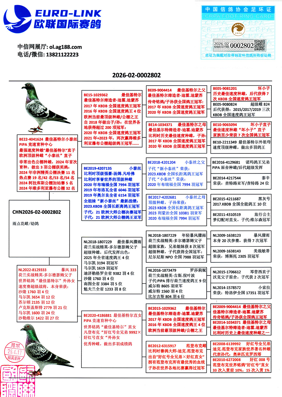 | 1660760 | 世界铭鸽“最佳基特尔”直孙 | ¥5100元 | 4次 |