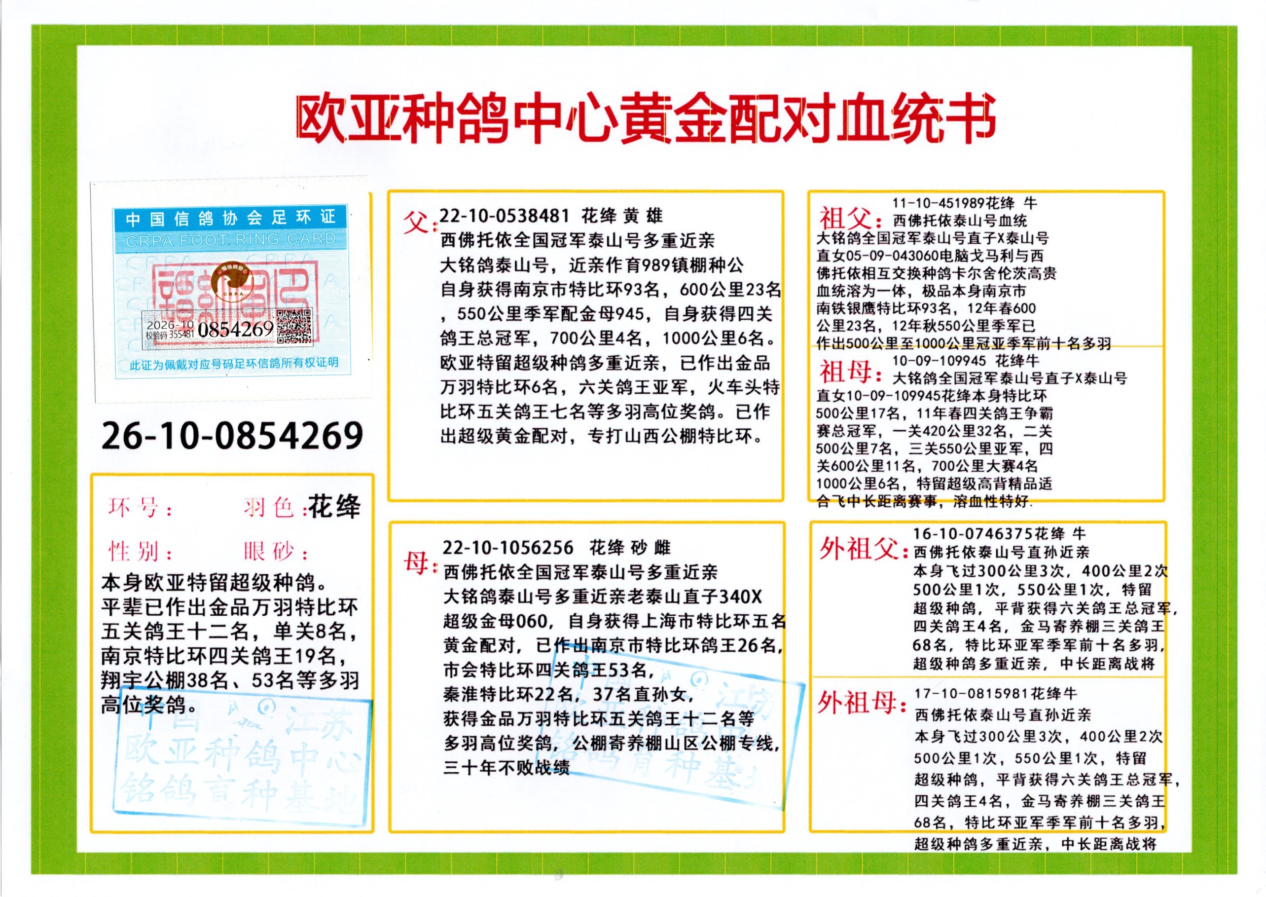 24年秋南京特比环欧亚荣获大团体冠军.小团体冠军551公里大特比13名.14名.16名.19名.20名.21名.24名.26名.27名.28名.42名.52名.54名.57名.65名.66名.68名.70名.71名.72名.74名.76名.80名.82名.83名.84名.85名.86名.90名.92名.110名.116名.121名.122名.128名.131名.158名.161名.164名.165名.166名.172名.174名.177名.182名.195名.196名.201名.205名.208名.210名.216名.253名.269名.275名.276名.294名.296名.299名,,24年秋云南天南铜都公棚决赛415名.天南铜都小棚决赛409名.云南玉活公棚决赛102名.490名.团体32名上笼二羽进二羽,天南铜都大棚506公里决赛445名。热烈祝贺河北省巨鹿县李兰生老师用欧亚泰山号血系连续十一年夺冠军,河北省国家赛冠军.全国季军等多次前十名高位,扬州王军王总用欧亚利奥24年春季获山东翔宇公棚决赛33名盖比53名。南京刘正龙刘总用欧亚盖比获得24年秋山东潍坊国际公棚决赛42名.精英赛30名.三关鸽王71名.决赛86名.加站赛16名.南京市特比环A组鸽王9名.B组鸽王5名.6名.C组鸽王5名.精英赛冠军4名.技能赛A组冠军4名.5名.秦淮区特比环荣获15名.46名.48名.87名。四川西昌徐亮徐总用欧亚利奥获得凉山州聚友决赛177名.第二关亚军双关鸽王19名.三关鸽王105名.云南豪庭公棚决赛603名。热烈祝贺24年四川重庆翔园鸽舍用欧亚泰山号荣获春季400公里冠军.秋季500公里冠军,河北王总用詹森X利奥获得千羽千翔公棚400公里冠军,广东蔡楷焕荣获24年秋爱好者 赛鸽俱乐部三关鸽王季军.一关420公里99名.二关450公里11名.三关520公里32名.单关季军.7名.12名,江西李卫兴荣获贵州红枫公棚8名.共翔俱乐部寄养棚四关综合鸽王30名.一关400公里78名.二关500公里55名.三关520公里37名.四关500公里57名.同父母获公棚18名.雷鸣获得武汉黄浦育翔中心冠军,四川陈文获得四川明鸿俱乐部300公里梦幻2名.3名.4名.9名.10名.13名.14名.15名.31名.34名.40名.41名.42名.43名.69名.71名.72名.73名.74名.94名.95名.97名.98名.99名.419公里决赛荣获总冠军7名.总共归巢9羽,四川徐亮获豪庭决赛603名,山西郑勇获得山西泰鑫公棚决赛255名詹森红狐,热烈祝贺马总获得开尔(飞跃队)决赛9名获奖金1310000万元.第一关52名,天津津福资赛180公里96名.获奖金429543万元,欧亚支持全国鸽友24年秋多人报喜 祝大家取得更好成绩,给欧亚报喜鸽友欧亚决定给每人赠送一羽超级种鸽。欧亚俱乐部特比环多关鸽王成绩:15年秋淮安特比环黑色星期一全会上笼9700多羽,当天无鸽归巢,第二天全会归巢357羽,本舍归巢158羽.前十名八羽.前一百名归巢57羽,16年春季获五关鸽王总冠军,总亚军四名.六名.七名.九名.十名.晶艺俱乐部520公里冠亚季军5名.6名.7名.9名.11名等,火车头冠军.季军6名.8名.9名.10名,16年秋晶艺俱乐部特比环520公里亚军.季军4名.6名.7名.9名,15年春南京白下特比环冠军.亚军.季军6名.7名.8名.9名.10名.指定鸽A B组获得冠军.亚军.季军4名.5名.,17年淮安特比环亚军.4名.5名.7名.8名.10名.六关鸽王总冠军.4名.6名.9名.10名,寄养棚宿迁刘总20羽特比环获冠军.季军.4名.7名.8名.9名等。18年荣获万羽特比环六关鸽王总冠军.总亚军.总季军.6名.8名.十名.单关四羽冠军.二羽亚军.四羽季军.前十名27羽。19年秋万羽特比环六关鸽王总亚军.总季军.5名.8名等,单关二羽冠军.三羽亚军.一羽季军前十名31羽。20年秋淮安市鸽会四关特比环大赛风雨无阻鸽王亚军.鸽王六名,金品俱乐部万羽特比环六关鸽王总冠军,总亚军.四名.五名.六名.七名.八名.十名.前二百名鸽王35羽,单关冠亚季军前十名四十多羽,火车头五关鸽王季军.六名.八名.前二百名鸽王十七羽。20年春荣获淮安五区一市四关鸽王总冠军.亚军.四名.八名.九名。21年秋荣获金品万羽特比环大赛六关鸽王总亚军.总季军.四名.七名.九名.十名.单关冠亚军季军前十名三十多羽。火车头协会鸽王六名.七名.十名.单关前十名十七羽。22年秋荣获鸽王总冠军.总亚军.5名.7名.8名.9名.11名.单关冠亚季军前十名三十多羽,第一关单关前二百名四十多羽,第二关前二百名三十多羽,第三关前二百名四十多羽,第四关前二百名四十多羽,第五关前一百名53羽。23年秋荣获鸽王季军.五名.八名.十名.13名.17名.20名.27名等多羽鸽王.单关前十名二十多羽。公棚.寄养棚部分成绩:16年秋宁夏黄河公棚总冠军电脑戈马力指定通炮冠军,17年送八羽参赛获得鸽王八名进奖四名,支持韩总荣获八名。支持鸽友荣获宁夏中卫公棚决赛总冠军.精英赛冠军,支持18年宁夏黄河公棚决赛冠军詹森X泰山。安徽鼎博寄养棚院内外四关鸽王总冠军.鸽王十七名.三十七名同窝,鸽王39名.42名.58名.67名。18年山东公棚预赛冠军.决赛65名.送八羽进奖五羽.指定获奔驰汽车一辆。支持鸽友获得云南蓝云公棚冠军.盖比X佛卡门。支持鸽友荣获云南银集公棚决赛冠军 詹森427X520血系 速度赛6700羽冠军。17年荣获金马俱乐部寄养棚四关鸽王总冠军.季军.六名.八名.第一关冠军.亚军.季军四名.七名.十一名.金牌教练奖。支持鸽友18年北京费翔公棚预赛九名电脑X桑杰士,支持鸽友荣获陕西威力公棚决赛11名.内蒙古临河寄养棚四关鸽王六名.詹森配泰山,支持河北王总用欧亚詹森427配胡本喜获20年秋开尔青年棚季军。云南东荣公棚16年预赛冠军.决赛77名.17年决赛12名.詹森红狐X泰山,17年平安公棚决赛4名 詹森427。欧亚获得21年金母寄养棚第一关四名.第二关5名.第三关5名.6名.7名.10名.三关鸽王总冠军,四关鸽王14名.十羽鸽王。支持河