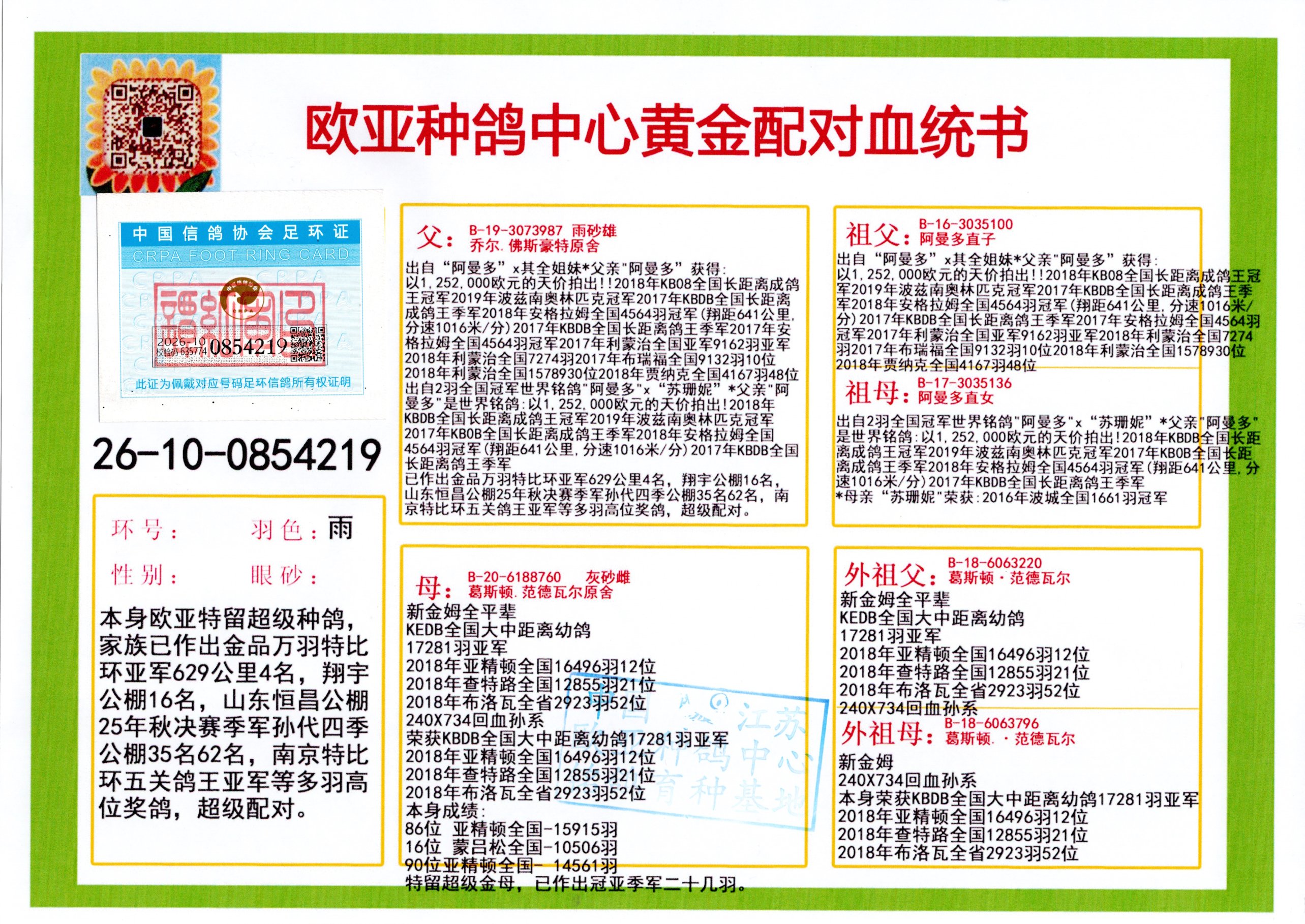 24年秋南京特比环欧亚荣获大团体冠军.小团体冠军551公里大特比13名.14名.16名.19名.20名.21名.24名.26名.27名.28名.42名.52名.54名.57名.65名.66名.68名.70名.71名.72名.74名.76名.80名.82名.83名.84名.85名.86名.90名.92名.110名.116名.121名.122名.128名.131名.158名.161名.164名.165名.166名.172名.174名.177名.182名.195名.196名.201名.205名.208名.210名.216名.253名.269名.275名.276名.294名.296名.299名,,24年秋云南天南铜都公棚决赛415名.天南铜都小棚决赛409名.云南玉活公棚决赛102名.490名.团体32名上笼二羽进二羽,天南铜都大棚506公里决赛445名。热烈祝贺河北省巨鹿县李兰生老师用欧亚泰山号血系连续十一年夺冠军,河北省国家赛冠军.全国季军等多次前十名高位,扬州王军王总用欧亚利奥24年春季获山东翔宇公棚决赛33名盖比53名。南京刘正龙刘总用欧亚盖比获得24年秋山东潍坊国际公棚决赛42名.精英赛30名.三关鸽王71名.决赛86名.加站赛16名.南京市特比环A组鸽王9名.B组鸽王5名.6名.C组鸽王5名.精英赛冠军4名.技能赛A组冠军4名.5名.秦淮区特比环荣获15名.46名.48名.87名。四川西昌徐亮徐总用欧亚利奥获得凉山州聚友决赛177名.第二关亚军双关鸽王19名.三关鸽王105名.云南豪庭公棚决赛603名。热烈祝贺24年四川重庆翔园鸽舍用欧亚泰山号荣获春季400公里冠军.秋季500公里冠军,河北王总用詹森X利奥获得千羽千翔公棚400公里冠军,广东蔡楷焕荣获24年秋爱好者 赛鸽俱乐部三关鸽王季军.一关420公里99名.二关450公里11名.三关520公里32名.单关季军.7名.12名,江西李卫兴荣获贵州红枫公棚8名.共翔俱乐部寄养棚四关综合鸽王30名.一关400公里78名.二关500公里55名.三关520公里37名.四关500公里57名.同父母获公棚18名.雷鸣获得武汉黄浦育翔中心冠军,四川陈文获得四川明鸿俱乐部300公里梦幻2名.3名.4名.9名.10名.13名.14名.15名.31名.34名.40名.41名.42名.43名.69名.71名.72名.73名.74名.94名.95名.97名.98名.99名.419公里决赛荣获总冠军7名.总共归巢9羽,四川徐亮获豪庭决赛603名,山西郑勇获得山西泰鑫公棚决赛255名詹森红狐,热烈祝贺马总获得开尔(飞跃队)决赛9名获奖金1310000万元.第一关52名,天津津福资赛180公里96名.获奖金429543万元,欧亚支持全国鸽友24年秋多人报喜 祝大家取得更好成绩,给欧亚报喜鸽友欧亚决定给每人赠送一羽超级种鸽。欧亚俱乐部特比环多关鸽王成绩:15年秋淮安特比环黑色星期一全会上笼9700多羽,当天无鸽归巢,第二天全会归巢357羽,本舍归巢158羽.前十名八羽.前一百名归巢57羽,16年春季获五关鸽王总冠军,总亚军四名.六名.七名.九名.十名.晶艺俱乐部520公里冠亚季军5名.6名.7名.9名.11名等,火车头冠军.季军6名.8名.9名.10名,16年秋晶艺俱乐部特比环520公里亚军.季军4名.6名.7名.9名,15年春南京白下特比环冠军.亚军.季军6名.7名.8名.9名.10名.指定鸽A B组获得冠军.亚军.季军4名.5名.,17年淮安特比环亚军.4名.5名.7名.8名.10名.六关鸽王总冠军.4名.6名.9名.10名,寄养棚宿迁刘总20羽特比环获冠军.季军.4名.7名.8名.9名等。18年荣获万羽特比环六关鸽王总冠军.总亚军.总季军.6名.8名.十名.单关四羽冠军.二羽亚军.四羽季军.前十名27羽。19年秋万羽特比环六关鸽王总亚军.总季军.5名.8名等,单关二羽冠军.三羽亚军.一羽季军前十名31羽。20年秋淮安市鸽会四关特比环大赛风雨无阻鸽王亚军.鸽王六名,金品俱乐部万羽特比环六关鸽王总冠军,总亚军.四名.五名.六名.七名.八名.十名.前二百名鸽王35羽,单关冠亚季军前十名四十多羽,火车头五关鸽王季军.六名.八名.前二百名鸽王十七羽。20年春荣获淮安五区一市四关鸽王总冠军.亚军.四名.八名.九名。21年秋荣获金品万羽特比环大赛六关鸽王总亚军.总季军.四名.七名.九名.十名.单关冠亚军季军前十名三十多羽。火车头协会鸽王六名.七名.十名.单关前十名十七羽。22年秋荣获鸽王总冠军.总亚军.5名.7名.8名.9名.11名.单关冠亚季军前十名三十多羽,第一关单关前二百名四十多羽,第二关前二百名三十多羽,第三关前二百名四十多羽,第四关前二百名四十多羽,第五关前一百名53羽。23年秋荣获鸽王季军.五名.八名.十名.13名.17名.20名.27名等多羽鸽王.单关前十名二十多羽。公棚.寄养棚部分成绩:16年秋宁夏黄河公棚总冠军电脑戈马力指定通炮冠军,17年送八羽参赛获得鸽王八名进奖四名,支持韩总荣获八名。支持鸽友荣获宁夏中卫公棚决赛总冠军.精英赛冠军,支持18年宁夏黄河公棚决赛冠军詹森X泰山。安徽鼎博寄养棚院内外四关鸽王总冠军.鸽王十七名.三十七名同窝,鸽王39名.42名.58名.67名。18年山东公棚预赛冠军.决赛65名.送八羽进奖五羽.指定获奔驰汽车一辆。支持鸽友获得云南蓝云公棚冠军.盖比X佛卡门。支持鸽友荣获云南银集公棚决赛冠军 詹森427X520血系 速度赛6700羽冠军。17年荣获金马俱乐部寄养棚四关鸽王总冠军.季军.六名.八名.第一关冠军.亚军.季军四名.七名.十一名.金牌教练奖。支持鸽友18年北京费翔公棚预赛九名电脑X桑杰士,支持鸽友荣获陕西威力公棚决赛11名.内蒙古临河寄养棚四关鸽王六名.詹森配泰山,支持河北王总用欧亚詹森427配胡本喜获20年秋开尔青年棚季军。云南东荣公棚16年预赛冠军.决赛77名.17年决赛12名.詹森红狐X泰山,17年平安公棚决赛4名 詹森427。欧亚获得21年金母寄养棚第一关四名.第二关5名.第三关5名.6名.7名.10名.三关鸽王总冠军,四关鸽王14名.十羽鸽王。支持河