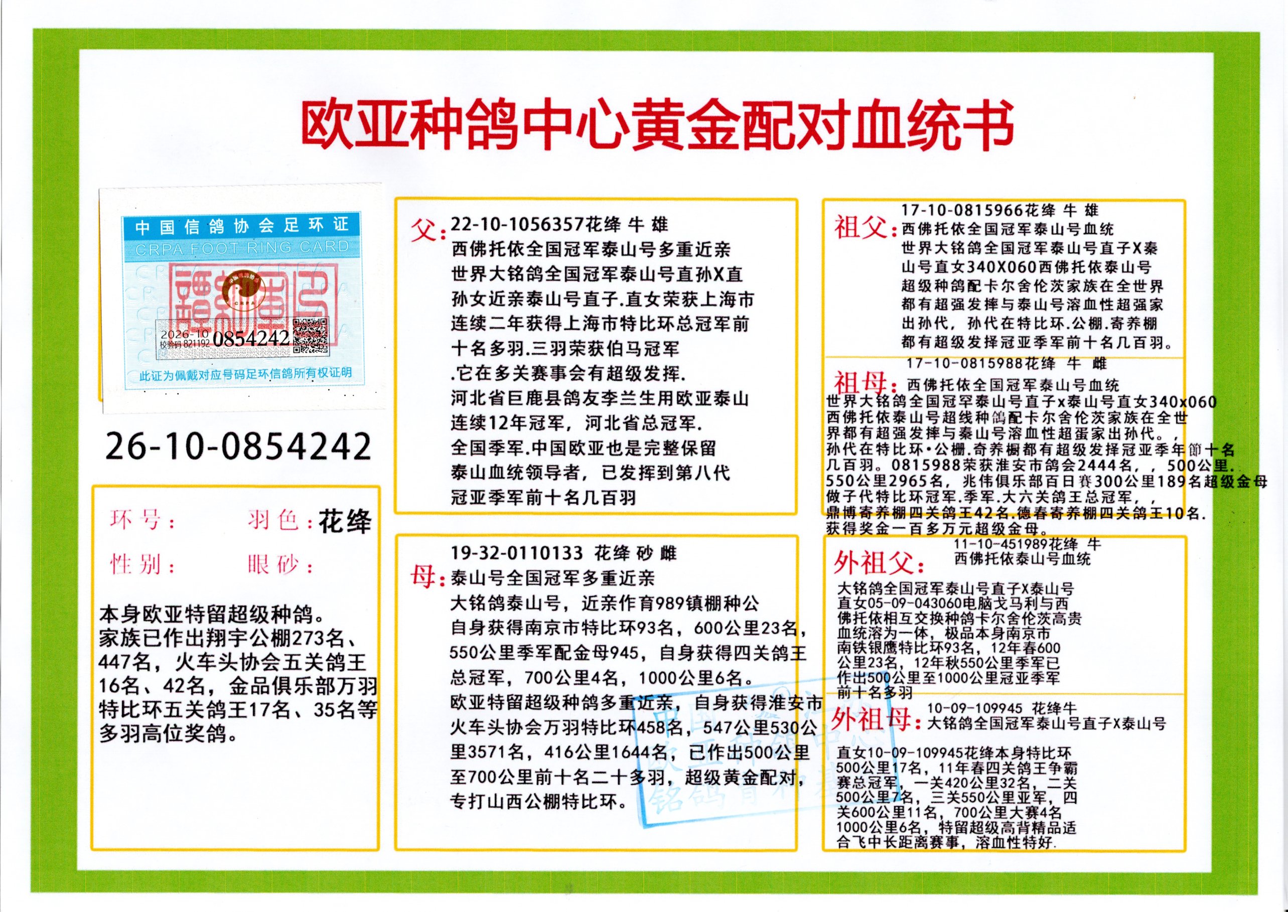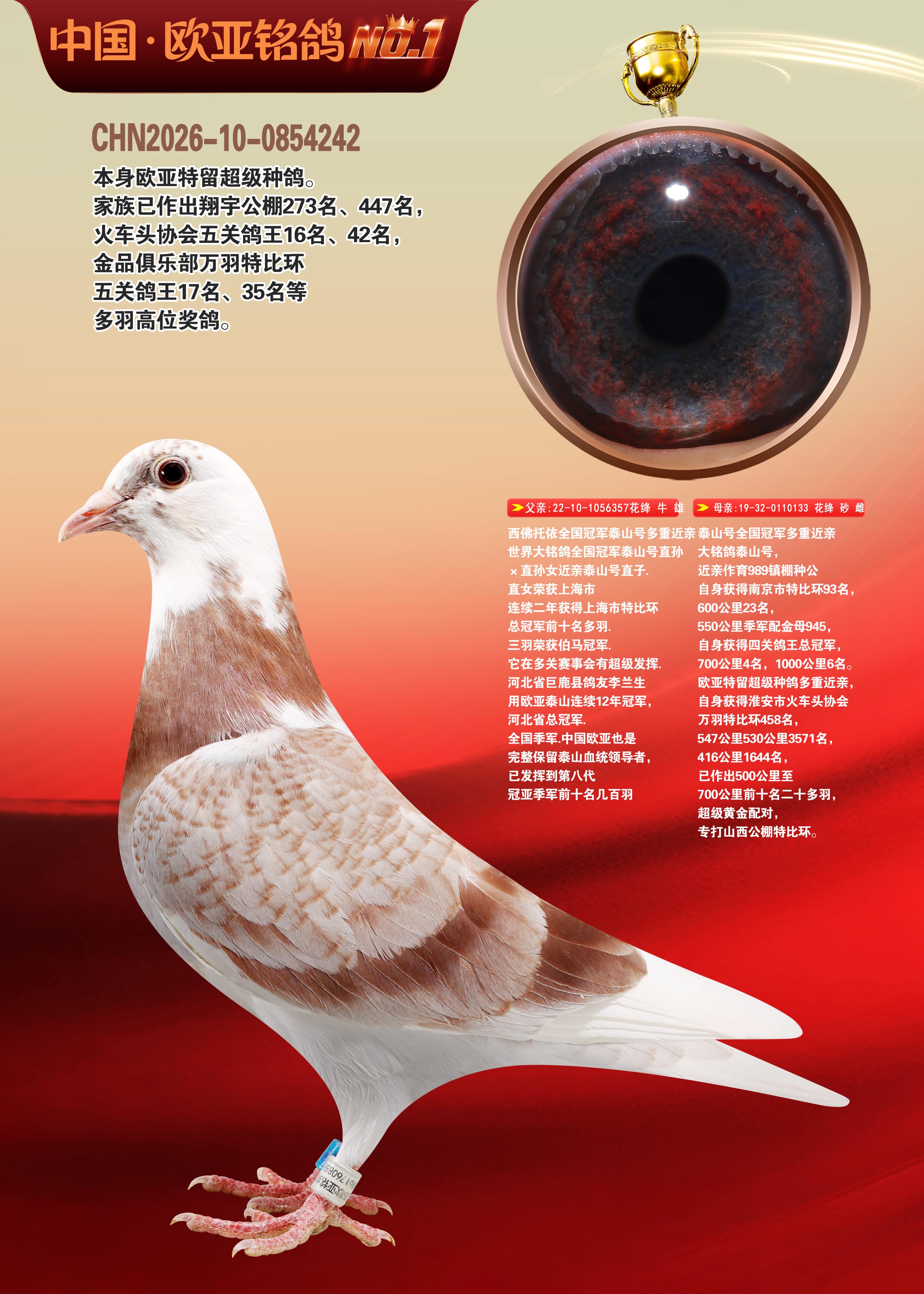 24年秋南京特比环欧亚荣获大团体冠军.小团体冠军551公里大特比13名.14名.16名.19名.20名.21名.24名.26名.27名.28名.42名.52名.54名.57名.65名.66名.68名.70名.71名.72名.74名.76名.80名.82名.83名.84名.85名.86名.90名.92名.110名.116名.121名.122名.128名.131名.158名.161名.164名.165名.166名.172名.174名.177名.182名.195名.196名.201名.205名.208名.210名.216名.253名.269名.275名.276名.294名.296名.299名,,24年秋云南天南铜都公棚决赛415名.天南铜都小棚决赛409名.云南玉活公棚决赛102名.490名.团体32名上笼二羽进二羽,天南铜都大棚506公里决赛445名。热烈祝贺河北省巨鹿县李兰生老师用欧亚泰山号血系连续十一年夺冠军,河北省国家赛冠军.全国季军等多次前十名高位,扬州王军王总用欧亚利奥24年春季获山东翔宇公棚决赛33名盖比53名。南京刘正龙刘总用欧亚盖比获得24年秋山东潍坊国际公棚决赛42名.精英赛30名.三关鸽王71名.决赛86名.加站赛16名.南京市特比环A组鸽王9名.B组鸽王5名.6名.C组鸽王5名.精英赛冠军4名.技能赛A组冠军4名.5名.秦淮区特比环荣获15名.46名.48名.87名。四川西昌徐亮徐总用欧亚利奥获得凉山州聚友决赛177名.第二关亚军双关鸽王19名.三关鸽王105名.云南豪庭公棚决赛603名。热烈祝贺24年四川重庆翔园鸽舍用欧亚泰山号荣获春季400公里冠军.秋季500公里冠军,河北王总用詹森X利奥获得千羽千翔公棚400公里冠军,广东蔡楷焕荣获24年秋爱好者 赛鸽俱乐部三关鸽王季军.一关420公里99名.二关450公里11名.三关520公里32名.单关季军.7名.12名,江西李卫兴荣获贵州红枫公棚8名.共翔俱乐部寄养棚四关综合鸽王30名.一关400公里78名.二关500公里55名.三关520公里37名.四关500公里57名.同父母获公棚18名.雷鸣获得武汉黄浦育翔中心冠军,四川陈文获得四川明鸿俱乐部300公里梦幻2名.3名.4名.9名.10名.13名.14名.15名.31名.34名.40名.41名.42名.43名.69名.71名.72名.73名.74名.94名.95名.97名.98名.99名.419公里决赛荣获总冠军7名.总共归巢9羽,四川徐亮获豪庭决赛603名,山西郑勇获得山西泰鑫公棚决赛255名詹森红狐,热烈祝贺马总获得开尔(飞跃队)决赛9名获奖金1310000万元.第一关52名,天津津福资赛180公里96名.获奖金429543万元,欧亚支持全国鸽友24年秋多人报喜 祝大家取得更好成绩,给欧亚报喜鸽友欧亚决定给每人赠送一羽超级种鸽。欧亚俱乐部特比环多关鸽王成绩:15年秋淮安特比环黑色星期一全会上笼9700多羽,当天无鸽归巢,第二天全会归巢357羽,本舍归巢158羽.前十名八羽.前一百名归巢57羽,16年春季获五关鸽王总冠军,总亚军四名.六名.七名.九名.十名.晶艺俱乐部520公里冠亚季军5名.6名.7名.9名.11名等,火车头冠军.季军6名.8名.9名.10名,16年秋晶艺俱乐部特比环520公里亚军.季军4名.6名.7名.9名,15年春南京白下特比环冠军.亚军.季军6名.7名.8名.9名.10名.指定鸽A B组获得冠军.亚军.季军4名.5名.,17年淮安特比环亚军.4名.5名.7名.8名.10名.六关鸽王总冠军.4名.6名.9名.10名,寄养棚宿迁刘总20羽特比环获冠军.季军.4名.7名.8名.9名等。18年荣获万羽特比环六关鸽王总冠军.总亚军.总季军.6名.8名.十名.单关四羽冠军.二羽亚军.四羽季军.前十名27羽。19年秋万羽特比环六关鸽王总亚军.总季军.5名.8名等,单关二羽冠军.三羽亚军.一羽季军前十名31羽。20年秋淮安市鸽会四关特比环大赛风雨无阻鸽王亚军.鸽王六名,金品俱乐部万羽特比环六关鸽王总冠军,总亚军.四名.五名.六名.七名.八名.十名.前二百名鸽王35羽,单关冠亚季军前十名四十多羽,火车头五关鸽王季军.六名.八名.前二百名鸽王十七羽。20年春荣获淮安五区一市四关鸽王总冠军.亚军.四名.八名.九名。21年秋荣获金品万羽特比环大赛六关鸽王总亚军.总季军.四名.七名.九名.十名.单关冠亚军季军前十名三十多羽。火车头协会鸽王六名.七名.十名.单关前十名十七羽。22年秋荣获鸽王总冠军.总亚军.5名.7名.8名.9名.11名.单关冠亚季军前十名三十多羽,第一关单关前二百名四十多羽,第二关前二百名三十多羽,第三关前二百名四十多羽,第四关前二百名四十多羽,第五关前一百名53羽。23年秋荣获鸽王季军.五名.八名.十名.13名.17名.20名.27名等多羽鸽王.单关前十名二十多羽。公棚.寄养棚部分成绩:16年秋宁夏黄河公棚总冠军电脑戈马力指定通炮冠军,17年送八羽参赛获得鸽王八名进奖四名,支持韩总荣获八名。支持鸽友荣获宁夏中卫公棚决赛总冠军.精英赛冠军,支持18年宁夏黄河公棚决赛冠军詹森X泰山。安徽鼎博寄养棚院内外四关鸽王总冠军.鸽王十七名.三十七名同窝,鸽王39名.42名.58名.67名。18年山东公棚预赛冠军.决赛65名.送八羽进奖五羽.指定获奔驰汽车一辆。支持鸽友获得云南蓝云公棚冠军.盖比X佛卡门。支持鸽友荣获云南银集公棚决赛冠军 詹森427X520血系 速度赛6700羽冠军。17年荣获金马俱乐部寄养棚四关鸽王总冠军.季军.六名.八名.第一关冠军.亚军.季军四名.七名.十一名.金牌教练奖。支持鸽友18年北京费翔公棚预赛九名电脑X桑杰士,支持鸽友荣获陕西威力公棚决赛11名.内蒙古临河寄养棚四关鸽王六名.詹森配泰山,支持河北王总用欧亚詹森427配胡本喜获20年秋开尔青年棚季军。云南东荣公棚16年预赛冠军.决赛77名.17年决赛12名.詹森红狐X泰山,17年平安公棚决赛4名 詹森427。欧亚获得21年金母寄养棚第一关四名.第二关5名.第三关5名.6名.7名.10名.三关鸽王总冠军,四关鸽王14名.十羽鸽王。支持河