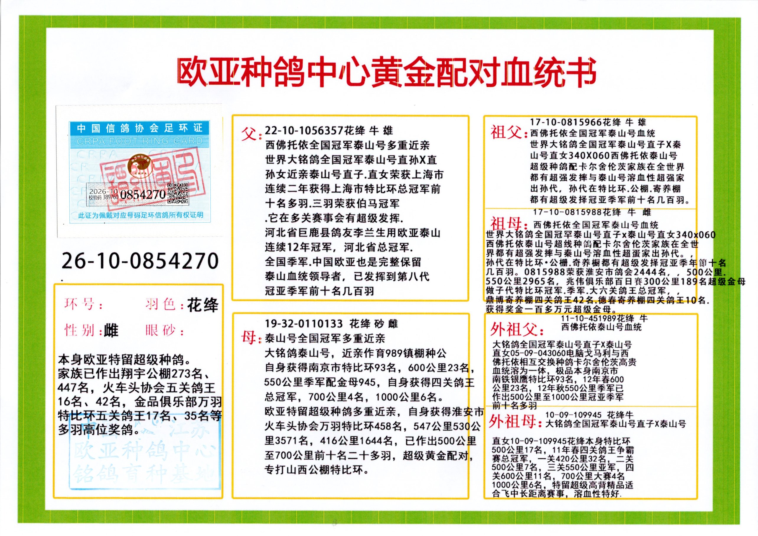 24年秋南京特比环欧亚荣获大团体冠军.小团体冠军551公里大特比13名.14名.16名.19名.20名.21名.24名.26名.27名.28名.42名.52名.54名.57名.65名.66名.68名.70名.71名.72名.74名.76名.80名.82名.83名.84名.85名.86名.90名.92名.110名.116名.121名.122名.128名.131名.158名.161名.164名.165名.166名.172名.174名.177名.182名.195名.196名.201名.205名.208名.210名.216名.253名.269名.275名.276名.294名.296名.299名,,24年秋云南天南铜都公棚决赛415名.天南铜都小棚决赛409名.云南玉活公棚决赛102名.490名.团体32名上笼二羽进二羽,天南铜都大棚506公里决赛445名。热烈祝贺河北省巨鹿县李兰生老师用欧亚泰山号血系连续十一年夺冠军,河北省国家赛冠军.全国季军等多次前十名高位,扬州王军王总用欧亚利奥24年春季获山东翔宇公棚决赛33名盖比53名。南京刘正龙刘总用欧亚盖比获得24年秋山东潍坊国际公棚决赛42名.精英赛30名.三关鸽王71名.决赛86名.加站赛16名.南京市特比环A组鸽王9名.B组鸽王5名.6名.C组鸽王5名.精英赛冠军4名.技能赛A组冠军4名.5名.秦淮区特比环荣获15名.46名.48名.87名。四川西昌徐亮徐总用欧亚利奥获得凉山州聚友决赛177名.第二关亚军双关鸽王19名.三关鸽王105名.云南豪庭公棚决赛603名。热烈祝贺24年四川重庆翔园鸽舍用欧亚泰山号荣获春季400公里冠军.秋季500公里冠军,河北王总用詹森X利奥获得千羽千翔公棚400公里冠军,广东蔡楷焕荣获24年秋爱好者 赛鸽俱乐部三关鸽王季军.一关420公里99名.二关450公里11名.三关520公里32名.单关季军.7名.12名,江西李卫兴荣获贵州红枫公棚8名.共翔俱乐部寄养棚四关综合鸽王30名.一关400公里78名.二关500公里55名.三关520公里37名.四关500公里57名.同父母获公棚18名.雷鸣获得武汉黄浦育翔中心冠军,四川陈文获得四川明鸿俱乐部300公里梦幻2名.3名.4名.9名.10名.13名.14名.15名.31名.34名.40名.41名.42名.43名.69名.71名.72名.73名.74名.94名.95名.97名.98名.99名.419公里决赛荣获总冠军7名.总共归巢9羽,四川徐亮获豪庭决赛603名,山西郑勇获得山西泰鑫公棚决赛255名詹森红狐,热烈祝贺马总获得开尔(飞跃队)决赛9名获奖金1310000万元.第一关52名,天津津福资赛180公里96名.获奖金429543万元,欧亚支持全国鸽友24年秋多人报喜 祝大家取得更好成绩,给欧亚报喜鸽友欧亚决定给每人赠送一羽超级种鸽。欧亚俱乐部特比环多关鸽王成绩:15年秋淮安特比环黑色星期一全会上笼9700多羽,当天无鸽归巢,第二天全会归巢357羽,本舍归巢158羽.前十名八羽.前一百名归巢57羽,16年春季获五关鸽王总冠军,总亚军四名.六名.七名.九名.十名.晶艺俱乐部520公里冠亚季军5名.6名.7名.9名.11名等,火车头冠军.季军6名.8名.9名.10名,16年秋晶艺俱乐部特比环520公里亚军.季军4名.6名.7名.9名,15年春南京白下特比环冠军.亚军.季军6名.7名.8名.9名.10名.指定鸽A B组获得冠军.亚军.季军4名.5名.,17年淮安特比环亚军.4名.5名.7名.8名.10名.六关鸽王总冠军.4名.6名.9名.10名,寄养棚宿迁刘总20羽特比环获冠军.季军.4名.7名.8名.9名等。18年荣获万羽特比环六关鸽王总冠军.总亚军.总季军.6名.8名.十名.单关四羽冠军.二羽亚军.四羽季军.前十名27羽。19年秋万羽特比环六关鸽王总亚军.总季军.5名.8名等,单关二羽冠军.三羽亚军.一羽季军前十名31羽。20年秋淮安市鸽会四关特比环大赛风雨无阻鸽王亚军.鸽王六名,金品俱乐部万羽特比环六关鸽王总冠军,总亚军.四名.五名.六名.七名.八名.十名.前二百名鸽王35羽,单关冠亚季军前十名四十多羽,火车头五关鸽王季军.六名.八名.前二百名鸽王十七羽。20年春荣获淮安五区一市四关鸽王总冠军.亚军.四名.八名.九名。21年秋荣获金品万羽特比环大赛六关鸽王总亚军.总季军.四名.七名.九名.十名.单关冠亚军季军前十名三十多羽。火车头协会鸽王六名.七名.十名.单关前十名十七羽。22年秋荣获鸽王总冠军.总亚军.5名.7名.8名.9名.11名.单关冠亚季军前十名三十多羽,第一关单关前二百名四十多羽,第二关前二百名三十多羽,第三关前二百名四十多羽,第四关前二百名四十多羽,第五关前一百名53羽。23年秋荣获鸽王季军.五名.八名.十名.13名.17名.20名.27名等多羽鸽王.单关前十名二十多羽。公棚.寄养棚部分成绩:16年秋宁夏黄河公棚总冠军电脑戈马力指定通炮冠军,17年送八羽参赛获得鸽王八名进奖四名,支持韩总荣获八名。支持鸽友荣获宁夏中卫公棚决赛总冠军.精英赛冠军,支持18年宁夏黄河公棚决赛冠军詹森X泰山。安徽鼎博寄养棚院内外四关鸽王总冠军.鸽王十七名.三十七名同窝,鸽王39名.42名.58名.67名。18年山东公棚预赛冠军.决赛65名.送八羽进奖五羽.指定获奔驰汽车一辆。支持鸽友获得云南蓝云公棚冠军.盖比X佛卡门。支持鸽友荣获云南银集公棚决赛冠军 詹森427X520血系 速度赛6700羽冠军。17年荣获金马俱乐部寄养棚四关鸽王总冠军.季军.六名.八名.第一关冠军.亚军.季军四名.七名.十一名.金牌教练奖。支持鸽友18年北京费翔公棚预赛九名电脑X桑杰士,支持鸽友荣获陕西威力公棚决赛11名.内蒙古临河寄养棚四关鸽王六名.詹森配泰山,支持河北王总用欧亚詹森427配胡本喜获20年秋开尔青年棚季军。云南东荣公棚16年预赛冠军.决赛77名.17年决赛12名.詹森红狐X泰山,17年平安公棚决赛4名 詹森427。欧亚获得21年金母寄养棚第一关四名.第二关5名.第三关5名.6名.7名.10名.三关鸽王总冠军,四关鸽王14名.十羽鸽王。支持河