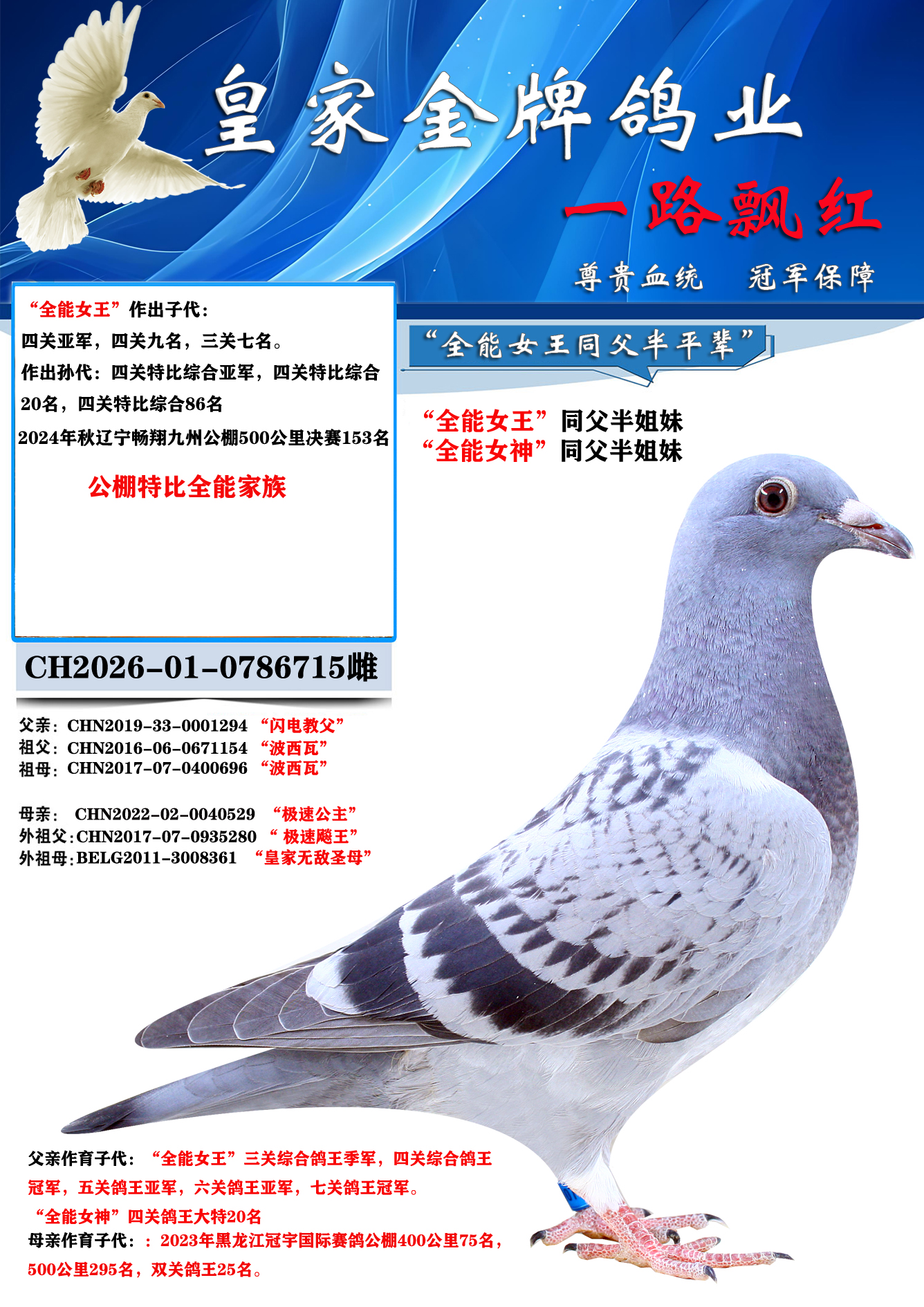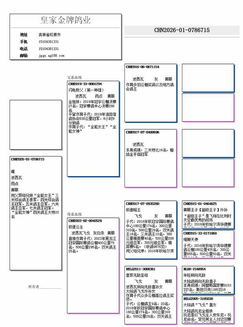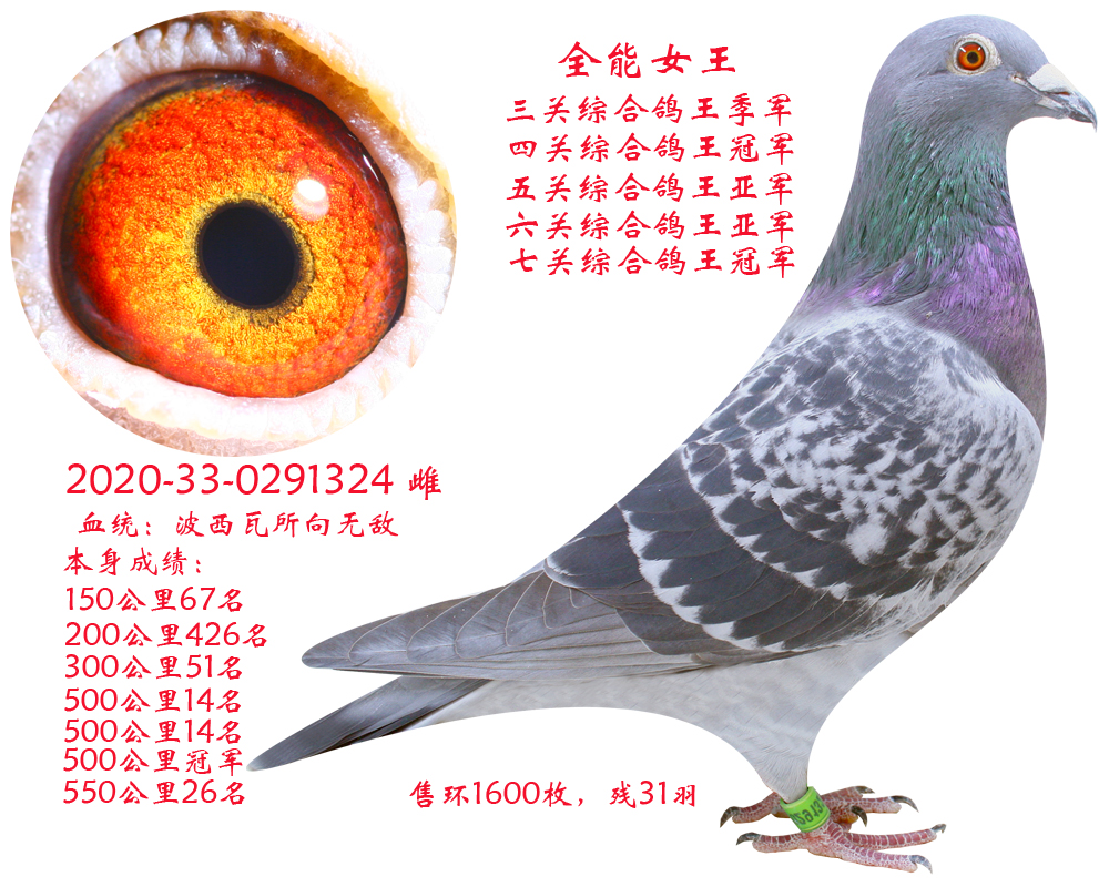 直接作育子代:2023年黑龙江冠宇国际赛鸽公棚400公里75名,500公里295名,双关鸽王25名。