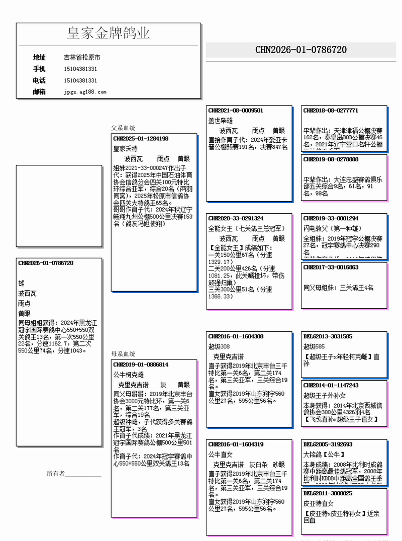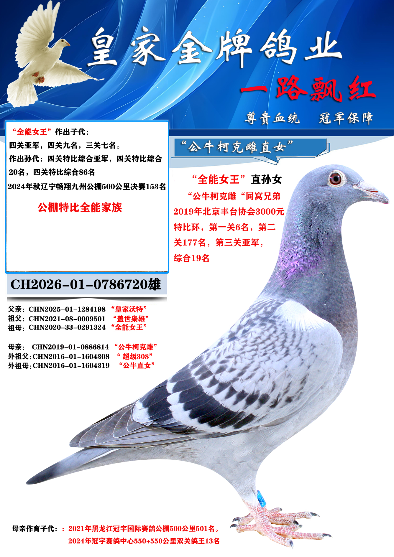 超级种雌,子代获得多关赛鸽王冠军,3名