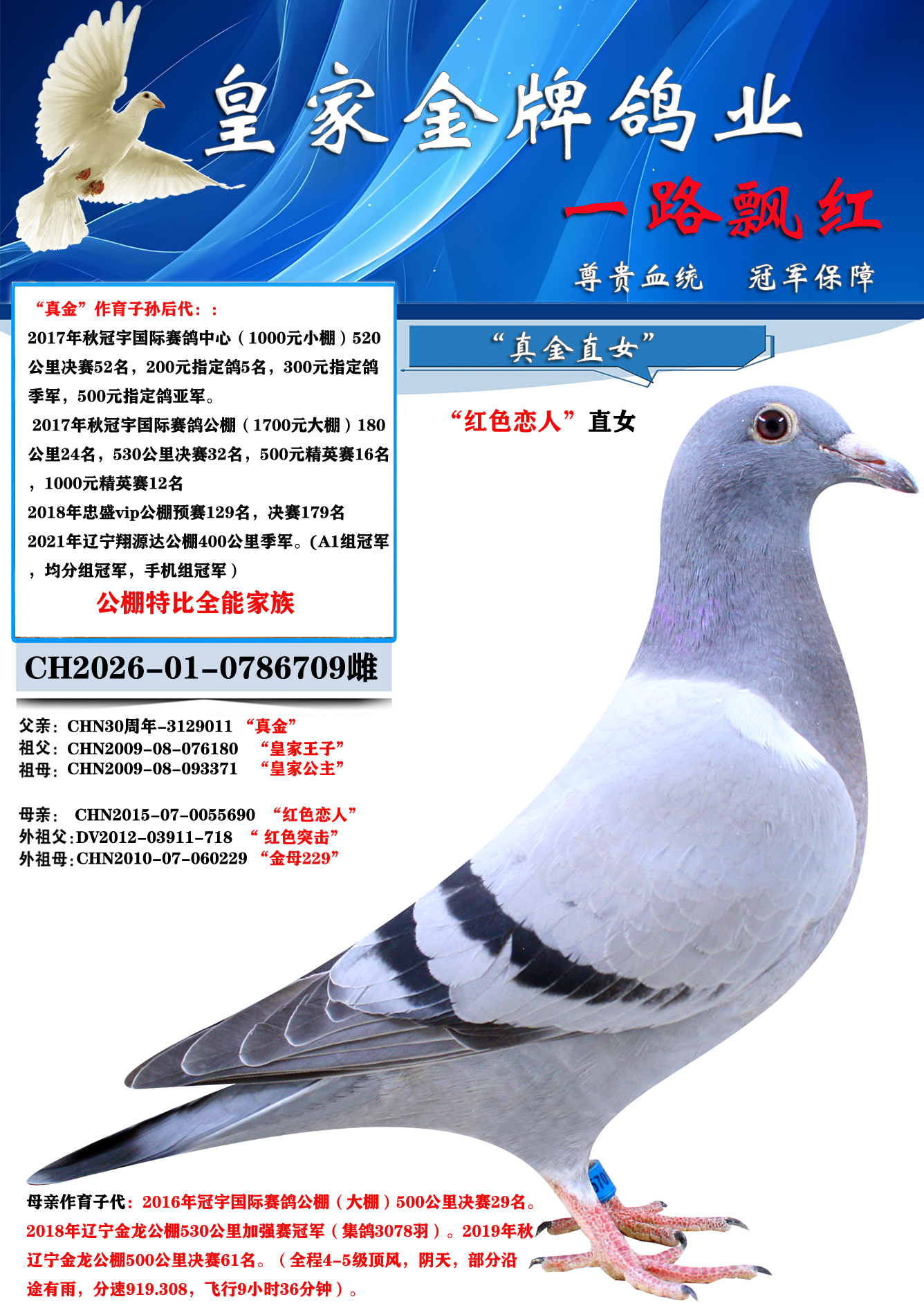 黄金配对优秀直女, 直接作育子代:2016年冠宇国际赛鸽公棚(大棚)500公里决赛29名。2018年辽宁金龙公棚530公里加强赛冠军(集鸽3078羽)2019年秋辽宁金龙公棚500公里决赛61名。(全程4-5级顶风,阴天,部分沿途有雨,分速919.308,飞行9小时36分钟)。