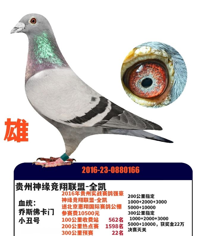 2016年贵州实战赛鸽强豪,神缘竞翔联盟-全凯,送北京惠翔国际赛鸽公棚,参赛费10500元,100公里收费站562名,200公里热点赛1598名,300公里预赛22名,200公里指定,1000+2000+3000+5000+10000,300公里指定 1000+2000+3000+5000+10000,获奖金22万,雄,自身质量高级,决赛灭关。血统,乔斯佛卡门小丑号!子代超级发挥,公棚获奖超20羽!