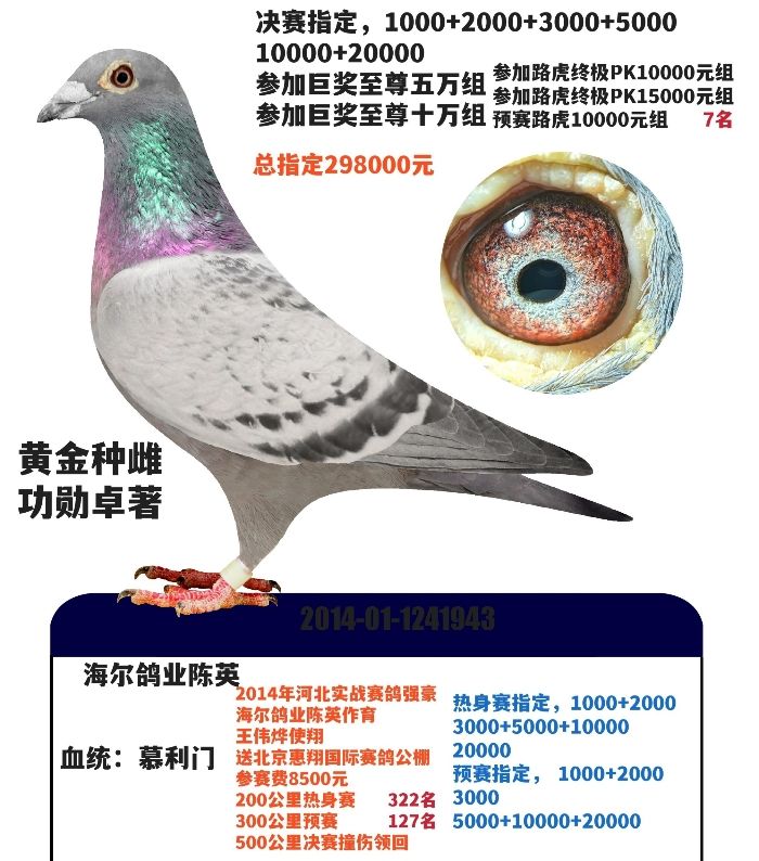 超级黄金老种雌,子代发挥六代,自身北京惠翔公棚重炮指定,父亲,中鸽国际决赛冠军,母亲,惠翔公棚双关鸽王,质量高级,活力四射。