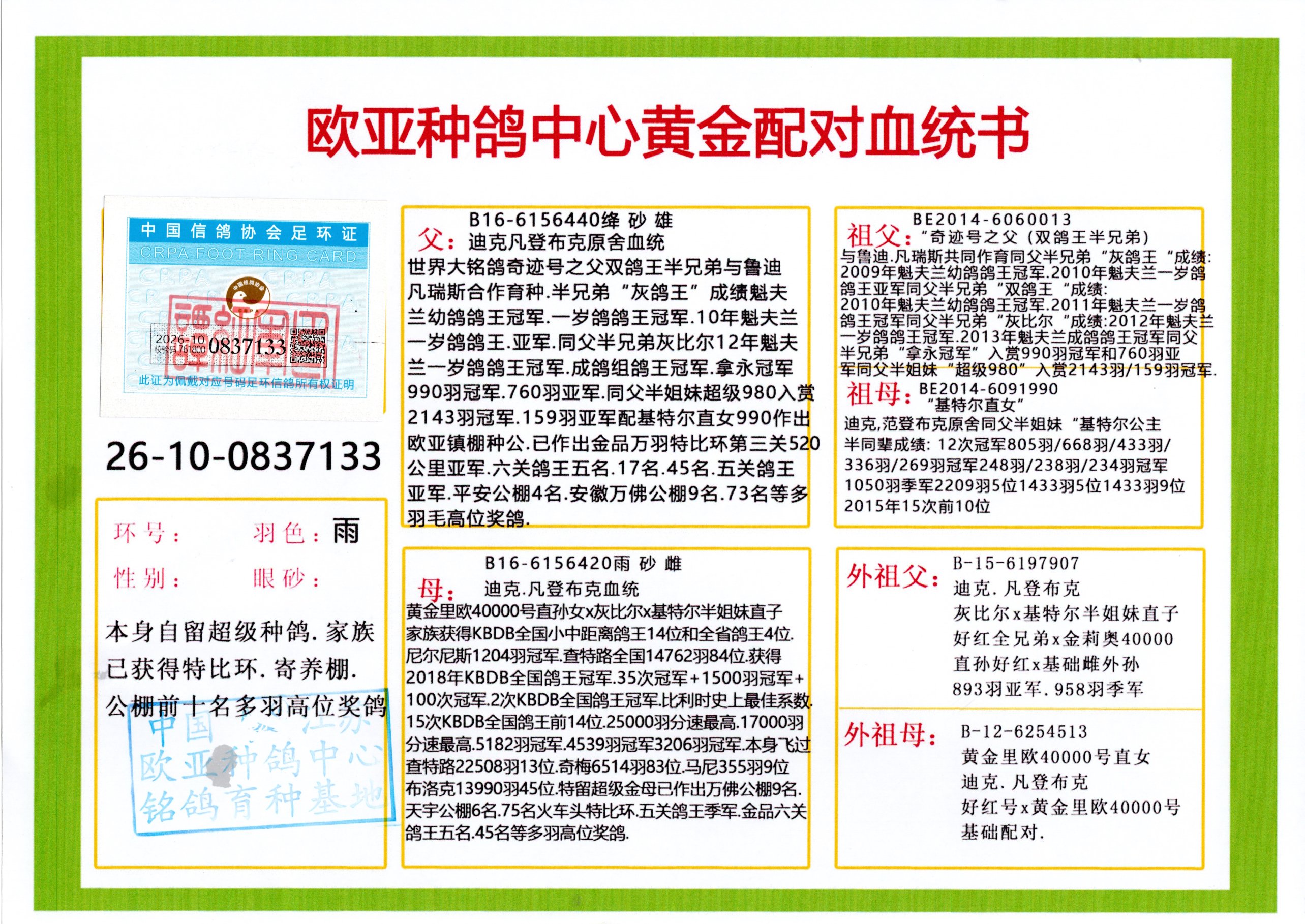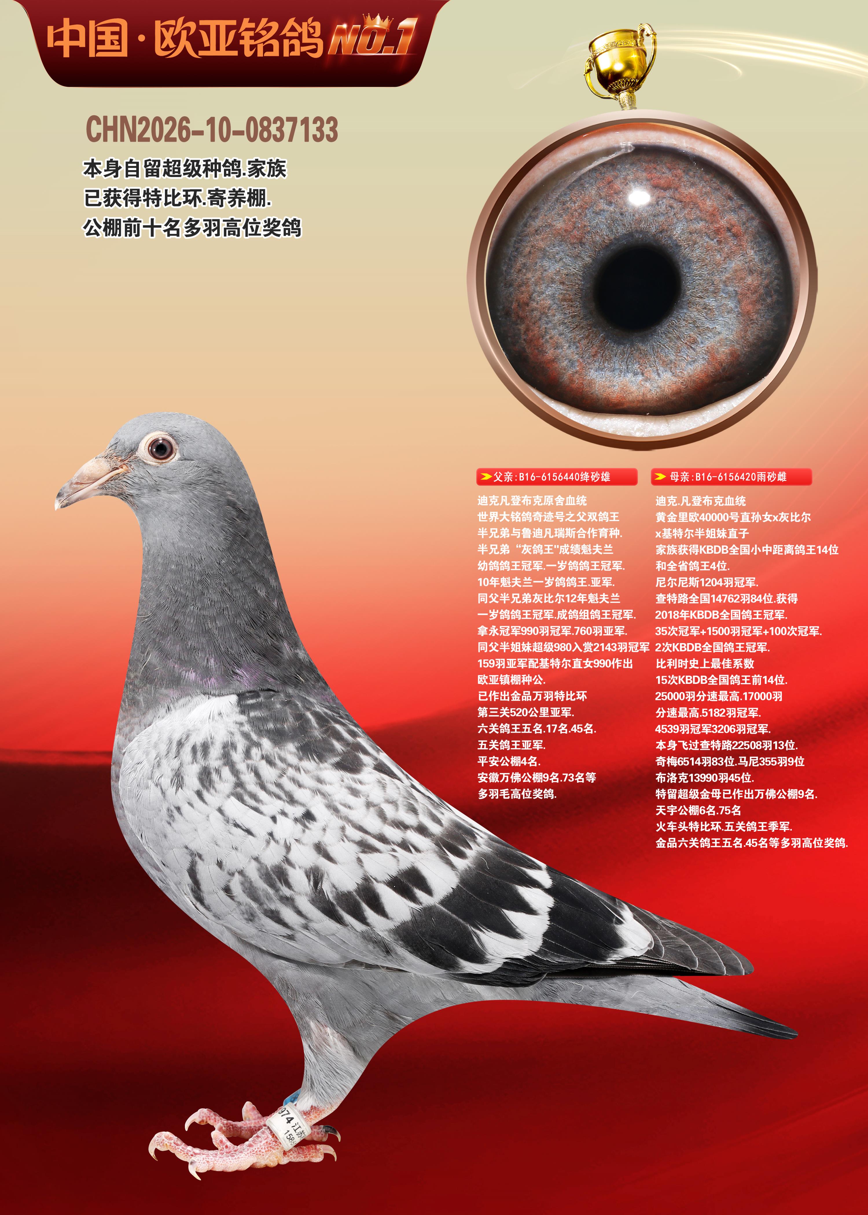 24年秋南京特比环欧亚荣获大团体冠军.小团体冠军551公里大特比13名.14名.16名.19名.20名.21名.24名.26名.27名.28名.42名.52名.54名.57名.65名.66名.68名.70名.71名.72名.74名.76名.80名.82名.83名.84名.85名.86名.90名.92名.110名.116名.121名.122名.128名.131名.158名.161名.164名.165名.166名.172名.174名.177名.182名.195名.196名.201名.205名.208名.210名.216名.253名.269名.275名.276名.294名.296名.299名,,24年秋云南天南铜都公棚决赛415名.天南铜都小棚决赛409名.云南玉活公棚决赛102名.490名.团体32名上笼二羽进二羽,天南铜都大棚506公里决赛445名。热烈祝贺河北省巨鹿县李兰生老师用欧亚泰山号血系连续十一年夺冠军,河北省国家赛冠军.全国季军等多次前十名高位,扬州王军王总用欧亚利奥24年春季获山东翔宇公棚决赛33名盖比53名。南京刘正龙刘总用欧亚盖比获得24年秋山东潍坊国际公棚决赛42名.精英赛30名.三关鸽王71名.决赛86名.加站赛16名.南京市特比环A组鸽王9名.B组鸽王5名.6名.C组鸽王5名.精英赛冠军4名.技能赛A组冠军4名.5名.秦淮区特比环荣获15名.46名.48名.87名。四川西昌徐亮徐总用欧亚利奥获得凉山州聚友决赛177名.第二关亚军双关鸽王19名.三关鸽王105名.云南豪庭公棚决赛603名。热烈祝贺24年四川重庆翔园鸽舍用欧亚泰山号荣获春季400公里冠军.秋季500公里冠军,河北王总用詹森X利奥获得千羽千翔公棚400公里冠军,广东蔡楷焕荣获24年秋爱好者 赛鸽俱乐部三关鸽王季军.一关420公里99名.二关450公里11名.三关520公里32名.单关季军.7名.12名,江西李卫兴荣获贵州红枫公棚8名.共翔俱乐部寄养棚四关综合鸽王30名.一关400公里78名.二关500公里55名.三关520公里37名.四关500公里57名.同父母获公棚18名.雷鸣获得武汉黄浦育翔中心冠军,四川陈文获得四川明鸿俱乐部300公里梦幻2名.3名.4名.9名.10名.13名.14名.15名.31名.34名.40名.41名.42名.43名.69名.71名.72名.73名.74名.94名.95名.97名.98名.99名.419公里决赛荣获总冠军7名.总共归巢9羽,四川徐亮获豪庭决赛603名,山西郑勇获得山西泰鑫公棚决赛255名詹森红狐,热烈祝贺马总获得开尔(飞跃队)决赛9名获奖金1310000万元.第一关52名,天津津福资赛180公里96名.获奖金429543万元,欧亚支持全国鸽友24年秋多人报喜 祝大家取得更好成绩,给欧亚报喜鸽友欧亚决定给每人赠送一羽超级种鸽。欧亚俱乐部特比环多关鸽王成绩:15年秋淮安特比环黑色星期一全会上笼9700多羽,当天无鸽归巢,第二天全会归巢357羽,本舍归巢158羽.前十名八羽.前一百名归巢57羽,16年春季获五关鸽王总冠军,总亚军四名.六名.七名.九名.十名.晶艺俱乐部520公里冠亚季军5名.6名.7名.9名.11名等,火车头冠军.季军6名.8名.9名.10名,16年秋晶艺俱乐部特比环520公里亚军.季军4名.6名.7名.9名,15年春南京白下特比环冠军.亚军.季军6名.7名.8名.9名.10名.指定鸽A B组获得冠军.亚军.季军4名.5名.,17年淮安特比环亚军.4名.5名.7名.8名.10名.六关鸽王总冠军.4名.6名.9名.10名,寄养棚宿迁刘总20羽特比环获冠军.季军.4名.7名.8名.9名等。18年荣获万羽特比环六关鸽王总冠军.总亚军.总季军.6名.8名.十名.单关四羽冠军.二羽亚军.四羽季军.前十名27羽。19年秋万羽特比环六关鸽王总亚军.总季军.5名.8名等,单关二羽冠军.三羽亚军.一羽季军前十名31羽。20年秋淮安市鸽会四关特比环大赛风雨无阻鸽王亚军.鸽王六名,金品俱乐部万羽特比环六关鸽王总冠军,总亚军.四名.五名.六名.七名.八名.十名.前二百名鸽王35羽,单关冠亚季军前十名四十多羽,火车头五关鸽王季军.六名.八名.前二百名鸽王十七羽。20年春荣获淮安五区一市四关鸽王总冠军.亚军.四名.八名.九名。21年秋荣获金品万羽特比环大赛六关鸽王总亚军.总季军.四名.七名.九名.十名.单关冠亚军季军前十名三十多羽。火车头协会鸽王六名.七名.十名.单关前十名十七羽。22年秋荣获鸽王总冠军.总亚军.5名.7名.8名.9名.11名.单关冠亚季军前十名三十多羽,第一关单关前二百名四十多羽,第二关前二百名三十多羽,第三关前二百名四十多羽,第四关前二百名四十多羽,第五关前一百名53羽。23年秋荣获鸽王季军.五名.八名.十名.13名.17名.20名.27名等多羽鸽王.单关前十名二十多羽。公棚.寄养棚部分成绩:16年秋宁夏黄河公棚总冠军电脑戈马力指定通炮冠军,17年送八羽参赛获得鸽王八名进奖四名,支持韩总荣获八名。支持鸽友荣获宁夏中卫公棚决赛总冠军.精英赛冠军,支持18年宁夏黄河公棚决赛冠军詹森X泰山。安徽鼎博寄养棚院内外四关鸽王总冠军.鸽王十七名.三十七名同窝,鸽王39名.42名.58名.67名。18年山东公棚预赛冠军.决赛65名.送八羽进奖五羽.指定获奔驰汽车一辆。支持鸽友获得云南蓝云公棚冠军.盖比X佛卡门。支持鸽友荣获云南银集公棚决赛冠军 詹森427X520血系 速度赛6700羽冠军。17年荣获金马俱乐部寄养棚四关鸽王总冠军.季军.六名.八名.第一关冠军.亚军.季军四名.七名.十一名.金牌教练奖。支持鸽友18年北京费翔公棚预赛九名电脑X桑杰士,支持鸽友荣获陕西威力公棚决赛11名.内蒙古临河寄养棚四关鸽王六名.詹森配泰山,支持河北王总用欧亚詹森427配胡本喜获20年秋开尔青年棚季军。云南东荣公棚16年预赛冠军.决赛77名.17年决赛12名.詹森红狐X泰山,17年平安公棚决赛4名 詹森427。欧亚获得21年金母寄养棚第一关四名.第二关5名.第三关5名.6名.7名.10名.三关鸽王总冠军,四关鸽王14名.十羽鸽王。支持河