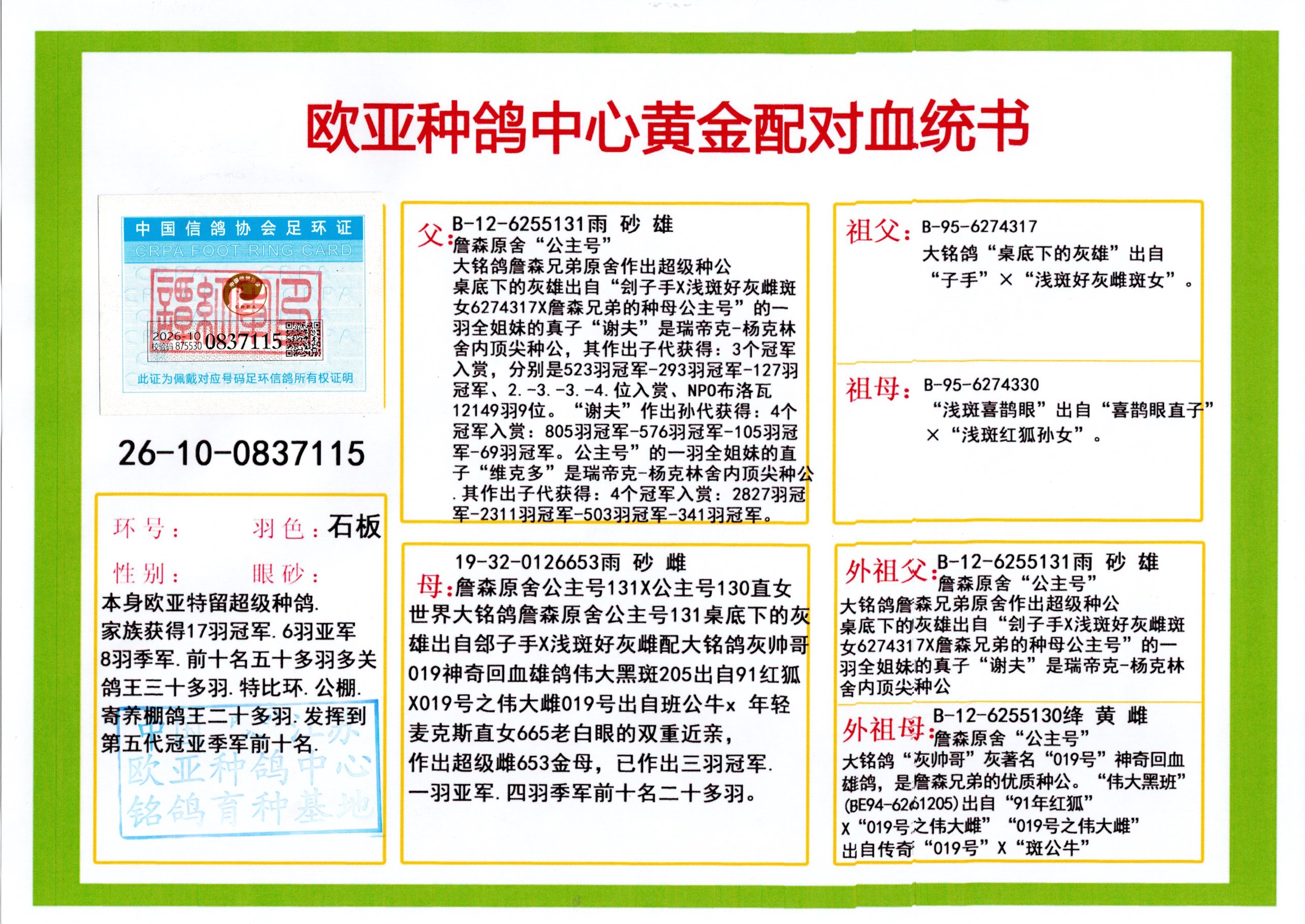 24年秋南京特比环欧亚荣获大团体冠军.小团体冠军551公里大特比13名.14名.16名.19名.20名.21名.24名.26名.27名.28名.42名.52名.54名.57名.65名.66名.68名.70名.71名.72名.74名.76名.80名.82名.83名.84名.85名.86名.90名.92名.110名.116名.121名.122名.128名.131名.158名.161名.164名.165名.166名.172名.174名.177名.182名.195名.196名.201名.205名.208名.210名.216名.253名.269名.275名.276名.294名.296名.299名,,24年秋云南天南铜都公棚决赛415名.天南铜都小棚决赛409名.云南玉活公棚决赛102名.490名.团体32名上笼二羽进二羽,天南铜都大棚506公里决赛445名。热烈祝贺河北省巨鹿县李兰生老师用欧亚泰山号血系连续十一年夺冠军,河北省国家赛冠军.全国季军等多次前十名高位,扬州王军王总用欧亚利奥24年春季获山东翔宇公棚决赛33名盖比53名。南京刘正龙刘总用欧亚盖比获得24年秋山东潍坊国际公棚决赛42名.精英赛30名.三关鸽王71名.决赛86名.加站赛16名.南京市特比环A组鸽王9名.B组鸽王5名.6名.C组鸽王5名.精英赛冠军4名.技能赛A组冠军4名.5名.秦淮区特比环荣获15名.46名.48名.87名。四川西昌徐亮徐总用欧亚利奥获得凉山州聚友决赛177名.第二关亚军双关鸽王19名.三关鸽王105名.云南豪庭公棚决赛603名。热烈祝贺24年四川重庆翔园鸽舍用欧亚泰山号荣获春季400公里冠军.秋季500公里冠军,河北王总用詹森X利奥获得千羽千翔公棚400公里冠军,广东蔡楷焕荣获24年秋爱好者 赛鸽俱乐部三关鸽王季军.一关420公里99名.二关450公里11名.三关520公里32名.单关季军.7名.12名,江西李卫兴荣获贵州红枫公棚8名.共翔俱乐部寄养棚四关综合鸽王30名.一关400公里78名.二关500公里55名.三关520公里37名.四关500公里57名.同父母获公棚18名.雷鸣获得武汉黄浦育翔中心冠军,四川陈文获得四川明鸿俱乐部300公里梦幻2名.3名.4名.9名.10名.13名.14名.15名.31名.34名.40名.41名.42名.43名.69名.71名.72名.73名.74名.94名.95名.97名.98名.99名.419公里决赛荣获总冠军7名.总共归巢9羽,四川徐亮获豪庭决赛603名,山西郑勇获得山西泰鑫公棚决赛255名詹森红狐,热烈祝贺马总获得开尔(飞跃队)决赛9名获奖金1310000万元.第一关52名,天津津福资赛180公里96名.获奖金429543万元,欧亚支持全国鸽友24年秋多人报喜 祝大家取得更好成绩,给欧亚报喜鸽友欧亚决定给每人赠送一羽超级种鸽。欧亚俱乐部特比环多关鸽王成绩:15年秋淮安特比环黑色星期一全会上笼9700多羽,当天无鸽归巢,第二天全会归巢357羽,本舍归巢158羽.前十名八羽.前一百名归巢57羽,16年春季获五关鸽王总冠军,总亚军四名.六名.七名.九名.十名.晶艺俱乐部520公里冠亚季军5名.6名.7名.9名.11名等,火车头冠军.季军6名.8名.9名.10名,16年秋晶艺俱乐部特比环520公里亚军.季军4名.6名.7名.9名,15年春南京白下特比环冠军.亚军.季军6名.7名.8名.9名.10名.指定鸽A B组获得冠军.亚军.季军4名.5名.,17年淮安特比环亚军.4名.5名.7名.8名.10名.六关鸽王总冠军.4名.6名.9名.10名,寄养棚宿迁刘总20羽特比环获冠军.季军.4名.7名.8名.9名等。18年荣获万羽特比环六关鸽王总冠军.总亚军.总季军.6名.8名.十名.单关四羽冠军.二羽亚军.四羽季军.前十名27羽。19年秋万羽特比环六关鸽王总亚军.总季军.5名.8名等,单关二羽冠军.三羽亚军.一羽季军前十名31羽。20年秋淮安市鸽会四关特比环大赛风雨无阻鸽王亚军.鸽王六名,金品俱乐部万羽特比环六关鸽王总冠军,总亚军.四名.五名.六名.七名.八名.十名.前二百名鸽王35羽,单关冠亚季军前十名四十多羽,火车头五关鸽王季军.六名.八名.前二百名鸽王十七羽。20年春荣获淮安五区一市四关鸽王总冠军.亚军.四名.八名.九名。21年秋荣获金品万羽特比环大赛六关鸽王总亚军.总季军.四名.七名.九名.十名.单关冠亚军季军前十名三十多羽。火车头协会鸽王六名.七名.十名.单关前十名十七羽。22年秋荣获鸽王总冠军.总亚军.5名.7名.8名.9名.11名.单关冠亚季军前十名三十多羽,第一关单关前二百名四十多羽,第二关前二百名三十多羽,第三关前二百名四十多羽,第四关前二百名四十多羽,第五关前一百名53羽。23年秋荣获鸽王季军.五名.八名.十名.13名.17名.20名.27名等多羽鸽王.单关前十名二十多羽。公棚.寄养棚部分成绩:16年秋宁夏黄河公棚总冠军电脑戈马力指定通炮冠军,17年送八羽参赛获得鸽王八名进奖四名,支持韩总荣获八名。支持鸽友荣获宁夏中卫公棚决赛总冠军.精英赛冠军,支持18年宁夏黄河公棚决赛冠军詹森X泰山。安徽鼎博寄养棚院内外四关鸽王总冠军.鸽王十七名.三十七名同窝,鸽王39名.42名.58名.67名。18年山东公棚预赛冠军.决赛65名.送八羽进奖五羽.指定获奔驰汽车一辆。支持鸽友获得云南蓝云公棚冠军.盖比X佛卡门。支持鸽友荣获云南银集公棚决赛冠军 詹森427X520血系 速度赛6700羽冠军。17年荣获金马俱乐部寄养棚四关鸽王总冠军.季军.六名.八名.第一关冠军.亚军.季军四名.七名.十一名.金牌教练奖。支持鸽友18年北京费翔公棚预赛九名电脑X桑杰士,支持鸽友荣获陕西威力公棚决赛11名.内蒙古临河寄养棚四关鸽王六名.詹森配泰山,支持河北王总用欧亚詹森427配胡本喜获20年秋开尔青年棚季军。云南东荣公棚16年预赛冠军.决赛77名.17年决赛12名.詹森红狐X泰山,17年平安公棚决赛4名 詹森427。欧亚获得21年金母寄养棚第一关四名.第二关5名.第三关5名.6名.7名.10名.三关鸽王总冠军,四关鸽王14名.十羽鸽王。支持河