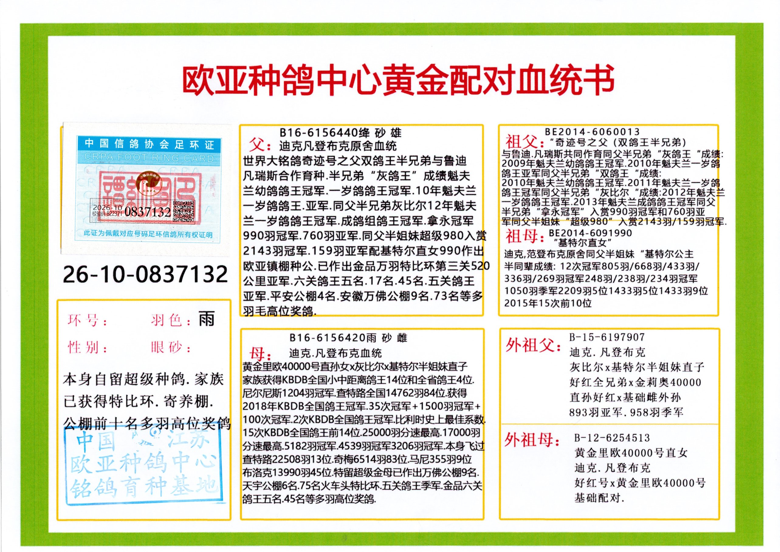 24年秋南京特比环欧亚荣获大团体冠军.小团体冠军551公里大特比13名.14名.16名.19名.20名.21名.24名.26名.27名.28名.42名.52名.54名.57名.65名.66名.68名.70名.71名.72名.74名.76名.80名.82名.83名.84名.85名.86名.90名.92名.110名.116名.121名.122名.128名.131名.158名.161名.164名.165名.166名.172名.174名.177名.182名.195名.196名.201名.205名.208名.210名.216名.253名.269名.275名.276名.294名.296名.299名,,24年秋云南天南铜都公棚决赛415名.天南铜都小棚决赛409名.云南玉活公棚决赛102名.490名.团体32名上笼二羽进二羽,天南铜都大棚506公里决赛445名。热烈祝贺河北省巨鹿县李兰生老师用欧亚泰山号血系连续十一年夺冠军,河北省国家赛冠军.全国季军等多次前十名高位,扬州王军王总用欧亚利奥24年春季获山东翔宇公棚决赛33名盖比53名。南京刘正龙刘总用欧亚盖比获得24年秋山东潍坊国际公棚决赛42名.精英赛30名.三关鸽王71名.决赛86名.加站赛16名.南京市特比环A组鸽王9名.B组鸽王5名.6名.C组鸽王5名.精英赛冠军4名.技能赛A组冠军4名.5名.秦淮区特比环荣获15名.46名.48名.87名。四川西昌徐亮徐总用欧亚利奥获得凉山州聚友决赛177名.第二关亚军双关鸽王19名.三关鸽王105名.云南豪庭公棚决赛603名。热烈祝贺24年四川重庆翔园鸽舍用欧亚泰山号荣获春季400公里冠军.秋季500公里冠军,河北王总用詹森X利奥获得千羽千翔公棚400公里冠军,广东蔡楷焕荣获24年秋爱好者 赛鸽俱乐部三关鸽王季军.一关420公里99名.二关450公里11名.三关520公里32名.单关季军.7名.12名,江西李卫兴荣获贵州红枫公棚8名.共翔俱乐部寄养棚四关综合鸽王30名.一关400公里78名.二关500公里55名.三关520公里37名.四关500公里57名.同父母获公棚18名.雷鸣获得武汉黄浦育翔中心冠军,四川陈文获得四川明鸿俱乐部300公里梦幻2名.3名.4名.9名.10名.13名.14名.15名.31名.34名.40名.41名.42名.43名.69名.71名.72名.73名.74名.94名.95名.97名.98名.99名.419公里决赛荣获总冠军7名.总共归巢9羽,四川徐亮获豪庭决赛603名,山西郑勇获得山西泰鑫公棚决赛255名詹森红狐,热烈祝贺马总获得开尔(飞跃队)决赛9名获奖金1310000万元.第一关52名,天津津福资赛180公里96名.获奖金429543万元,欧亚支持全国鸽友24年秋多人报喜 祝大家取得更好成绩,给欧亚报喜鸽友欧亚决定给每人赠送一羽超级种鸽。欧亚俱乐部特比环多关鸽王成绩:15年秋淮安特比环黑色星期一全会上笼9700多羽,当天无鸽归巢,第二天全会归巢357羽,本舍归巢158羽.前十名八羽.前一百名归巢57羽,16年春季获五关鸽王总冠军,总亚军四名.六名.七名.九名.十名.晶艺俱乐部520公里冠亚季军5名.6名.7名.9名.11名等,火车头冠军.季军6名.8名.9名.10名,16年秋晶艺俱乐部特比环520公里亚军.季军4名.6名.7名.9名,15年春南京白下特比环冠军.亚军.季军6名.7名.8名.9名.10名.指定鸽A B组获得冠军.亚军.季军4名.5名.,17年淮安特比环亚军.4名.5名.7名.8名.10名.六关鸽王总冠军.4名.6名.9名.10名,寄养棚宿迁刘总20羽特比环获冠军.季军.4名.7名.8名.9名等。18年荣获万羽特比环六关鸽王总冠军.总亚军.总季军.6名.8名.十名.单关四羽冠军.二羽亚军.四羽季军.前十名27羽。19年秋万羽特比环六关鸽王总亚军.总季军.5名.8名等,单关二羽冠军.三羽亚军.一羽季军前十名31羽。20年秋淮安市鸽会四关特比环大赛风雨无阻鸽王亚军.鸽王六名,金品俱乐部万羽特比环六关鸽王总冠军,总亚军.四名.五名.六名.七名.八名.十名.前二百名鸽王35羽,单关冠亚季军前十名四十多羽,火车头五关鸽王季军.六名.八名.前二百名鸽王十七羽。20年春荣获淮安五区一市四关鸽王总冠军.亚军.四名.八名.九名。21年秋荣获金品万羽特比环大赛六关鸽王总亚军.总季军.四名.七名.九名.十名.单关冠亚军季军前十名三十多羽。火车头协会鸽王六名.七名.十名.单关前十名十七羽。22年秋荣获鸽王总冠军.总亚军.5名.7名.8名.9名.11名.单关冠亚季军前十名三十多羽,第一关单关前二百名四十多羽,第二关前二百名三十多羽,第三关前二百名四十多羽,第四关前二百名四十多羽,第五关前一百名53羽。23年秋荣获鸽王季军.五名.八名.十名.13名.17名.20名.27名等多羽鸽王.单关前十名二十多羽。公棚.寄养棚部分成绩:16年秋宁夏黄河公棚总冠军电脑戈马力指定通炮冠军,17年送八羽参赛获得鸽王八名进奖四名,支持韩总荣获八名。支持鸽友荣获宁夏中卫公棚决赛总冠军.精英赛冠军,支持18年宁夏黄河公棚决赛冠军詹森X泰山。安徽鼎博寄养棚院内外四关鸽王总冠军.鸽王十七名.三十七名同窝,鸽王39名.42名.58名.67名。18年山东公棚预赛冠军.决赛65名.送八羽进奖五羽.指定获奔驰汽车一辆。支持鸽友获得云南蓝云公棚冠军.盖比X佛卡门。支持鸽友荣获云南银集公棚决赛冠军 詹森427X520血系 速度赛6700羽冠军。17年荣获金马俱乐部寄养棚四关鸽王总冠军.季军.六名.八名.第一关冠军.亚军.季军四名.七名.十一名.金牌教练奖。支持鸽友18年北京费翔公棚预赛九名电脑X桑杰士,支持鸽友荣获陕西威力公棚决赛11名.内蒙古临河寄养棚四关鸽王六名.詹森配泰山,支持河北王总用欧亚詹森427配胡本喜获20年秋开尔青年棚季军。云南东荣公棚16年预赛冠军.决赛77名.17年决赛12名.詹森红狐X泰山,17年平安公棚决赛4名 詹森427。欧亚获得21年金母寄养棚第一关四名.第二关5名.第三关5名.6名.7名.10名.三关鸽王总冠军,四关鸽王14名.十羽鸽王。支持河