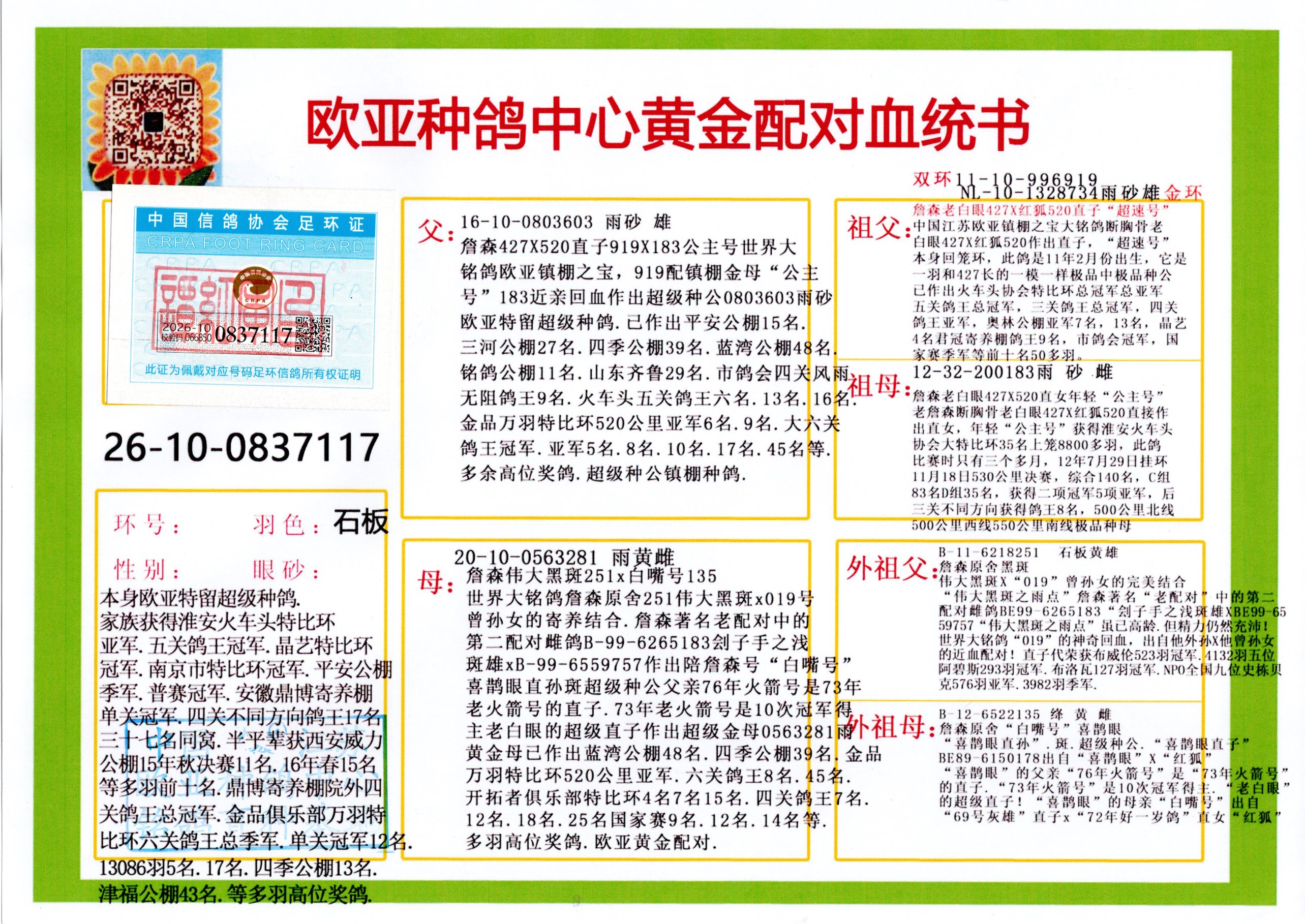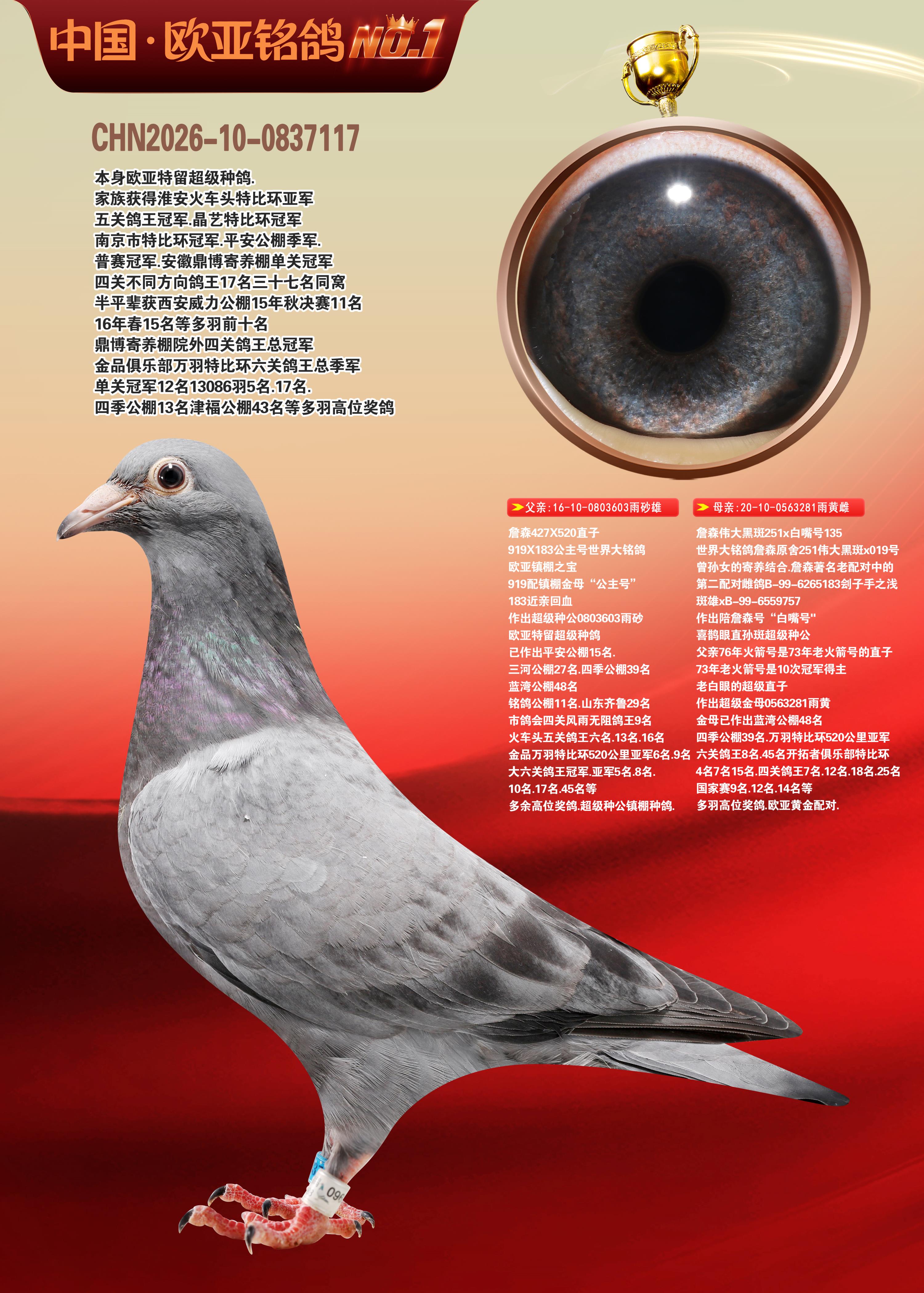 24年秋南京特比环欧亚荣获大团体冠军.小团体冠军551公里大特比13名.14名.16名.19名.20名.21名.24名.26名.27名.28名.42名.52名.54名.57名.65名.66名.68名.70名.71名.72名.74名.76名.80名.82名.83名.84名.85名.86名.90名.92名.110名.116名.121名.122名.128名.131名.158名.161名.164名.165名.166名.172名.174名.177名.182名.195名.196名.201名.205名.208名.210名.216名.253名.269名.275名.276名.294名.296名.299名,,24年秋云南天南铜都公棚决赛415名.天南铜都小棚决赛409名.云南玉活公棚决赛102名.490名.团体32名上笼二羽进二羽,天南铜都大棚506公里决赛445名。热烈祝贺河北省巨鹿县李兰生老师用欧亚泰山号血系连续十一年夺冠军,河北省国家赛冠军.全国季军等多次前十名高位,扬州王军王总用欧亚利奥24年春季获山东翔宇公棚决赛33名盖比53名。南京刘正龙刘总用欧亚盖比获得24年秋山东潍坊国际公棚决赛42名.精英赛30名.三关鸽王71名.决赛86名.加站赛16名.南京市特比环A组鸽王9名.B组鸽王5名.6名.C组鸽王5名.精英赛冠军4名.技能赛A组冠军4名.5名.秦淮区特比环荣获15名.46名.48名.87名。四川西昌徐亮徐总用欧亚利奥获得凉山州聚友决赛177名.第二关亚军双关鸽王19名.三关鸽王105名.云南豪庭公棚决赛603名。热烈祝贺24年四川重庆翔园鸽舍用欧亚泰山号荣获春季400公里冠军.秋季500公里冠军,河北王总用詹森X利奥获得千羽千翔公棚400公里冠军,广东蔡楷焕荣获24年秋爱好者 赛鸽俱乐部三关鸽王季军.一关420公里99名.二关450公里11名.三关520公里32名.单关季军.7名.12名,江西李卫兴荣获贵州红枫公棚8名.共翔俱乐部寄养棚四关综合鸽王30名.一关400公里78名.二关500公里55名.三关520公里37名.四关500公里57名.同父母获公棚18名.雷鸣获得武汉黄浦育翔中心冠军,四川陈文获得四川明鸿俱乐部300公里梦幻2名.3名.4名.9名.10名.13名.14名.15名.31名.34名.40名.41名.42名.43名.69名.71名.72名.73名.74名.94名.95名.97名.98名.99名.419公里决赛荣获总冠军7名.总共归巢9羽,四川徐亮获豪庭决赛603名,山西郑勇获得山西泰鑫公棚决赛255名詹森红狐,热烈祝贺马总获得开尔(飞跃队)决赛9名获奖金1310000万元.第一关52名,天津津福资赛180公里96名.获奖金429543万元,欧亚支持全国鸽友24年秋多人报喜 祝大家取得更好成绩,给欧亚报喜鸽友欧亚决定给每人赠送一羽超级种鸽。欧亚俱乐部特比环多关鸽王成绩:15年秋淮安特比环黑色星期一全会上笼9700多羽,当天无鸽归巢,第二天全会归巢357羽,本舍归巢158羽.前十名八羽.前一百名归巢57羽,16年春季获五关鸽王总冠军,总亚军四名.六名.七名.九名.十名.晶艺俱乐部520公里冠亚季军5名.6名.7名.9名.11名等,火车头冠军.季军6名.8名.9名.10名,16年秋晶艺俱乐部特比环520公里亚军.季军4名.6名.7名.9名,15年春南京白下特比环冠军.亚军.季军6名.7名.8名.9名.10名.指定鸽A B组获得冠军.亚军.季军4名.5名.,17年淮安特比环亚军.4名.5名.7名.8名.10名.六关鸽王总冠军.4名.6名.9名.10名,寄养棚宿迁刘总20羽特比环获冠军.季军.4名.7名.8名.9名等。18年荣获万羽特比环六关鸽王总冠军.总亚军.总季军.6名.8名.十名.单关四羽冠军.二羽亚军.四羽季军.前十名27羽。19年秋万羽特比环六关鸽王总亚军.总季军.5名.8名等,单关二羽冠军.三羽亚军.一羽季军前十名31羽。20年秋淮安市鸽会四关特比环大赛风雨无阻鸽王亚军.鸽王六名,金品俱乐部万羽特比环六关鸽王总冠军,总亚军.四名.五名.六名.七名.八名.十名.前二百名鸽王35羽,单关冠亚季军前十名四十多羽,火车头五关鸽王季军.六名.八名.前二百名鸽王十七羽。20年春荣获淮安五区一市四关鸽王总冠军.亚军.四名.八名.九名。21年秋荣获金品万羽特比环大赛六关鸽王总亚军.总季军.四名.七名.九名.十名.单关冠亚军季军前十名三十多羽。火车头协会鸽王六名.七名.十名.单关前十名十七羽。22年秋荣获鸽王总冠军.总亚军.5名.7名.8名.9名.11名.单关冠亚季军前十名三十多羽,第一关单关前二百名四十多羽,第二关前二百名三十多羽,第三关前二百名四十多羽,第四关前二百名四十多羽,第五关前一百名53羽。23年秋荣获鸽王季军.五名.八名.十名.13名.17名.20名.27名等多羽鸽王.单关前十名二十多羽。公棚.寄养棚部分成绩:16年秋宁夏黄河公棚总冠军电脑戈马力指定通炮冠军,17年送八羽参赛获得鸽王八名进奖四名,支持韩总荣获八名。支持鸽友荣获宁夏中卫公棚决赛总冠军.精英赛冠军,支持18年宁夏黄河公棚决赛冠军詹森X泰山。安徽鼎博寄养棚院内外四关鸽王总冠军.鸽王十七名.三十七名同窝,鸽王39名.42名.58名.67名。18年山东公棚预赛冠军.决赛65名.送八羽进奖五羽.指定获奔驰汽车一辆。支持鸽友获得云南蓝云公棚冠军.盖比X佛卡门。支持鸽友荣获云南银集公棚决赛冠军 詹森427X520血系 速度赛6700羽冠军。17年荣获金马俱乐部寄养棚四关鸽王总冠军.季军.六名.八名.第一关冠军.亚军.季军四名.七名.十一名.金牌教练奖。支持鸽友18年北京费翔公棚预赛九名电脑X桑杰士,支持鸽友荣获陕西威力公棚决赛11名.内蒙古临河寄养棚四关鸽王六名.詹森配泰山,支持河北王总用欧亚詹森427配胡本喜获20年秋开尔青年棚季军。云南东荣公棚16年预赛冠军.决赛77名.17年决赛12名.詹森红狐X泰山,17年平安公棚决赛4名 詹森427。欧亚获得21年金母寄养棚第一关四名.第二关5名.第三关5名.6名.7名.10名.三关鸽王总冠军,四关鸽王14名.十羽鸽王。支持河