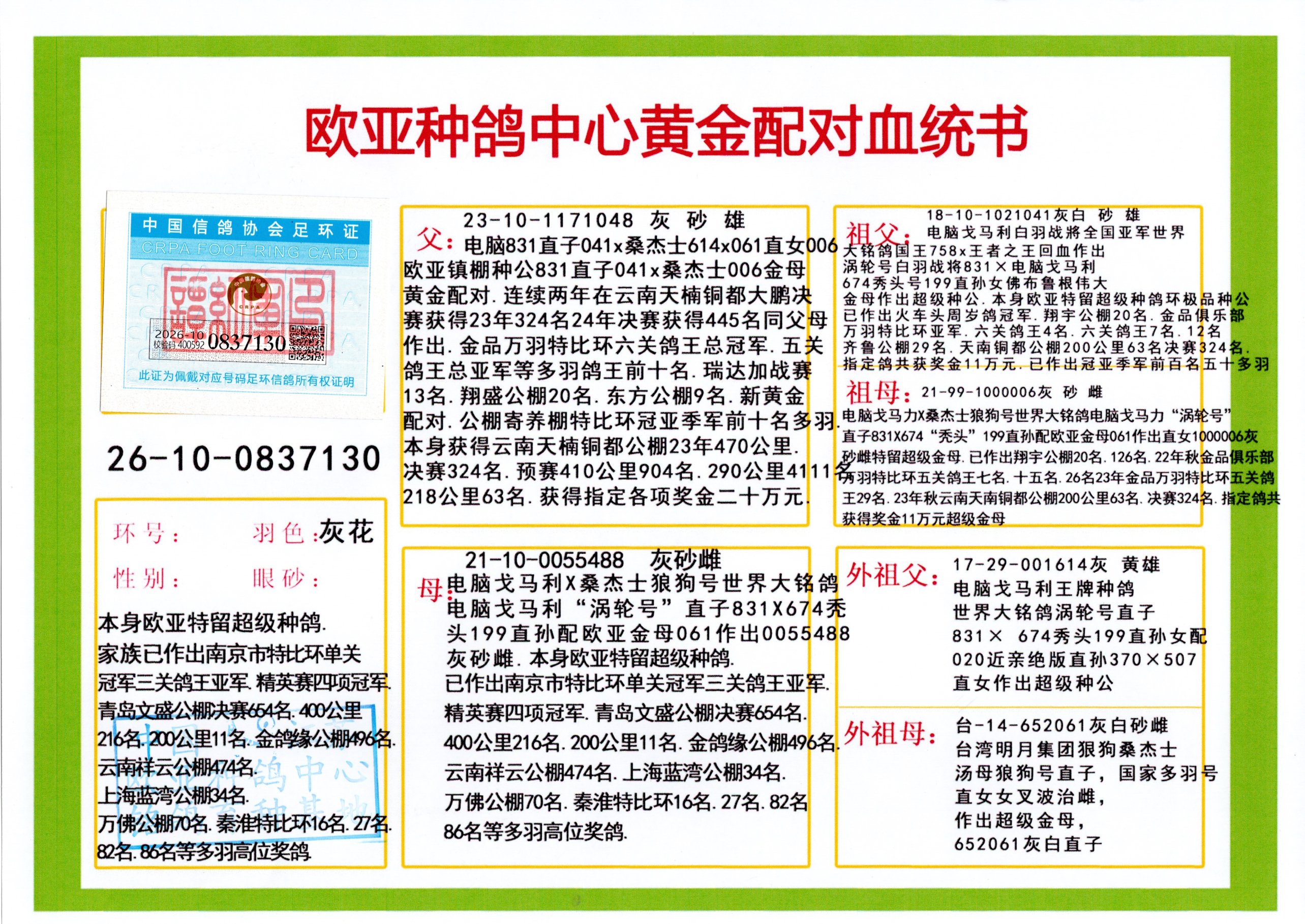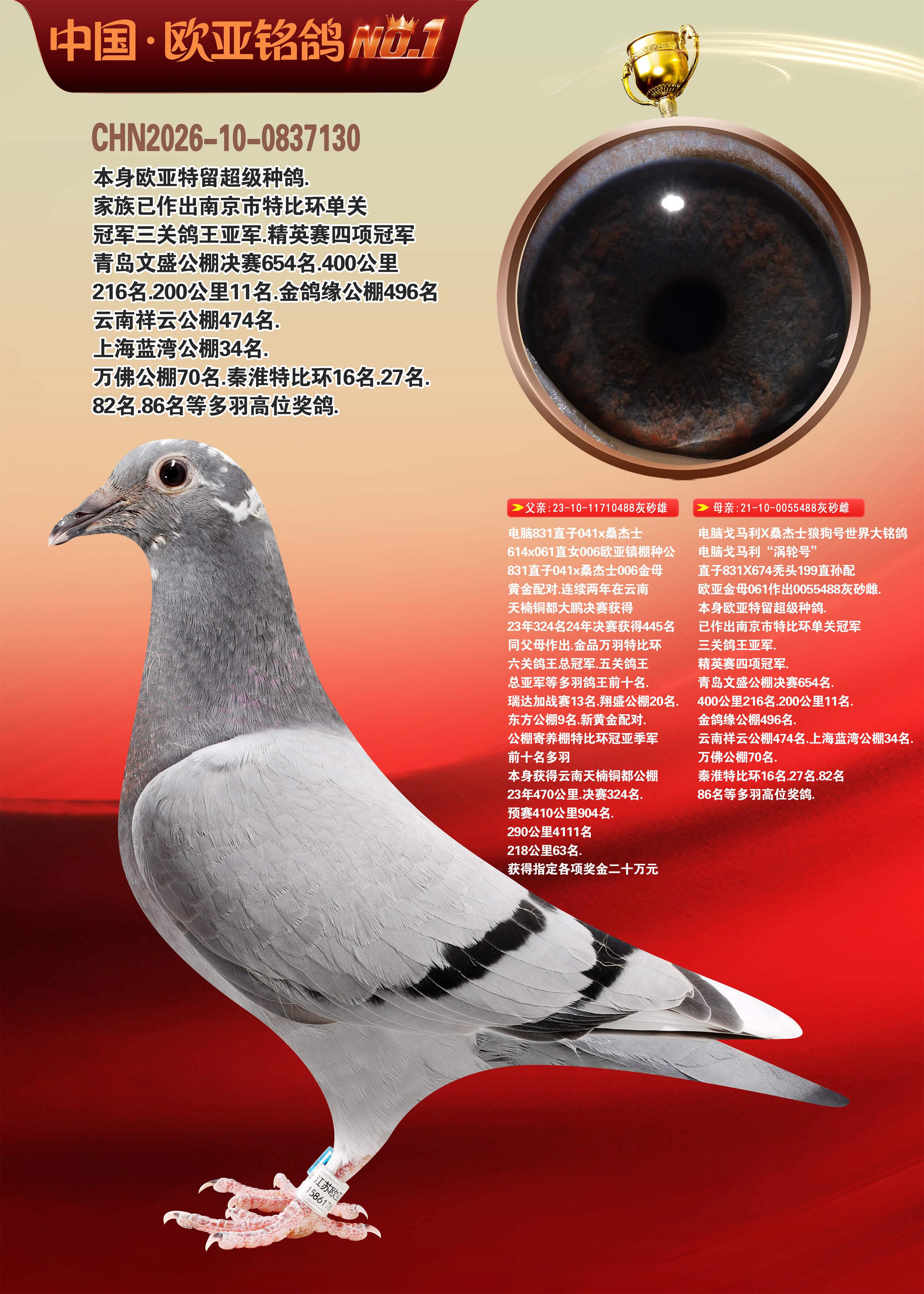 24年秋南京特比环欧亚荣获大团体冠军.小团体冠军551公里大特比13名.14名.16名.19名.20名.21名.24名.26名.27名.28名.42名.52名.54名.57名.65名.66名.68名.70名.71名.72名.74名.76名.80名.82名.83名.84名.85名.86名.90名.92名.110名.116名.121名.122名.128名.131名.158名.161名.164名.165名.166名.172名.174名.177名.182名.195名.196名.201名.205名.208名.210名.216名.253名.269名.275名.276名.294名.296名.299名,,24年秋云南天南铜都公棚决赛415名.天南铜都小棚决赛409名.云南玉活公棚决赛102名.490名.团体32名上笼二羽进二羽,天南铜都大棚506公里决赛445名。热烈祝贺河北省巨鹿县李兰生老师用欧亚泰山号血系连续十一年夺冠军,河北省国家赛冠军.全国季军等多次前十名高位,扬州王军王总用欧亚利奥24年春季获山东翔宇公棚决赛33名盖比53名。南京刘正龙刘总用欧亚盖比获得24年秋山东潍坊国际公棚决赛42名.精英赛30名.三关鸽王71名.决赛86名.加站赛16名.南京市特比环A组鸽王9名.B组鸽王5名.6名.C组鸽王5名.精英赛冠军4名.技能赛A组冠军4名.5名.秦淮区特比环荣获15名.46名.48名.87名。四川西昌徐亮徐总用欧亚利奥获得凉山州聚友决赛177名.第二关亚军双关鸽王19名.三关鸽王105名.云南豪庭公棚决赛603名。热烈祝贺24年四川重庆翔园鸽舍用欧亚泰山号荣获春季400公里冠军.秋季500公里冠军,河北王总用詹森X利奥获得千羽千翔公棚400公里冠军,广东蔡楷焕荣获24年秋爱好者 赛鸽俱乐部三关鸽王季军.一关420公里99名.二关450公里11名.三关520公里32名.单关季军.7名.12名,江西李卫兴荣获贵州红枫公棚8名.共翔俱乐部寄养棚四关综合鸽王30名.一关400公里78名.二关500公里55名.三关520公里37名.四关500公里57名.同父母获公棚18名.雷鸣获得武汉黄浦育翔中心冠军,四川陈文获得四川明鸿俱乐部300公里梦幻2名.3名.4名.9名.10名.13名.14名.15名.31名.34名.40名.41名.42名.43名.69名.71名.72名.73名.74名.94名.95名.97名.98名.99名.419公里决赛荣获总冠军7名.总共归巢9羽,四川徐亮获豪庭决赛603名,山西郑勇获得山西泰鑫公棚决赛255名詹森红狐,热烈祝贺马总获得开尔(飞跃队)决赛9名获奖金1310000万元.第一关52名,天津津福资赛180公里96名.获奖金429543万元,欧亚支持全国鸽友24年秋多人报喜 祝大家取得更好成绩,给欧亚报喜鸽友欧亚决定给每人赠送一羽超级种鸽。欧亚俱乐部特比环多关鸽王成绩:15年秋淮安特比环黑色星期一全会上笼9700多羽,当天无鸽归巢,第二天全会归巢357羽,本舍归巢158羽.前十名八羽.前一百名归巢57羽,16年春季获五关鸽王总冠军,总亚军四名.六名.七名.九名.十名.晶艺俱乐部520公里冠亚季军5名.6名.7名.9名.11名等,火车头冠军.季军6名.8名.9名.10名,16年秋晶艺俱乐部特比环520公里亚军.季军4名.6名.7名.9名,15年春南京白下特比环冠军.亚军.季军6名.7名.8名.9名.10名.指定鸽A B组获得冠军.亚军.季军4名.5名.,17年淮安特比环亚军.4名.5名.7名.8名.10名.六关鸽王总冠军.4名.6名.9名.10名,寄养棚宿迁刘总20羽特比环获冠军.季军.4名.7名.8名.9名等。18年荣获万羽特比环六关鸽王总冠军.总亚军.总季军.6名.8名.十名.单关四羽冠军.二羽亚军.四羽季军.前十名27羽。19年秋万羽特比环六关鸽王总亚军.总季军.5名.8名等,单关二羽冠军.三羽亚军.一羽季军前十名31羽。20年秋淮安市鸽会四关特比环大赛风雨无阻鸽王亚军.鸽王六名,金品俱乐部万羽特比环六关鸽王总冠军,总亚军.四名.五名.六名.七名.八名.十名.前二百名鸽王35羽,单关冠亚季军前十名四十多羽,火车头五关鸽王季军.六名.八名.前二百名鸽王十七羽。20年春荣获淮安五区一市四关鸽王总冠军.亚军.四名.八名.九名。21年秋荣获金品万羽特比环大赛六关鸽王总亚军.总季军.四名.七名.九名.十名.单关冠亚军季军前十名三十多羽。火车头协会鸽王六名.七名.十名.单关前十名十七羽。22年秋荣获鸽王总冠军.总亚军.5名.7名.8名.9名.11名.单关冠亚季军前十名三十多羽,第一关单关前二百名四十多羽,第二关前二百名三十多羽,第三关前二百名四十多羽,第四关前二百名四十多羽,第五关前一百名53羽。23年秋荣获鸽王季军.五名.八名.十名.13名.17名.20名.27名等多羽鸽王.单关前十名二十多羽。公棚.寄养棚部分成绩:16年秋宁夏黄河公棚总冠军电脑戈马力指定通炮冠军,17年送八羽参赛获得鸽王八名进奖四名,支持韩总荣获八名。支持鸽友荣获宁夏中卫公棚决赛总冠军.精英赛冠军,支持18年宁夏黄河公棚决赛冠军詹森X泰山。安徽鼎博寄养棚院内外四关鸽王总冠军.鸽王十七名.三十七名同窝,鸽王39名.42名.58名.67名。18年山东公棚预赛冠军.决赛65名.送八羽进奖五羽.指定获奔驰汽车一辆。支持鸽友获得云南蓝云公棚冠军.盖比X佛卡门。支持鸽友荣获云南银集公棚决赛冠军 詹森427X520血系 速度赛6700羽冠军。17年荣获金马俱乐部寄养棚四关鸽王总冠军.季军.六名.八名.第一关冠军.亚军.季军四名.七名.十一名.金牌教练奖。支持鸽友18年北京费翔公棚预赛九名电脑X桑杰士,支持鸽友荣获陕西威力公棚决赛11名.内蒙古临河寄养棚四关鸽王六名.詹森配泰山,支持河北王总用欧亚詹森427配胡本喜获20年秋开尔青年棚季军。云南东荣公棚16年预赛冠军.决赛77名.17年决赛12名.詹森红狐X泰山,17年平安公棚决赛4名 詹森427。欧亚获得21年金母寄养棚第一关四名.第二关5名.第三关5名.6名.7名.10名.三关鸽王总冠军,四关鸽王14名.十羽鸽王。支持河