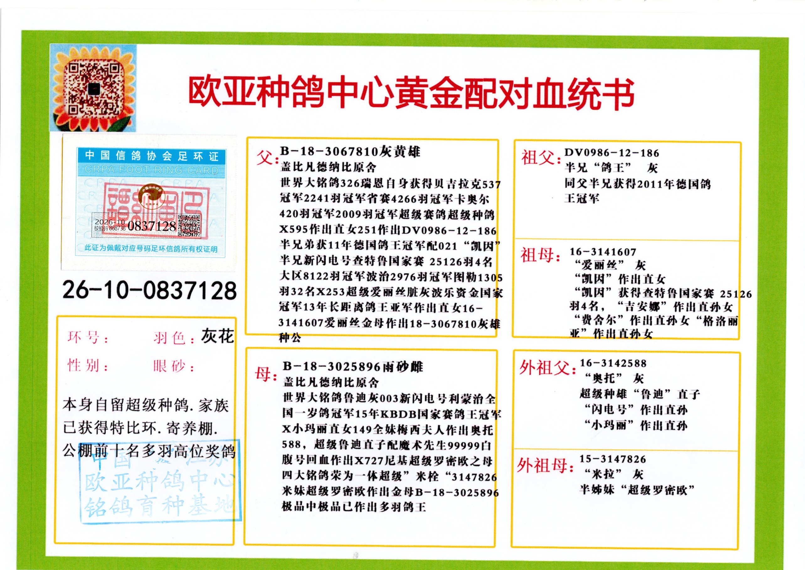 24年秋南京特比环欧亚荣获大团体冠军.小团体冠军551公里大特比13名.14名.16名.19名.20名.21名.24名.26名.27名.28名.42名.52名.54名.57名.65名.66名.68名.70名.71名.72名.74名.76名.80名.82名.83名.84名.85名.86名.90名.92名.110名.116名.121名.122名.128名.131名.158名.161名.164名.165名.166名.172名.174名.177名.182名.195名.196名.201名.205名.208名.210名.216名.253名.269名.275名.276名.294名.296名.299名,,24年秋云南天南铜都公棚决赛415名.天南铜都小棚决赛409名.云南玉活公棚决赛102名.490名.团体32名上笼二羽进二羽,天南铜都大棚506公里决赛445名。热烈祝贺河北省巨鹿县李兰生老师用欧亚泰山号血系连续十一年夺冠军,河北省国家赛冠军.全国季军等多次前十名高位,扬州王军王总用欧亚利奥24年春季获山东翔宇公棚决赛33名盖比53名。南京刘正龙刘总用欧亚盖比获得24年秋山东潍坊国际公棚决赛42名.精英赛30名.三关鸽王71名.决赛86名.加站赛16名.南京市特比环A组鸽王9名.B组鸽王5名.6名.C组鸽王5名.精英赛冠军4名.技能赛A组冠军4名.5名.秦淮区特比环荣获15名.46名.48名.87名。四川西昌徐亮徐总用欧亚利奥获得凉山州聚友决赛177名.第二关亚军双关鸽王19名.三关鸽王105名.云南豪庭公棚决赛603名。热烈祝贺24年四川重庆翔园鸽舍用欧亚泰山号荣获春季400公里冠军.秋季500公里冠军,河北王总用詹森X利奥获得千羽千翔公棚400公里冠军,广东蔡楷焕荣获24年秋爱好者 赛鸽俱乐部三关鸽王季军.一关420公里99名.二关450公里11名.三关520公里32名.单关季军.7名.12名,江西李卫兴荣获贵州红枫公棚8名.共翔俱乐部寄养棚四关综合鸽王30名.一关400公里78名.二关500公里55名.三关520公里37名.四关500公里57名.同父母获公棚18名.雷鸣获得武汉黄浦育翔中心冠军,四川陈文获得四川明鸿俱乐部300公里梦幻2名.3名.4名.9名.10名.13名.14名.15名.31名.34名.40名.41名.42名.43名.69名.71名.72名.73名.74名.94名.95名.97名.98名.99名.419公里决赛荣获总冠军7名.总共归巢9羽,四川徐亮获豪庭决赛603名,山西郑勇获得山西泰鑫公棚决赛255名詹森红狐,热烈祝贺马总获得开尔(飞跃队)决赛9名获奖金1310000万元.第一关52名,天津津福资赛180公里96名.获奖金429543万元,欧亚支持全国鸽友24年秋多人报喜 祝大家取得更好成绩,给欧亚报喜鸽友欧亚决定给每人赠送一羽超级种鸽。欧亚俱乐部特比环多关鸽王成绩:15年秋淮安特比环黑色星期一全会上笼9700多羽,当天无鸽归巢,第二天全会归巢357羽,本舍归巢158羽.前十名八羽.前一百名归巢57羽,16年春季获五关鸽王总冠军,总亚军四名.六名.七名.九名.十名.晶艺俱乐部520公里冠亚季军5名.6名.7名.9名.11名等,火车头冠军.季军6名.8名.9名.10名,16年秋晶艺俱乐部特比环520公里亚军.季军4名.6名.7名.9名,15年春南京白下特比环冠军.亚军.季军6名.7名.8名.9名.10名.指定鸽A B组获得冠军.亚军.季军4名.5名.,17年淮安特比环亚军.4名.5名.7名.8名.10名.六关鸽王总冠军.4名.6名.9名.10名,寄养棚宿迁刘总20羽特比环获冠军.季军.4名.7名.8名.9名等。18年荣获万羽特比环六关鸽王总冠军.总亚军.总季军.6名.8名.十名.单关四羽冠军.二羽亚军.四羽季军.前十名27羽。19年秋万羽特比环六关鸽王总亚军.总季军.5名.8名等,单关二羽冠军.三羽亚军.一羽季军前十名31羽。20年秋淮安市鸽会四关特比环大赛风雨无阻鸽王亚军.鸽王六名,金品俱乐部万羽特比环六关鸽王总冠军,总亚军.四名.五名.六名.七名.八名.十名.前二百名鸽王35羽,单关冠亚季军前十名四十多羽,火车头五关鸽王季军.六名.八名.前二百名鸽王十七羽。20年春荣获淮安五区一市四关鸽王总冠军.亚军.四名.八名.九名。21年秋荣获金品万羽特比环大赛六关鸽王总亚军.总季军.四名.七名.九名.十名.单关冠亚军季军前十名三十多羽。火车头协会鸽王六名.七名.十名.单关前十名十七羽。22年秋荣获鸽王总冠军.总亚军.5名.7名.8名.9名.11名.单关冠亚季军前十名三十多羽,第一关单关前二百名四十多羽,第二关前二百名三十多羽,第三关前二百名四十多羽,第四关前二百名四十多羽,第五关前一百名53羽。23年秋荣获鸽王季军.五名.八名.十名.13名.17名.20名.27名等多羽鸽王.单关前十名二十多羽。公棚.寄养棚部分成绩:16年秋宁夏黄河公棚总冠军电脑戈马力指定通炮冠军,17年送八羽参赛获得鸽王八名进奖四名,支持韩总荣获八名。支持鸽友荣获宁夏中卫公棚决赛总冠军.精英赛冠军,支持18年宁夏黄河公棚决赛冠军詹森X泰山。安徽鼎博寄养棚院内外四关鸽王总冠军.鸽王十七名.三十七名同窝,鸽王39名.42名.58名.67名。18年山东公棚预赛冠军.决赛65名.送八羽进奖五羽.指定获奔驰汽车一辆。支持鸽友获得云南蓝云公棚冠军.盖比X佛卡门。支持鸽友荣获云南银集公棚决赛冠军 詹森427X520血系 速度赛6700羽冠军。17年荣获金马俱乐部寄养棚四关鸽王总冠军.季军.六名.八名.第一关冠军.亚军.季军四名.七名.十一名.金牌教练奖。支持鸽友18年北京费翔公棚预赛九名电脑X桑杰士,支持鸽友荣获陕西威力公棚决赛11名.内蒙古临河寄养棚四关鸽王六名.詹森配泰山,支持河北王总用欧亚詹森427配胡本喜获20年秋开尔青年棚季军。云南东荣公棚16年预赛冠军.决赛77名.17年决赛12名.詹森红狐X泰山,17年平安公棚决赛4名 詹森427。欧亚获得21年金母寄养棚第一关四名.第二关5名.第三关5名.6名.7名.10名.三关鸽王总冠军,四关鸽王14名.十羽鸽王。支持河