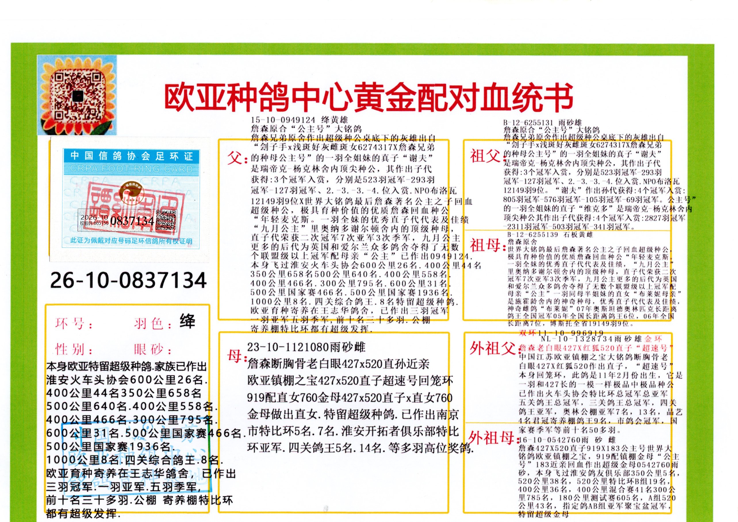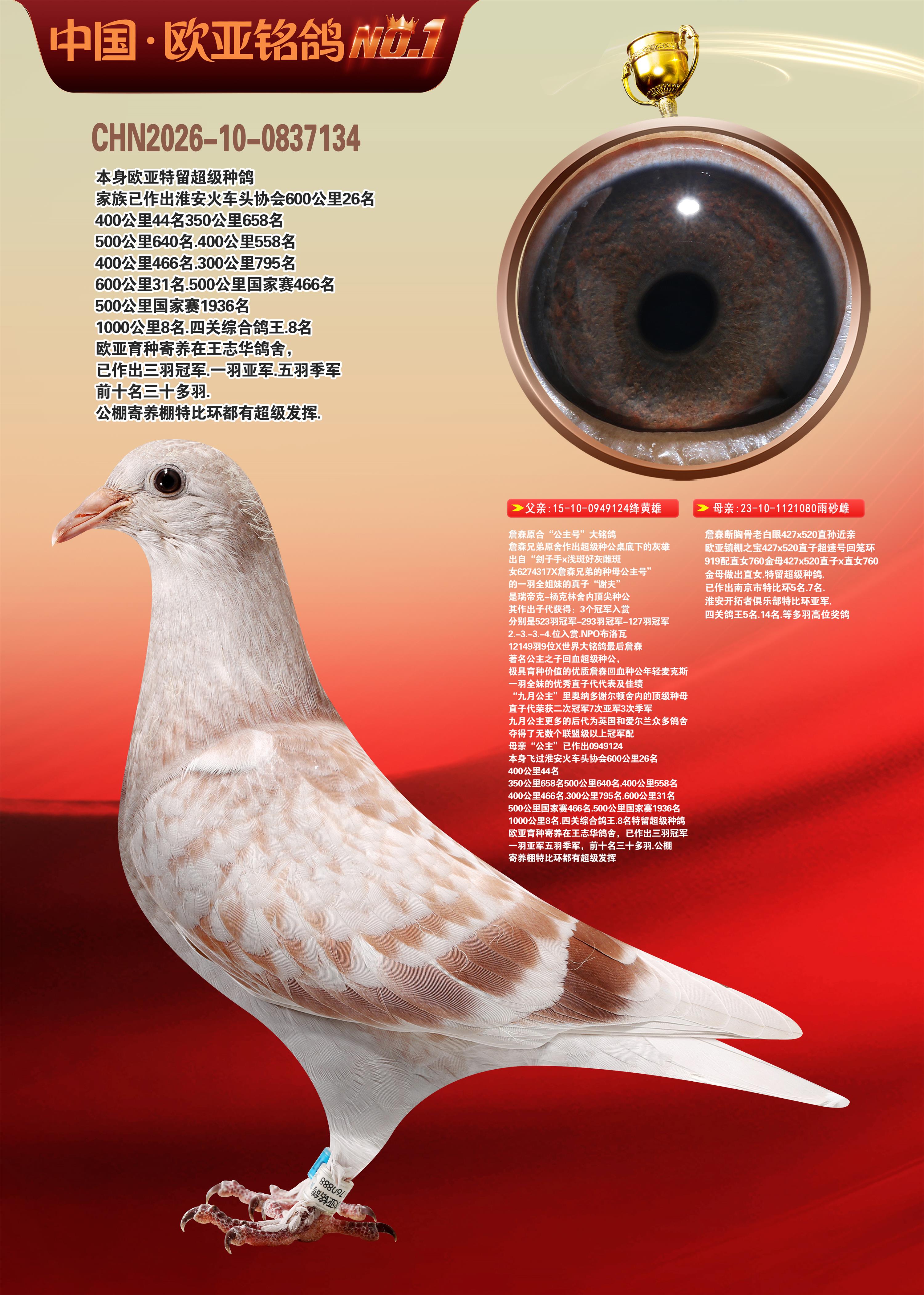 24年秋南京特比环欧亚荣获大团体冠军.小团体冠军551公里大特比13名.14名.16名.19名.20名.21名.24名.26名.27名.28名.42名.52名.54名.57名.65名.66名.68名.70名.71名.72名.74名.76名.80名.82名.83名.84名.85名.86名.90名.92名.110名.116名.121名.122名.128名.131名.158名.161名.164名.165名.166名.172名.174名.177名.182名.195名.196名.201名.205名.208名.210名.216名.253名.269名.275名.276名.294名.296名.299名,,24年秋云南天南铜都公棚决赛415名.天南铜都小棚决赛409名.云南玉活公棚决赛102名.490名.团体32名上笼二羽进二羽,天南铜都大棚506公里决赛445名。热烈祝贺河北省巨鹿县李兰生老师用欧亚泰山号血系连续十一年夺冠军,河北省国家赛冠军.全国季军等多次前十名高位,扬州王军王总用欧亚利奥24年春季获山东翔宇公棚决赛33名盖比53名。南京刘正龙刘总用欧亚盖比获得24年秋山东潍坊国际公棚决赛42名.精英赛30名.三关鸽王71名.决赛86名.加站赛16名.南京市特比环A组鸽王9名.B组鸽王5名.6名.C组鸽王5名.精英赛冠军4名.技能赛A组冠军4名.5名.秦淮区特比环荣获15名.46名.48名.87名。四川西昌徐亮徐总用欧亚利奥获得凉山州聚友决赛177名.第二关亚军双关鸽王19名.三关鸽王105名.云南豪庭公棚决赛603名。热烈祝贺24年四川重庆翔园鸽舍用欧亚泰山号荣获春季400公里冠军.秋季500公里冠军,河北王总用詹森X利奥获得千羽千翔公棚400公里冠军,广东蔡楷焕荣获24年秋爱好者 赛鸽俱乐部三关鸽王季军.一关420公里99名.二关450公里11名.三关520公里32名.单关季军.7名.12名,江西李卫兴荣获贵州红枫公棚8名.共翔俱乐部寄养棚四关综合鸽王30名.一关400公里78名.二关500公里55名.三关520公里37名.四关500公里57名.同父母获公棚18名.雷鸣获得武汉黄浦育翔中心冠军,四川陈文获得四川明鸿俱乐部300公里梦幻2名.3名.4名.9名.10名.13名.14名.15名.31名.34名.40名.41名.42名.43名.69名.71名.72名.73名.74名.94名.95名.97名.98名.99名.419公里决赛荣获总冠军7名.总共归巢9羽,四川徐亮获豪庭决赛603名,山西郑勇获得山西泰鑫公棚决赛255名詹森红狐,热烈祝贺马总获得开尔(飞跃队)决赛9名获奖金1310000万元.第一关52名,天津津福资赛180公里96名.获奖金429543万元,欧亚支持全国鸽友24年秋多人报喜 祝大家取得更好成绩,给欧亚报喜鸽友欧亚决定给每人赠送一羽超级种鸽。欧亚俱乐部特比环多关鸽王成绩:15年秋淮安特比环黑色星期一全会上笼9700多羽,当天无鸽归巢,第二天全会归巢357羽,本舍归巢158羽.前十名八羽.前一百名归巢57羽,16年春季获五关鸽王总冠军,总亚军四名.六名.七名.九名.十名.晶艺俱乐部520公里冠亚季军5名.6名.7名.9名.11名等,火车头冠军.季军6名.8名.9名.10名,16年秋晶艺俱乐部特比环520公里亚军.季军4名.6名.7名.9名,15年春南京白下特比环冠军.亚军.季军6名.7名.8名.9名.10名.指定鸽A B组获得冠军.亚军.季军4名.5名.,17年淮安特比环亚军.4名.5名.7名.8名.10名.六关鸽王总冠军.4名.6名.9名.10名,寄养棚宿迁刘总20羽特比环获冠军.季军.4名.7名.8名.9名等。18年荣获万羽特比环六关鸽王总冠军.总亚军.总季军.6名.8名.十名.单关四羽冠军.二羽亚军.四羽季军.前十名27羽。19年秋万羽特比环六关鸽王总亚军.总季军.5名.8名等,单关二羽冠军.三羽亚军.一羽季军前十名31羽。20年秋淮安市鸽会四关特比环大赛风雨无阻鸽王亚军.鸽王六名,金品俱乐部万羽特比环六关鸽王总冠军,总亚军.四名.五名.六名.七名.八名.十名.前二百名鸽王35羽,单关冠亚季军前十名四十多羽,火车头五关鸽王季军.六名.八名.前二百名鸽王十七羽。20年春荣获淮安五区一市四关鸽王总冠军.亚军.四名.八名.九名。21年秋荣获金品万羽特比环大赛六关鸽王总亚军.总季军.四名.七名.九名.十名.单关冠亚军季军前十名三十多羽。火车头协会鸽王六名.七名.十名.单关前十名十七羽。22年秋荣获鸽王总冠军.总亚军.5名.7名.8名.9名.11名.单关冠亚季军前十名三十多羽,第一关单关前二百名四十多羽,第二关前二百名三十多羽,第三关前二百名四十多羽,第四关前二百名四十多羽,第五关前一百名53羽。23年秋荣获鸽王季军.五名.八名.十名.13名.17名.20名.27名等多羽鸽王.单关前十名二十多羽。公棚.寄养棚部分成绩:16年秋宁夏黄河公棚总冠军电脑戈马力指定通炮冠军,17年送八羽参赛获得鸽王八名进奖四名,支持韩总荣获八名。支持鸽友荣获宁夏中卫公棚决赛总冠军.精英赛冠军,支持18年宁夏黄河公棚决赛冠军詹森X泰山。安徽鼎博寄养棚院内外四关鸽王总冠军.鸽王十七名.三十七名同窝,鸽王39名.42名.58名.67名。18年山东公棚预赛冠军.决赛65名.送八羽进奖五羽.指定获奔驰汽车一辆。支持鸽友获得云南蓝云公棚冠军.盖比X佛卡门。支持鸽友荣获云南银集公棚决赛冠军 詹森427X520血系 速度赛6700羽冠军。17年荣获金马俱乐部寄养棚四关鸽王总冠军.季军.六名.八名.第一关冠军.亚军.季军四名.七名.十一名.金牌教练奖。支持鸽友18年北京费翔公棚预赛九名电脑X桑杰士,支持鸽友荣获陕西威力公棚决赛11名.内蒙古临河寄养棚四关鸽王六名.詹森配泰山,支持河北王总用欧亚詹森427配胡本喜获20年秋开尔青年棚季军。云南东荣公棚16年预赛冠军.决赛77名.17年决赛12名.詹森红狐X泰山,17年平安公棚决赛4名 詹森427。欧亚获得21年金母寄养棚第一关四名.第二关5名.第三关5名.6名.7名.10名.三关鸽王总冠军,四关鸽王14名.十羽鸽王。支持河