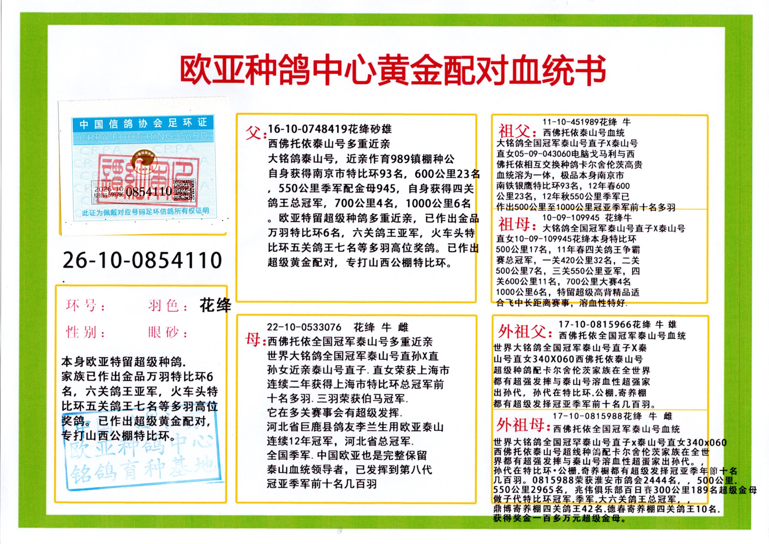 24年秋南京特比环欧亚荣获大团体冠军.小团体冠军551公里大特比13名.14名.16名.19名.20名.21名.24名.26名.27名.28名.42名.52名.54名.57名.65名.66名.68名.70名.71名.72名.74名.76名.80名.82名.83名.84名.85名.86名.90名.92名.110名.116名.121名.122名.128名.131名.158名.161名.164名.165名.166名.172名.174名.177名.182名.195名.196名.201名.205名.208名.210名.216名.253名.269名.275名.276名.294名.296名.299名,,24年秋云南天南铜都公棚决赛415名.天南铜都小棚决赛409名.云南玉活公棚决赛102名.490名.团体32名上笼二羽进二羽,天南铜都大棚506公里决赛445名。热烈祝贺河北省巨鹿县李兰生老师用欧亚泰山号血系连续十一年夺冠军,河北省国家赛冠军.全国季军等多次前十名高位,扬州王军王总用欧亚利奥24年春季获山东翔宇公棚决赛33名盖比53名。南京刘正龙刘总用欧亚盖比获得24年秋山东潍坊国际公棚决赛42名.精英赛30名.三关鸽王71名.决赛86名.加站赛16名.南京市特比环A组鸽王9名.B组鸽王5名.6名.C组鸽王5名.精英赛冠军4名.技能赛A组冠军4名.5名.秦淮区特比环荣获15名.46名.48名.87名。四川西昌徐亮徐总用欧亚利奥获得凉山州聚友决赛177名.第二关亚军双关鸽王19名.三关鸽王105名.云南豪庭公棚决赛603名。热烈祝贺24年四川重庆翔园鸽舍用欧亚泰山号荣获春季400公里冠军.秋季500公里冠军,河北王总用詹森X利奥获得千羽千翔公棚400公里冠军,广东蔡楷焕荣获24年秋爱好者 赛鸽俱乐部三关鸽王季军.一关420公里99名.二关450公里11名.三关520公里32名.单关季军.7名.12名,江西李卫兴荣获贵州红枫公棚8名.共翔俱乐部寄养棚四关综合鸽王30名.一关400公里78名.二关500公里55名.三关520公里37名.四关500公里57名.同父母获公棚18名.雷鸣获得武汉黄浦育翔中心冠军,四川陈文获得四川明鸿俱乐部300公里梦幻2名.3名.4名.9名.10名.13名.14名.15名.31名.34名.40名.41名.42名.43名.69名.71名.72名.73名.74名.94名.95名.97名.98名.99名.419公里决赛荣获总冠军7名.总共归巢9羽,四川徐亮获豪庭决赛603名,山西郑勇获得山西泰鑫公棚决赛255名詹森红狐,热烈祝贺马总获得开尔(飞跃队)决赛9名获奖金1310000万元.第一关52名,天津津福资赛180公里96名.获奖金429543万元,欧亚支持全国鸽友24年秋多人报喜 祝大家取得更好成绩,给欧亚报喜鸽友欧亚决定给每人赠送一羽超级种鸽。欧亚俱乐部特比环多关鸽王成绩:15年秋淮安特比环黑色星期一全会上笼9700多羽,当天无鸽归巢,第二天全会归巢357羽,本舍归巢158羽.前十名八羽.前一百名归巢57羽,16年春季获五关鸽王总冠军,总亚军四名.六名.七名.九名.十名.晶艺俱乐部520公里冠亚季军5名.6名.7名.9名.11名等,火车头冠军.季军6名.8名.9名.10名,16年秋晶艺俱乐部特比环520公里亚军.季军4名.6名.7名.9名,15年春南京白下特比环冠军.亚军.季军6名.7名.8名.9名.10名.指定鸽A B组获得冠军.亚军.季军4名.5名.,17年淮安特比环亚军.4名.5名.7名.8名.10名.六关鸽王总冠军.4名.6名.9名.10名,寄养棚宿迁刘总20羽特比环获冠军.季军.4名.7名.8名.9名等。18年荣获万羽特比环六关鸽王总冠军.总亚军.总季军.6名.8名.十名.单关四羽冠军.二羽亚军.四羽季军.前十名27羽。19年秋万羽特比环六关鸽王总亚军.总季军.5名.8名等,单关二羽冠军.三羽亚军.一羽季军前十名31羽。20年秋淮安市鸽会四关特比环大赛风雨无阻鸽王亚军.鸽王六名,金品俱乐部万羽特比环六关鸽王总冠军,总亚军.四名.五名.六名.七名.八名.十名.前二百名鸽王35羽,单关冠亚季军前十名四十多羽,火车头五关鸽王季军.六名.八名.前二百名鸽王十七羽。20年春荣获淮安五区一市四关鸽王总冠军.亚军.四名.八名.九名。21年秋荣获金品万羽特比环大赛六关鸽王总亚军.总季军.四名.七名.九名.十名.单关冠亚军季军前十名三十多羽。火车头协会鸽王六名.七名.十名.单关前十名十七羽。22年秋荣获鸽王总冠军.总亚军.5名.7名.8名.9名.11名.单关冠亚季军前十名三十多羽,第一关单关前二百名四十多羽,第二关前二百名三十多羽,第三关前二百名四十多羽,第四关前二百名四十多羽,第五关前一百名53羽。23年秋荣获鸽王季军.五名.八名.十名.13名.17名.20名.27名等多羽鸽王.单关前十名二十多羽。公棚.寄养棚部分成绩:16年秋宁夏黄河公棚总冠军电脑戈马力指定通炮冠军,17年送八羽参赛获得鸽王八名进奖四名,支持韩总荣获八名。支持鸽友荣获宁夏中卫公棚决赛总冠军.精英赛冠军,支持18年宁夏黄河公棚决赛冠军詹森X泰山。安徽鼎博寄养棚院内外四关鸽王总冠军.鸽王十七名.三十七名同窝,鸽王39名.42名.58名.67名。18年山东公棚预赛冠军.决赛65名.送八羽进奖五羽.指定获奔驰汽车一辆。支持鸽友获得云南蓝云公棚冠军.盖比X佛卡门。支持鸽友荣获云南银集公棚决赛冠军 詹森427X520血系 速度赛6700羽冠军。17年荣获金马俱乐部寄养棚四关鸽王总冠军.季军.六名.八名.第一关冠军.亚军.季军四名.七名.十一名.金牌教练奖。支持鸽友18年北京费翔公棚预赛九名电脑X桑杰士,支持鸽友荣获陕西威力公棚决赛11名.内蒙古临河寄养棚四关鸽王六名.詹森配泰山,支持河北王总用欧亚詹森427配胡本喜获20年秋开尔青年棚季军。云南东荣公棚16年预赛冠军.决赛77名.17年决赛12名.詹森红狐X泰山,17年平安公棚决赛4名 詹森427。欧亚获得21年金母寄养棚第一关四名.第二关5名.第三关5名.6名.7名.10名.三关鸽王总冠军,四关鸽王14名.十羽鸽王。支持河
