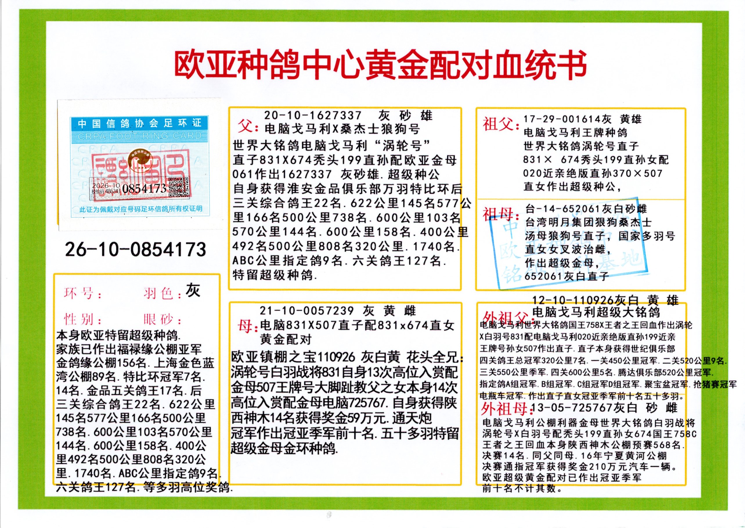 24年秋南京特比环欧亚荣获大团体冠军.小团体冠军551公里大特比13名.14名.16名.19名.20名.21名.24名.26名.27名.28名.42名.52名.54名.57名.65名.66名.68名.70名.71名.72名.74名.76名.80名.82名.83名.84名.85名.86名.90名.92名.110名.116名.121名.122名.128名.131名.158名.161名.164名.165名.166名.172名.174名.177名.182名.195名.196名.201名.205名.208名.210名.216名.253名.269名.275名.276名.294名.296名.299名,,24年秋云南天南铜都公棚决赛415名.天南铜都小棚决赛409名.云南玉活公棚决赛102名.490名.团体32名上笼二羽进二羽,天南铜都大棚506公里决赛445名。热烈祝贺河北省巨鹿县李兰生老师用欧亚泰山号血系连续十一年夺冠军,河北省国家赛冠军.全国季军等多次前十名高位,扬州王军王总用欧亚利奥24年春季获山东翔宇公棚决赛33名盖比53名。南京刘正龙刘总用欧亚盖比获得24年秋山东潍坊国际公棚决赛42名.精英赛30名.三关鸽王71名.决赛86名.加站赛16名.南京市特比环A组鸽王9名.B组鸽王5名.6名.C组鸽王5名.精英赛冠军4名.技能赛A组冠军4名.5名.秦淮区特比环荣获15名.46名.48名.87名。四川西昌徐亮徐总用欧亚利奥获得凉山州聚友决赛177名.第二关亚军双关鸽王19名.三关鸽王105名.云南豪庭公棚决赛603名。热烈祝贺24年四川重庆翔园鸽舍用欧亚泰山号荣获春季400公里冠军.秋季500公里冠军,河北王总用詹森X利奥获得千羽千翔公棚400公里冠军,广东蔡楷焕荣获24年秋爱好者 赛鸽俱乐部三关鸽王季军.一关420公里99名.二关450公里11名.三关520公里32名.单关季军.7名.12名,江西李卫兴荣获贵州红枫公棚8名.共翔俱乐部寄养棚四关综合鸽王30名.一关400公里78名.二关500公里55名.三关520公里37名.四关500公里57名.同父母获公棚18名.雷鸣获得武汉黄浦育翔中心冠军,四川陈文获得四川明鸿俱乐部300公里梦幻2名.3名.4名.9名.10名.13名.14名.15名.31名.34名.40名.41名.42名.43名.69名.71名.72名.73名.74名.94名.95名.97名.98名.99名.419公里决赛荣获总冠军7名.总共归巢9羽,四川徐亮获豪庭决赛603名,山西郑勇获得山西泰鑫公棚决赛255名詹森红狐,热烈祝贺马总获得开尔(飞跃队)决赛9名获奖金1310000万元.第一关52名,天津津福资赛180公里96名.获奖金429543万元,欧亚支持全国鸽友24年秋多人报喜 祝大家取得更好成绩,给欧亚报喜鸽友欧亚决定给每人赠送一羽超级种鸽。欧亚俱乐部特比环多关鸽王成绩:15年秋淮安特比环黑色星期一全会上笼9700多羽,当天无鸽归巢,第二天全会归巢357羽,本舍归巢158羽.前十名八羽.前一百名归巢57羽,16年春季获五关鸽王总冠军,总亚军四名.六名.七名.九名.十名.晶艺俱乐部520公里冠亚季军5名.6名.7名.9名.11名等,火车头冠军.季军6名.8名.9名.10名,16年秋晶艺俱乐部特比环520公里亚军.季军4名.6名.7名.9名,15年春南京白下特比环冠军.亚军.季军6名.7名.8名.9名.10名.指定鸽A B组获得冠军.亚军.季军4名.5名.,17年淮安特比环亚军.4名.5名.7名.8名.10名.六关鸽王总冠军.4名.6名.9名.10名,寄养棚宿迁刘总20羽特比环获冠军.季军.4名.7名.8名.9名等。18年荣获万羽特比环六关鸽王总冠军.总亚军.总季军.6名.8名.十名.单关四羽冠军.二羽亚军.四羽季军.前十名27羽。19年秋万羽特比环六关鸽王总亚军.总季军.5名.8名等,单关二羽冠军.三羽亚军.一羽季军前十名31羽。20年秋淮安市鸽会四关特比环大赛风雨无阻鸽王亚军.鸽王六名,金品俱乐部万羽特比环六关鸽王总冠军,总亚军.四名.五名.六名.七名.八名.十名.前二百名鸽王35羽,单关冠亚季军前十名四十多羽,火车头五关鸽王季军.六名.八名.前二百名鸽王十七羽。20年春荣获淮安五区一市四关鸽王总冠军.亚军.四名.八名.九名。21年秋荣获金品万羽特比环大赛六关鸽王总亚军.总季军.四名.七名.九名.十名.单关冠亚军季军前十名三十多羽。火车头协会鸽王六名.七名.十名.单关前十名十七羽。22年秋荣获鸽王总冠军.总亚军.5名.7名.8名.9名.11名.单关冠亚季军前十名三十多羽,第一关单关前二百名四十多羽,第二关前二百名三十多羽,第三关前二百名四十多羽,第四关前二百名四十多羽,第五关前一百名53羽。23年秋荣获鸽王季军.五名.八名.十名.13名.17名.20名.27名等多羽鸽王.单关前十名二十多羽。公棚.寄养棚部分成绩:16年秋宁夏黄河公棚总冠军电脑戈马力指定通炮冠军,17年送八羽参赛获得鸽王八名进奖四名,支持韩总荣获八名。支持鸽友荣获宁夏中卫公棚决赛总冠军.精英赛冠军,支持18年宁夏黄河公棚决赛冠军詹森X泰山。安徽鼎博寄养棚院内外四关鸽王总冠军.鸽王十七名.三十七名同窝,鸽王39名.42名.58名.67名。18年山东公棚预赛冠军.决赛65名.送八羽进奖五羽.指定获奔驰汽车一辆。支持鸽友获得云南蓝云公棚冠军.盖比X佛卡门。支持鸽友荣获云南银集公棚决赛冠军 詹森427X520血系 速度赛6700羽冠军。17年荣获金马俱乐部寄养棚四关鸽王总冠军.季军.六名.八名.第一关冠军.亚军.季军四名.七名.十一名.金牌教练奖。支持鸽友18年北京费翔公棚预赛九名电脑X桑杰士,支持鸽友荣获陕西威力公棚决赛11名.内蒙古临河寄养棚四关鸽王六名.詹森配泰山,支持河北王总用欧亚詹森427配胡本喜获20年秋开尔青年棚季军。云南东荣公棚16年预赛冠军.决赛77名.17年决赛12名.詹森红狐X泰山,17年平安公棚决赛4名 詹森427。欧亚获得21年金母寄养棚第一关四名.第二关5名.第三关5名.6名.7名.10名.三关鸽王总冠军,四关鸽王14名.十羽鸽王。支持河