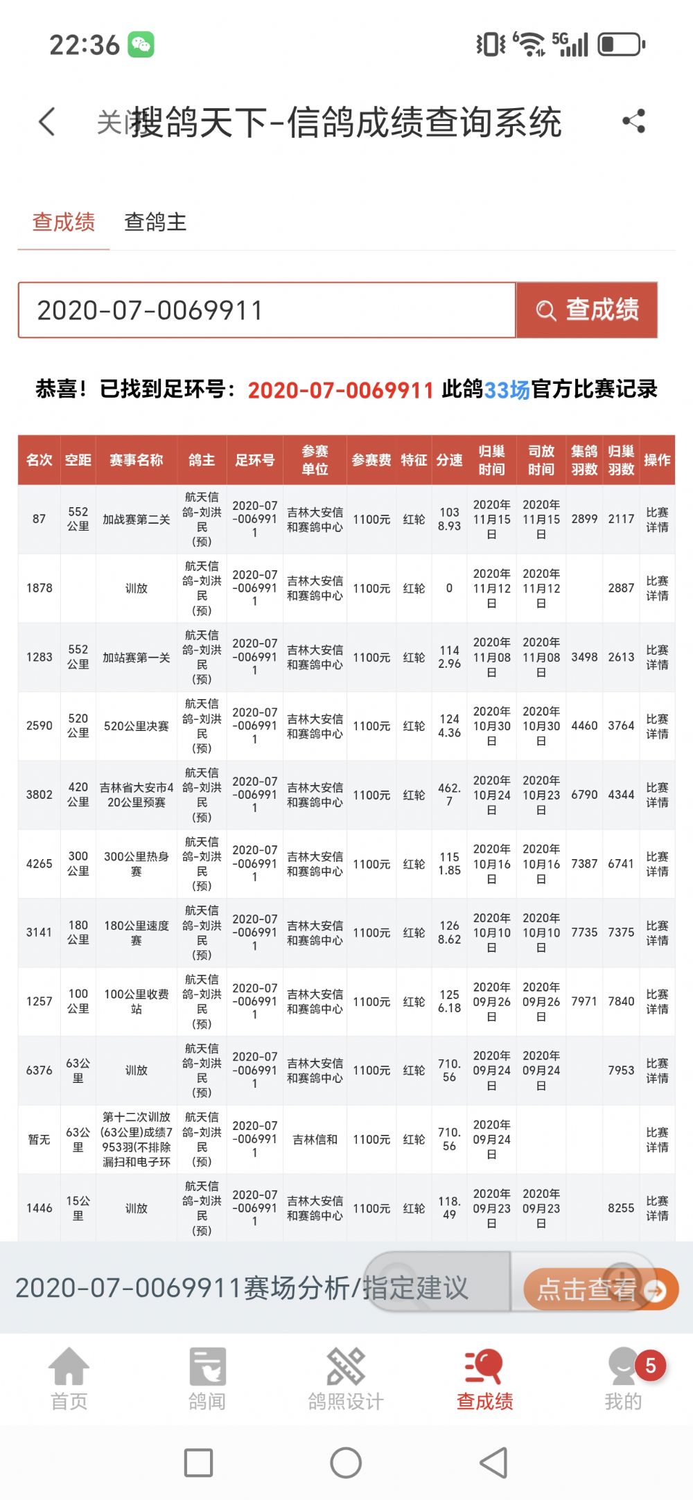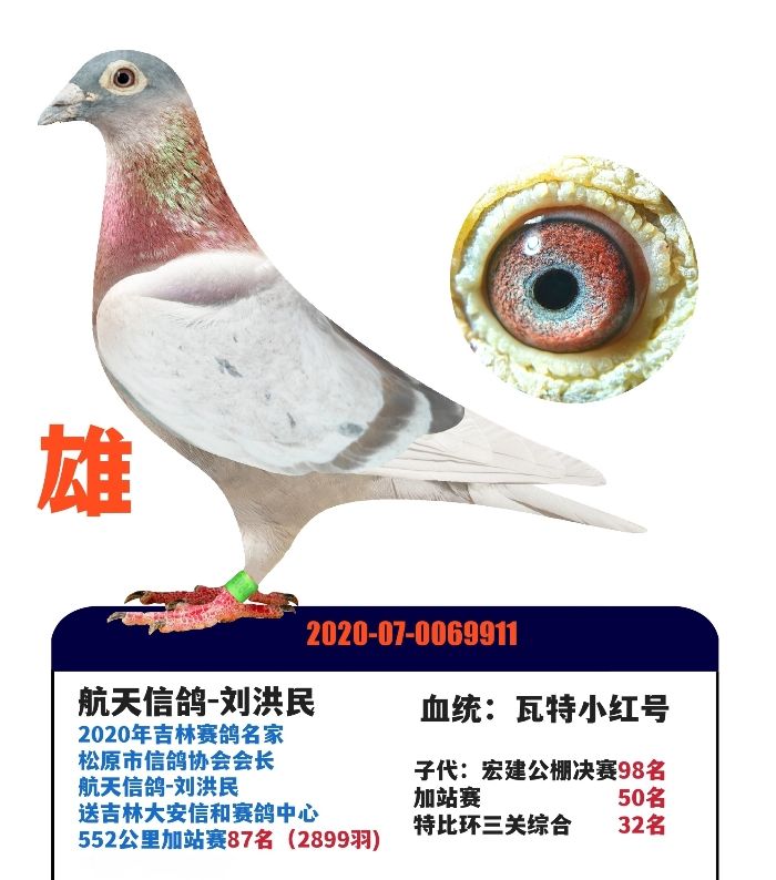 2020年吉林赛鸽名家,松原市信鸽协会会长,航天信鸽-刘洪民,送吉林大安信和赛鸽中心,552公里加站赛87名(2899羽),雄,血统,小红号。