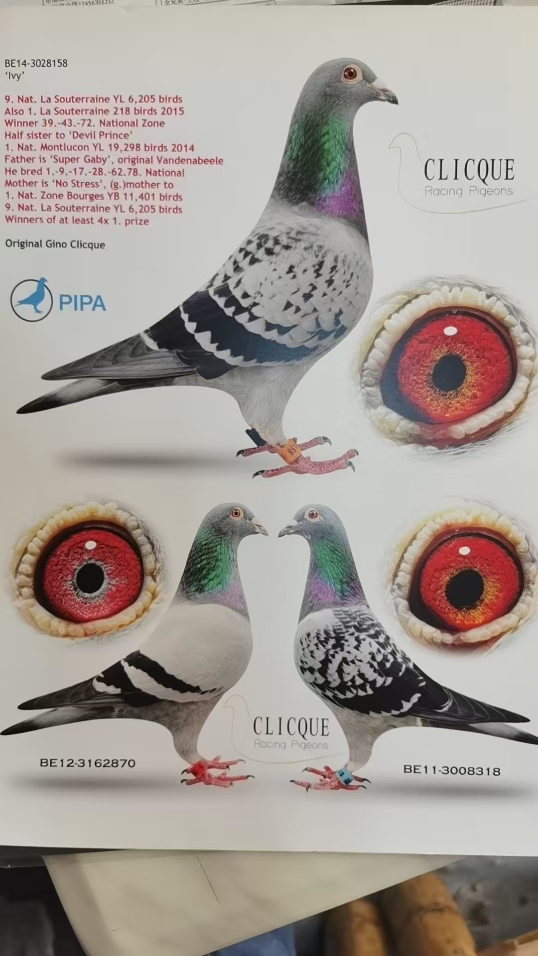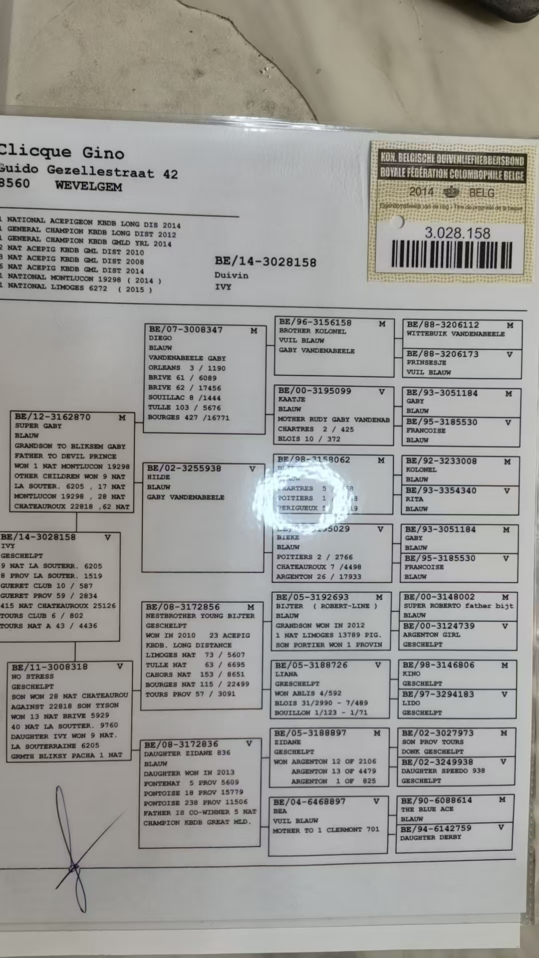 盖比. 凡德纳比(Gaby Vandenabeele)当之无愧是近代鸽坛最具影响力的一代宗师,于2018年的全舍拍卖更成为当年鸽界的一大盛事,如今传奇落幕,但他的鸽系的传奇从未止步。过去是,现在是,将来还是!提及到盖比我们耳熟能详的名鸽不外乎于“娇小号”、“上校号”、“闪电号”、“鲁迪”、“年轻闪电号”、“超级罗密欧”、“新闪电号”等等,而在盖比鸽系里有一羽世界级的超级种公却未能被大家熟知,它的子孙后代赢得全国冠军,KBDB全国鸽王冠军,KBDB全国赛前10位不下20羽。究竟是什么鸽子这么厉害或是不够厉害?而让大多数鸽友却不知道?让我们来一探其究竟!源起:克里克·吉诺在2012-2013年大量引进盖比超顶尖种鸽的子代,这次的引进让吉诺的赛鸽生涯有了质的飞跃。其中有一羽雄鸽足环号:BE12-3162870, 出生豪门贵族,待成年后直接进入种鸽舍,并给它起名为“超级盖比”。它的血统包含了早中期最顶尖的名鸽于一身,而且近亲作育的方法极具育种风范。“超级盖比”的父亲名叫“迭戈”自身赢得过奥尔良1190羽季军,布瑞福全国17456羽62位;苏雅克全国7597羽106位,图勒全国5676羽103位,它出自“上校号全弟”(名鸽“闪电号”的叔叔)x“小卡特雌”(世界名鸽“鲁迪”的母亲),从父亲来说“迭戈”是”“闪电号”叔叔x“鲁迪”妈妈,也就是“迭戈”是世界名鸽“鲁迪”的同母半弟,但看“迭戈”血统似乎缺少了“闪电号”的存在,而盖比给刚刚好给它配上了“闪电号”x“小碧”的直女“希尔德”,直观看就是表兄妹的近亲,把“小卡特雌”和它最好的亲姐姐“小碧”(7次冠军)都汇集于一身,作为“超级盖比”的祖母和外祖母, 进一步研究“超级盖比”的祖父是“上校号全弟”而外祖父是“闪电号”,而“上校号全弟”和“闪电号”又是叔侄关系。这张血统保持近亲的同时,增强了耐力加入了“闪电号”,也让血统变得更多元化,增加了基础品系的宽容度。这张血统表极具艺术,因此也耐人寻味。