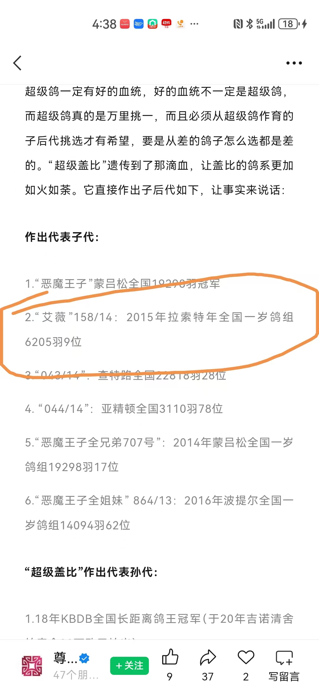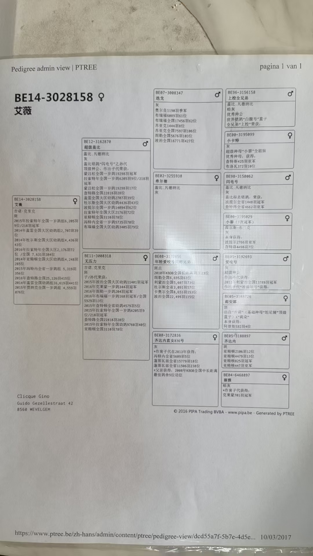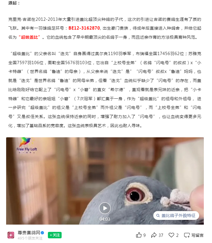 【名鸽】盖比世界级传奇种公“超级盖比” 的诞生 世界级超级种公“超级盖比”超级盖比血统苹果就落在苹果树下世界级超级种公“超级盖比”超级鸽一定有好的血统,好的血统不一定是超级鸽,而超级鸽真的是万里挑一,而且必须从超级鸽作育的子后代挑选才有希望,要是从差的鸽子怎么选都是差的。“超级盖比”遗传到了那滴血,让盖比的鸽系更加如火如荼。它直接作出子后代如下,让事实来说话:作出代表子代:1.“恶魔王子”蒙吕松全国19298羽冠军2.“艾薇”158/14:2015年拉索特年全国一岁鸽组6205羽9位3.“043/14”:查特路全国22818羽28位4. “044/14”:亚精顿全国3110羽78位5.“恶魔王子全兄弟707号”:2014年蒙吕松全国一岁鸽组19298羽17位 6.“恶魔王子全姐妹” 864/13:2016年波提尔全国一岁鸽组14094羽62位“超级盖比”作出代表孙代:1.18年KBDB全国长距离鸽王冠军(于20年吉诺清舍拍卖会30万欧元拍出)2.19年KBDB全国长距离鸽王7位3.18年KBDB全国大中距离鸽王11位4.18年KBDB全国大中距离鸽王13位5. “恶魔048号”:雅納克全国5117羽8位6. "恶魔399号":亚精顿全国16762羽10位/查特鲁省赛3472羽10位“超级盖比”代表曾孙代:1.“18-029”图尔全国7155羽4位2.“18-028”亚精顿省赛4190羽冠军/亚精顿全国16496羽亚军3."007"查特鲁省赛3608羽冠军4.“18-249”20年KBDB长距离全国鸽王21位5.“18-221”20年KBDB长距离全国鸽王23位“超级盖比”在清舍拍卖会被任飞翔鸽业重金引进,如今在种鸽舍已经扮演重要的角色,因为“超级盖比”年事已高,其子代极其珍贵,它的子代直接进入种鸽舍,我们将让“超级盖比”的孙代驰骋国内外的大赛。“超级盖比”是一羽传奇的种公,它凝聚了盖比数十年的呕心沥血。它的优良基因会代代相传,上演一个又一个盖比传奇。盖比鸽系从未落幕,让我们一起回顾盖比鸽系的核心血脉发展17年清舍前拜访盖比·范德纳比盖比1978年从父亲根特尔·凡德那比手中接过30羽鸽子起家时,父亲只是西弗拉芒省比较著名的中距离冠军。所以,盖比虽然是名字,凡德那比是姓氏,他们的鸽子却以盖比命名。这些鸽子,大体以狄斯美特·马太伊斯、保罗·波斯汀和鲁岑·文斯特拉为基础。起初主要血线包括:“娇小号”。“娇小号”从未比赛直接进入种鸽舍, 配不同的雌鸽作育出一批世界级的赛种鸽,后代发挥极其出色,逐步成为盖比家中主力,渐渐成为奠定盖比王朝的育种核心。它的每一羽代表子代都足以独门成系,另辟江山,让盖比鸽系迅猛成长并开枝散叶于世界不同的赛场。在不同赛场的筛选下, 从100-700公里级别的赛事里盖比鸽系总是屡屡夺魁。尤其是在当日归长距离比赛,天气稍微恶劣一些,侧顶风方向,盖比鸽系高位入赏的概率是非常高的。分速通常在1100-1250米/分会极具优势。由于“娇小号”配不同雌鸽都作育优秀的子代群,盖比再加入其他顶尖的品系混血使翔,然后再用“娇小号”的同父半兄妹子孙后代融合在一起,既保证了品系的特质又让外血巧妙的加入提升自己的鸽系,这样以来, 盖比的王朝在后期保持的既完整又能飞善育。“娇小号”让世界鸽友耳熟能详的代表子代,当之无愧是“白腹号”。“白腹号”随着父亲的足迹,快速建立起自己的“白腹王朝”。“白腹号”是“娇小号”B81-3238253的代表直子,正是依靠这羽鸽子的传奇,为盖比的帝王之国奠定坚不可摧的基石。“白腹号”曾获冠军十二次、亚军六次,是一羽超级赛鸽,亦是继“娇小号”之后的黄金种公,下代入赏无数。其实养鸽人都明白再厉害的鸽子也不能一鸽震天下,传奇赛将或种鸽家族上都凝聚着数羽或几十羽超级的赛种鸽作为坚实的后盾。有时候差之毫厘就是失之千里。“白腹号”配上一羽同血脉超级雌“小公主雌”(Be86-3298661),“小公主雌”一直都被“白腹号”光环所埋没,其实这羽雌鸽实在大有来头。她就是艾迪·夏拉肯闻名天下“丝丝”的亲姐妹。她的血统更是不可小觑。她是“娇小号”另一羽超级直子“皮卡诺”(BE82-3258240)的代表直女,也就是“娇小号”的直孙女,等于说“娇小号”配不同雌作出的直子再配上直孙女的方法,作出超级赛种公“上校号”,“上校号”在盖比鸽系里面其中承上启下的绝对作用,它自身赢得利蒙治2762羽冠军,查特鲁7793羽冠军,奥尔良1413羽亚军等卓越的成绩,随后立即进入种鸽舍,“上校号”是“娇小号”2代x3代的近亲产物,若要用后代打比赛,这时候应该需要杂交混血,盖比给“上校号”引进了一羽比利时长距离高手诺尔·李本斯的招牌雄“活力号”(93年KBDB长距离鸽王冠军)的闺女名为“丽塔”(BE93-3354340)作为配对雌,“活力号”曾赢得蒙托邦全国赛亚军,空距800多公里,极为艰苦的比赛),92年拿邦全国赛6513羽6位(900多公里)正因为这只雌鸽的引进,盖比作育出标志性名鸽“闪迪号”,由于母系是诺尔·李本斯的“活力号”善飞700-950公里级别艰苦的比赛,所以“闪电号” 王朝的开启,在耐力上会更胜一筹。“闪电号”在赛场上大放异彩,结束比赛生涯后,“闪电号”进入种鸽舍,配大量雌鸽作出子代比赛并不是理想,这时候盖比在欧洲也沉默一时。随后盖比引进一羽瑞克·库尔斯的“小卡特雌”(BE-00-3195099)做其配对雌,因为“小卡特雌”有一羽全姐“小碧”(BE00-3195029)自身7次冠军入赏作为佐证,盖比用上也是吃了一颗定心丸。不负众望,“闪电号”x“小卡特雌”作出世界超级种公“鲁迪