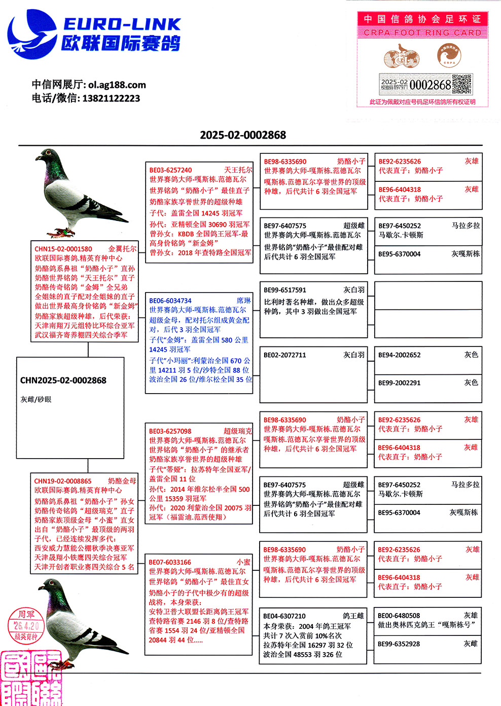- 当前查看拍卖鸽:奶酪世界铭鸽“240”近亲孙女