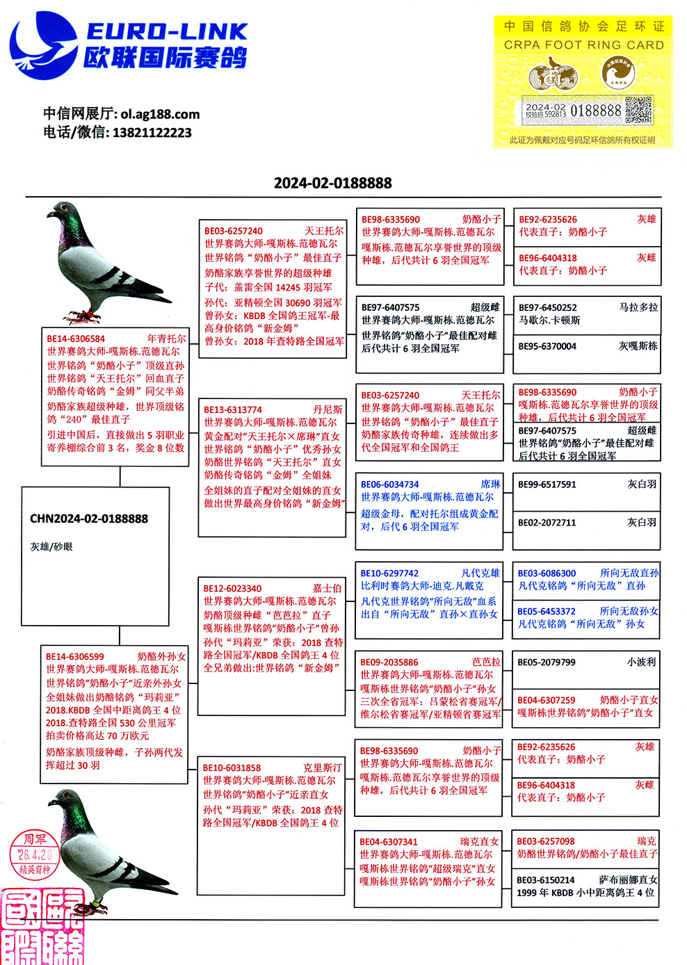 - 当前查看拍卖鸽:奶酪传奇铭鸽“年青托尔”直子