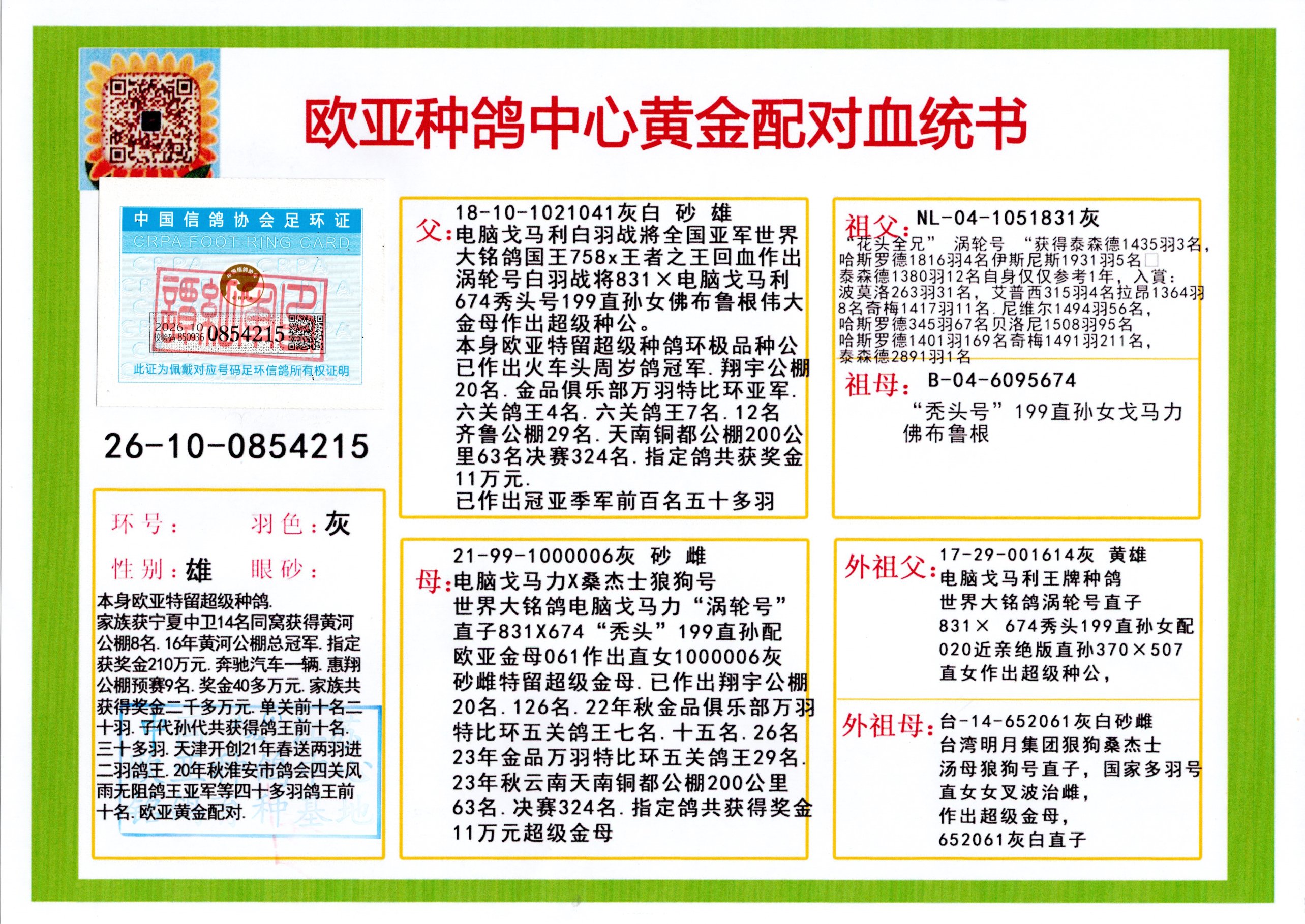 24年秋南京特比环欧亚荣获大团体冠军.小团体冠军551公里大特比13名.14名.16名.19名.20名.21名.24名.26名.27名.28名.42名.52名.54名.57名.65名.66名.68名.70名.71名.72名.74名.76名.80名.82名.83名.84名.85名.86名.90名.92名.110名.116名.121名.122名.128名.131名.158名.161名.164名.165名.166名.172名.174名.177名.182名.195名.196名.201名.205名.208名.210名.216名.253名.269名.275名.276名.294名.296名.299名,,24年秋云南天南铜都公棚决赛415名.天南铜都小棚决赛409名.云南玉活公棚决赛102名.490名.团体32名上笼二羽进二羽,天南铜都大棚506公里决赛445名。热烈祝贺河北省巨鹿县李兰生老师用欧亚泰山号血系连续十一年夺冠军,河北省国家赛冠军.全国季军等多次前十名高位,扬州王军王总用欧亚利奥24年春季获山东翔宇公棚决赛33名盖比53名。南京刘正龙刘总用欧亚盖比获得24年秋山东潍坊国际公棚决赛42名.精英赛30名.三关鸽王71名.决赛86名.加站赛16名.南京市特比环A组鸽王9名.B组鸽王5名.6名.C组鸽王5名.精英赛冠军4名.技能赛A组冠军4名.5名.秦淮区特比环荣获15名.46名.48名.87名。四川西昌徐亮徐总用欧亚利奥获得凉山州聚友决赛177名.第二关亚军双关鸽王19名.三关鸽王105名.云南豪庭公棚决赛603名。热烈祝贺24年四川重庆翔园鸽舍用欧亚泰山号荣获春季400公里冠军.秋季500公里冠军,河北王总用詹森X利奥获得千羽千翔公棚400公里冠军,广东蔡楷焕荣获24年秋爱好者 赛鸽俱乐部三关鸽王季军.一关420公里99名.二关450公里11名.三关520公里32名.单关季军.7名.12名,江西李卫兴荣获贵州红枫公棚8名.共翔俱乐部寄养棚四关综合鸽王30名.一关400公里78名.二关500公里55名.三关520公里37名.四关500公里57名.同父母获公棚18名.雷鸣获得武汉黄浦育翔中心冠军,四川陈文获得四川明鸿俱乐部300公里梦幻2名.3名.4名.9名.10名.13名.14名.15名.31名.34名.40名.41名.42名.43名.69名.71名.72名.73名.74名.94名.95名.97名.98名.99名.419公里决赛荣获总冠军7名.总共归巢9羽,四川徐亮获豪庭决赛603名,山西郑勇获得山西泰鑫公棚决赛255名詹森红狐,热烈祝贺马总获得开尔(飞跃队)决赛9名获奖金1310000万元.第一关52名,天津津福资赛180公里96名.获奖金429543万元,欧亚支持全国鸽友24年秋多人报喜 祝大家取得更好成绩,给欧亚报喜鸽友欧亚决定给每人赠送一羽超级种鸽。欧亚俱乐部特比环多关鸽王成绩:15年秋淮安特比环黑色星期一全会上笼9700多羽,当天无鸽归巢,第二天全会归巢357羽,本舍归巢158羽.前十名八羽.前一百名归巢57羽,16年春季获五关鸽王总冠军,总亚军四名.六名.七名.九名.十名.晶艺俱乐部520公里冠亚季军5名.6名.7名.9名.11名等,火车头冠军.季军6名.8名.9名.10名,16年秋晶艺俱乐部特比环520公里亚军.季军4名.6名.7名.9名,15年春南京白下特比环冠军.亚军.季军6名.7名.8名.9名.10名.指定鸽A B组获得冠军.亚军.季军4名.5名.,17年淮安特比环亚军.4名.5名.7名.8名.10名.六关鸽王总冠军.4名.6名.9名.10名,寄养棚宿迁刘总20羽特比环获冠军.季军.4名.7名.8名.9名等。18年荣获万羽特比环六关鸽王总冠军.总亚军.总季军.6名.8名.十名.单关四羽冠军.二羽亚军.四羽季军.前十名27羽。19年秋万羽特比环六关鸽王总亚军.总季军.5名.8名等,单关二羽冠军.三羽亚军.一羽季军前十名31羽。20年秋淮安市鸽会四关特比环大赛风雨无阻鸽王亚军.鸽王六名,金品俱乐部万羽特比环六关鸽王总冠军,总亚军.四名.五名.六名.七名.八名.十名.前二百名鸽王35羽,单关冠亚季军前十名四十多羽,火车头五关鸽王季军.六名.八名.前二百名鸽王十七羽。20年春荣获淮安五区一市四关鸽王总冠军.亚军.四名.八名.九名。21年秋荣获金品万羽特比环大赛六关鸽王总亚军.总季军.四名.七名.九名.十名.单关冠亚军季军前十名三十多羽。火车头协会鸽王六名.七名.十名.单关前十名十七羽。22年秋荣获鸽王总冠军.总亚军.5名.7名.8名.9名.11名.单关冠亚季军前十名三十多羽,第一关单关前二百名四十多羽,第二关前二百名三十多羽,第三关前二百名四十多羽,第四关前二百名四十多羽,第五关前一百名53羽。23年秋荣获鸽王季军.五名.八名.十名.13名.17名.20名.27名等多羽鸽王.单关前十名二十多羽。公棚.寄养棚部分成绩:16年秋宁夏黄河公棚总冠军电脑戈马力指定通炮冠军,17年送八羽参赛获得鸽王八名进奖四名,支持韩总荣获八名。支持鸽友荣获宁夏中卫公棚决赛总冠军.精英赛冠军,支持18年宁夏黄河公棚决赛冠军詹森X泰山。安徽鼎博寄养棚院内外四关鸽王总冠军.鸽王十七名.三十七名同窝,鸽王39名.42名.58名.67名。18年山东公棚预赛冠军.决赛65名.送八羽进奖五羽.指定获奔驰汽车一辆。支持鸽友获得云南蓝云公棚冠军.盖比X佛卡门。支持鸽友荣获云南银集公棚决赛冠军 詹森427X520血系 速度赛6700羽冠军。17年荣获金马俱乐部寄养棚四关鸽王总冠军.季军.六名.八名.第一关冠军.亚军.季军四名.七名.十一名.金牌教练奖。支持鸽友18年北京费翔公棚预赛九名电脑X桑杰士,支持鸽友荣获陕西威力公棚决赛11名.内蒙古临河寄养棚四关鸽王六名.詹森配泰山,支持河北王总用欧亚詹森427配胡本喜获20年秋开尔青年棚季军。云南东荣公棚16年预赛冠军.决赛77名.17年决赛12名.詹森红狐X泰山,17年平安公棚决赛4名 詹森427。欧亚获得21年金母寄养棚第一关四名.第二关5名.第三关5名.6名.7名.10名.三关鸽王总冠军,四关鸽王14名.十羽鸽王。支持河