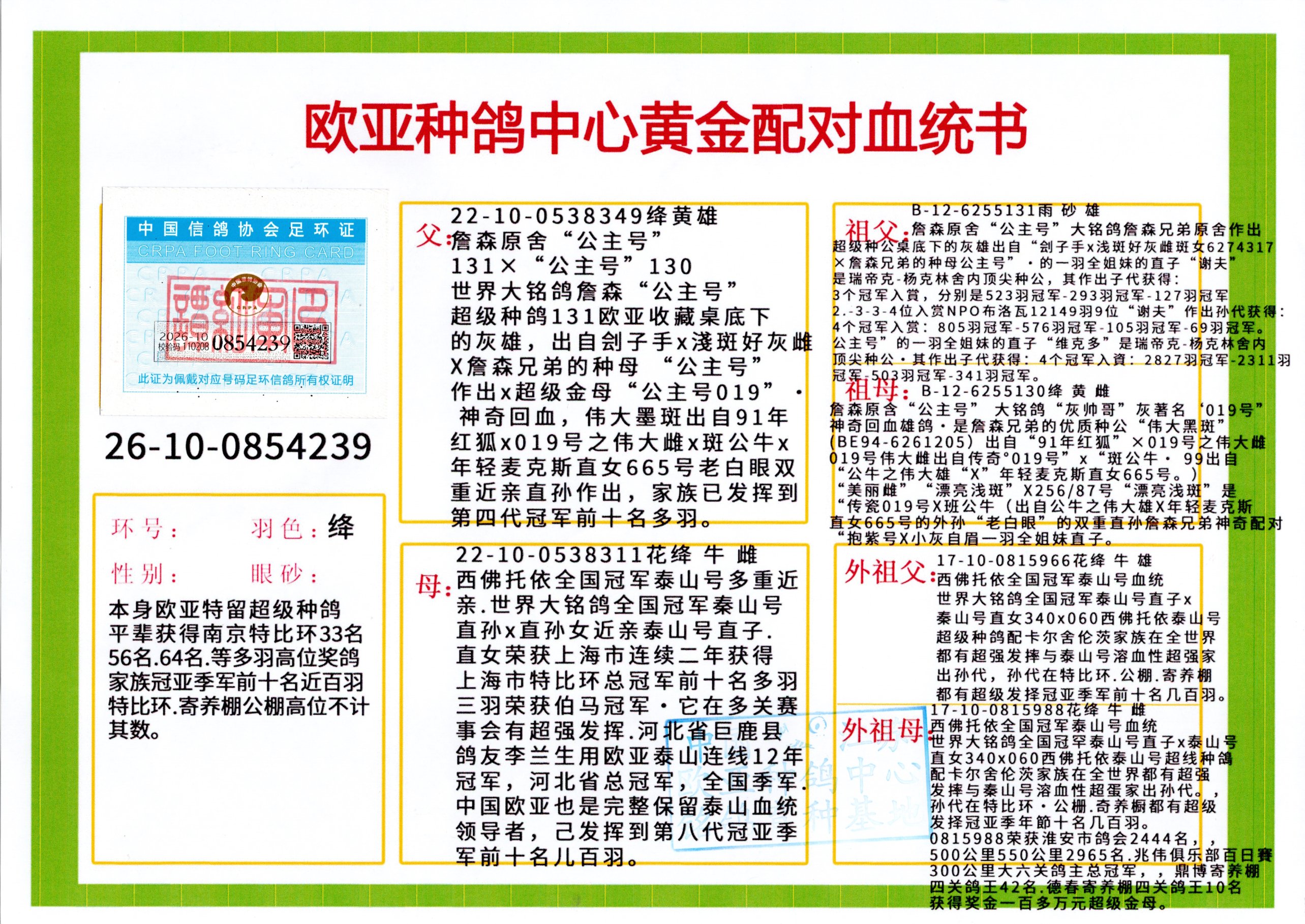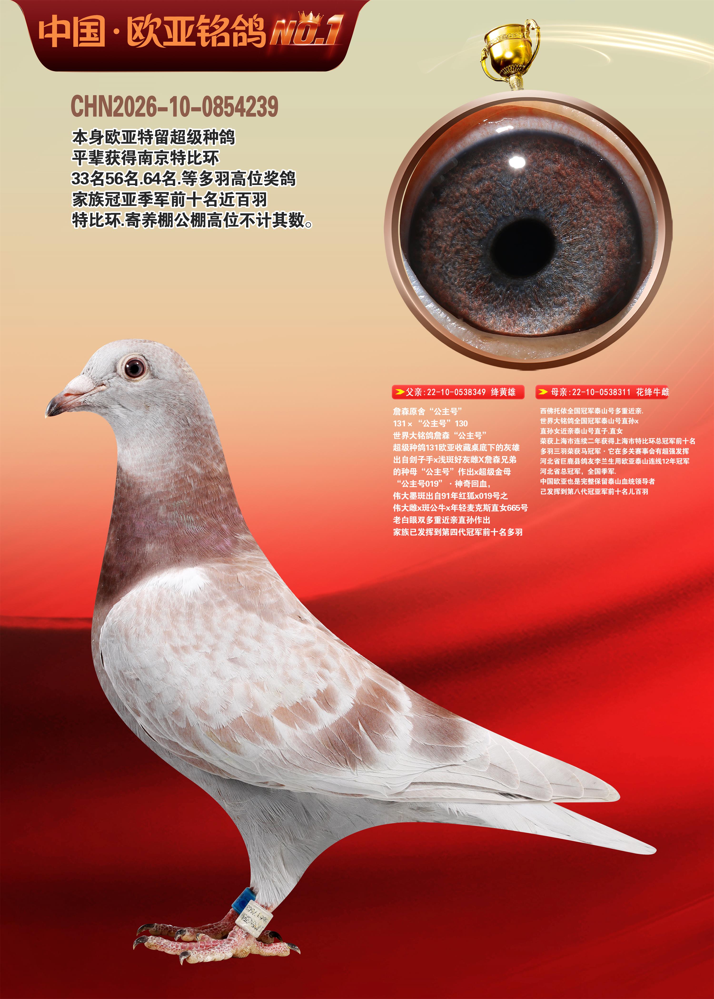 24年秋南京特比环欧亚荣获大团体冠军.小团体冠军551公里大特比13名.14名.16名.19名.20名.21名.24名.26名.27名.28名.42名.52名.54名.57名.65名.66名.68名.70名.71名.72名.74名.76名.80名.82名.83名.84名.85名.86名.90名.92名.110名.116名.121名.122名.128名.131名.158名.161名.164名.165名.166名.172名.174名.177名.182名.195名.196名.201名.205名.208名.210名.216名.253名.269名.275名.276名.294名.296名.299名,,24年秋云南天南铜都公棚决赛415名.天南铜都小棚决赛409名.云南玉活公棚决赛102名.490名.团体32名上笼二羽进二羽,天南铜都大棚506公里决赛445名。热烈祝贺河北省巨鹿县李兰生老师用欧亚泰山号血系连续十一年夺冠军,河北省国家赛冠军.全国季军等多次前十名高位,扬州王军王总用欧亚利奥24年春季获山东翔宇公棚决赛33名盖比53名。南京刘正龙刘总用欧亚盖比获得24年秋山东潍坊国际公棚决赛42名.精英赛30名.三关鸽王71名.决赛86名.加站赛16名.南京市特比环A组鸽王9名.B组鸽王5名.6名.C组鸽王5名.精英赛冠军4名.技能赛A组冠军4名.5名.秦淮区特比环荣获15名.46名.48名.87名。四川西昌徐亮徐总用欧亚利奥获得凉山州聚友决赛177名.第二关亚军双关鸽王19名.三关鸽王105名.云南豪庭公棚决赛603名。热烈祝贺24年四川重庆翔园鸽舍用欧亚泰山号荣获春季400公里冠军.秋季500公里冠军,河北王总用詹森X利奥获得千羽千翔公棚400公里冠军,广东蔡楷焕荣获24年秋爱好者 赛鸽俱乐部三关鸽王季军.一关420公里99名.二关450公里11名.三关520公里32名.单关季军.7名.12名,江西李卫兴荣获贵州红枫公棚8名.共翔俱乐部寄养棚四关综合鸽王30名.一关400公里78名.二关500公里55名.三关520公里37名.四关500公里57名.同父母获公棚18名.雷鸣获得武汉黄浦育翔中心冠军,四川陈文获得四川明鸿俱乐部300公里梦幻2名.3名.4名.9名.10名.13名.14名.15名.31名.34名.40名.41名.42名.43名.69名.71名.72名.73名.74名.94名.95名.97名.98名.99名.419公里决赛荣获总冠军7名.总共归巢9羽,四川徐亮获豪庭决赛603名,山西郑勇获得山西泰鑫公棚决赛255名詹森红狐,热烈祝贺马总获得开尔(飞跃队)决赛9名获奖金1310000万元.第一关52名,天津津福资赛180公里96名.获奖金429543万元,欧亚支持全国鸽友24年秋多人报喜 祝大家取得更好成绩,给欧亚报喜鸽友欧亚决定给每人赠送一羽超级种鸽。欧亚俱乐部特比环多关鸽王成绩:15年秋淮安特比环黑色星期一全会上笼9700多羽,当天无鸽归巢,第二天全会归巢357羽,本舍归巢158羽.前十名八羽.前一百名归巢57羽,16年春季获五关鸽王总冠军,总亚军四名.六名.七名.九名.十名.晶艺俱乐部520公里冠亚季军5名.6名.7名.9名.11名等,火车头冠军.季军6名.8名.9名.10名,16年秋晶艺俱乐部特比环520公里亚军.季军4名.6名.7名.9名,15年春南京白下特比环冠军.亚军.季军6名.7名.8名.9名.10名.指定鸽A B组获得冠军.亚军.季军4名.5名.,17年淮安特比环亚军.4名.5名.7名.8名.10名.六关鸽王总冠军.4名.6名.9名.10名,寄养棚宿迁刘总20羽特比环获冠军.季军.4名.7名.8名.9名等。18年荣获万羽特比环六关鸽王总冠军.总亚军.总季军.6名.8名.十名.单关四羽冠军.二羽亚军.四羽季军.前十名27羽。19年秋万羽特比环六关鸽王总亚军.总季军.5名.8名等,单关二羽冠军.三羽亚军.一羽季军前十名31羽。20年秋淮安市鸽会四关特比环大赛风雨无阻鸽王亚军.鸽王六名,金品俱乐部万羽特比环六关鸽王总冠军,总亚军.四名.五名.六名.七名.八名.十名.前二百名鸽王35羽,单关冠亚季军前十名四十多羽,火车头五关鸽王季军.六名.八名.前二百名鸽王十七羽。20年春荣获淮安五区一市四关鸽王总冠军.亚军.四名.八名.九名。21年秋荣获金品万羽特比环大赛六关鸽王总亚军.总季军.四名.七名.九名.十名.单关冠亚军季军前十名三十多羽。火车头协会鸽王六名.七名.十名.单关前十名十七羽。22年秋荣获鸽王总冠军.总亚军.5名.7名.8名.9名.11名.单关冠亚季军前十名三十多羽,第一关单关前二百名四十多羽,第二关前二百名三十多羽,第三关前二百名四十多羽,第四关前二百名四十多羽,第五关前一百名53羽。23年秋荣获鸽王季军.五名.八名.十名.13名.17名.20名.27名等多羽鸽王.单关前十名二十多羽。公棚.寄养棚部分成绩:16年秋宁夏黄河公棚总冠军电脑戈马力指定通炮冠军,17年送八羽参赛获得鸽王八名进奖四名,支持韩总荣获八名。支持鸽友荣获宁夏中卫公棚决赛总冠军.精英赛冠军,支持18年宁夏黄河公棚决赛冠军詹森X泰山。安徽鼎博寄养棚院内外四关鸽王总冠军.鸽王十七名.三十七名同窝,鸽王39名.42名.58名.67名。18年山东公棚预赛冠军.决赛65名.送八羽进奖五羽.指定获奔驰汽车一辆。支持鸽友获得云南蓝云公棚冠军.盖比X佛卡门。支持鸽友荣获云南银集公棚决赛冠军 詹森427X520血系 速度赛6700羽冠军。17年荣获金马俱乐部寄养棚四关鸽王总冠军.季军.六名.八名.第一关冠军.亚军.季军四名.七名.十一名.金牌教练奖。支持鸽友18年北京费翔公棚预赛九名电脑X桑杰士,支持鸽友荣获陕西威力公棚决赛11名.内蒙古临河寄养棚四关鸽王六名.詹森配泰山,支持河北王总用欧亚詹森427配胡本喜获20年秋开尔青年棚季军。云南东荣公棚16年预赛冠军.决赛77名.17年决赛12名.詹森红狐X泰山,17年平安公棚决赛4名 詹森427。欧亚获得21年金母寄养棚第一关四名.第二关5名.第三关5名.6名.7名.10名.三关鸽王总冠军,四关鸽王14名.十羽鸽王。支持河