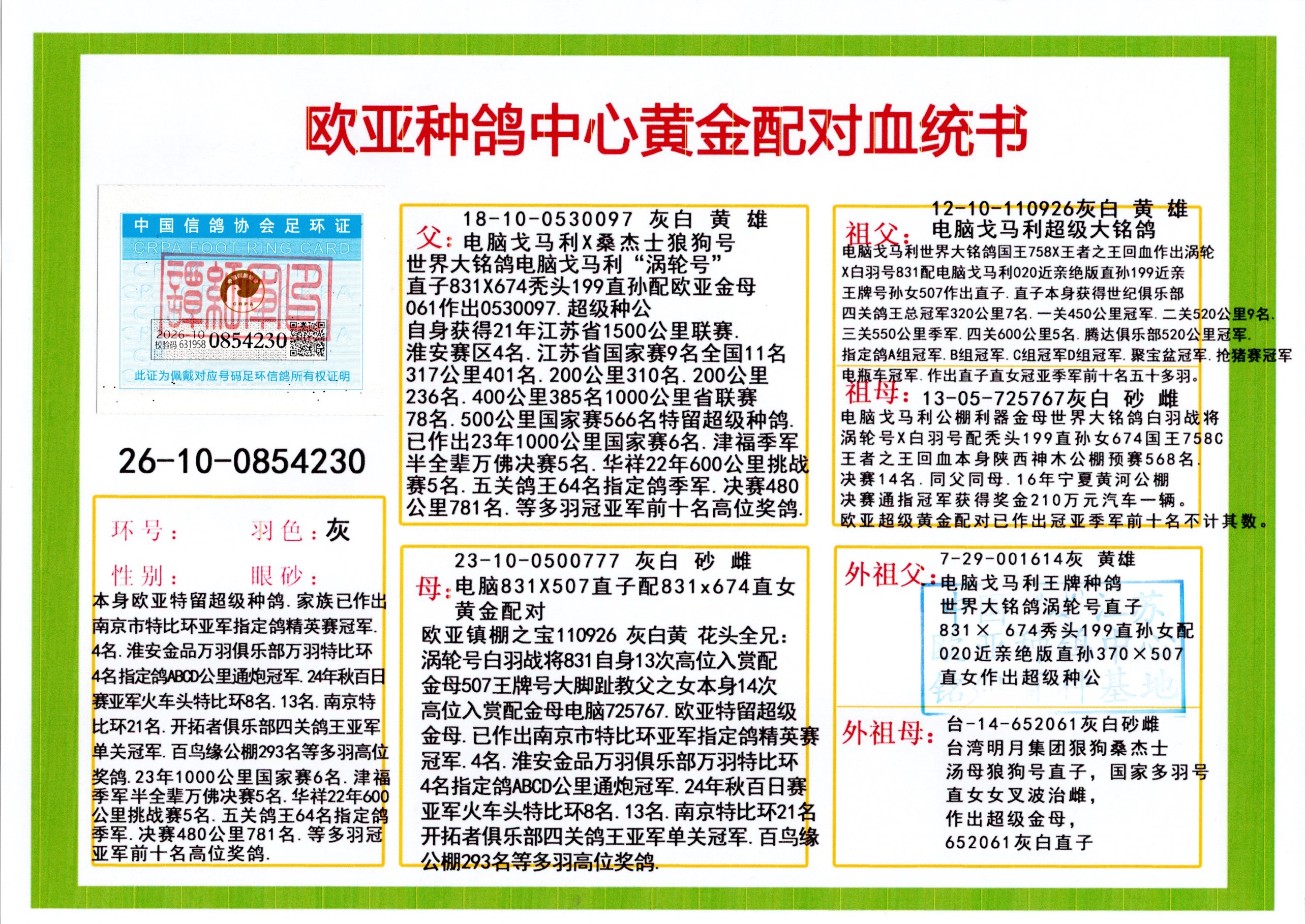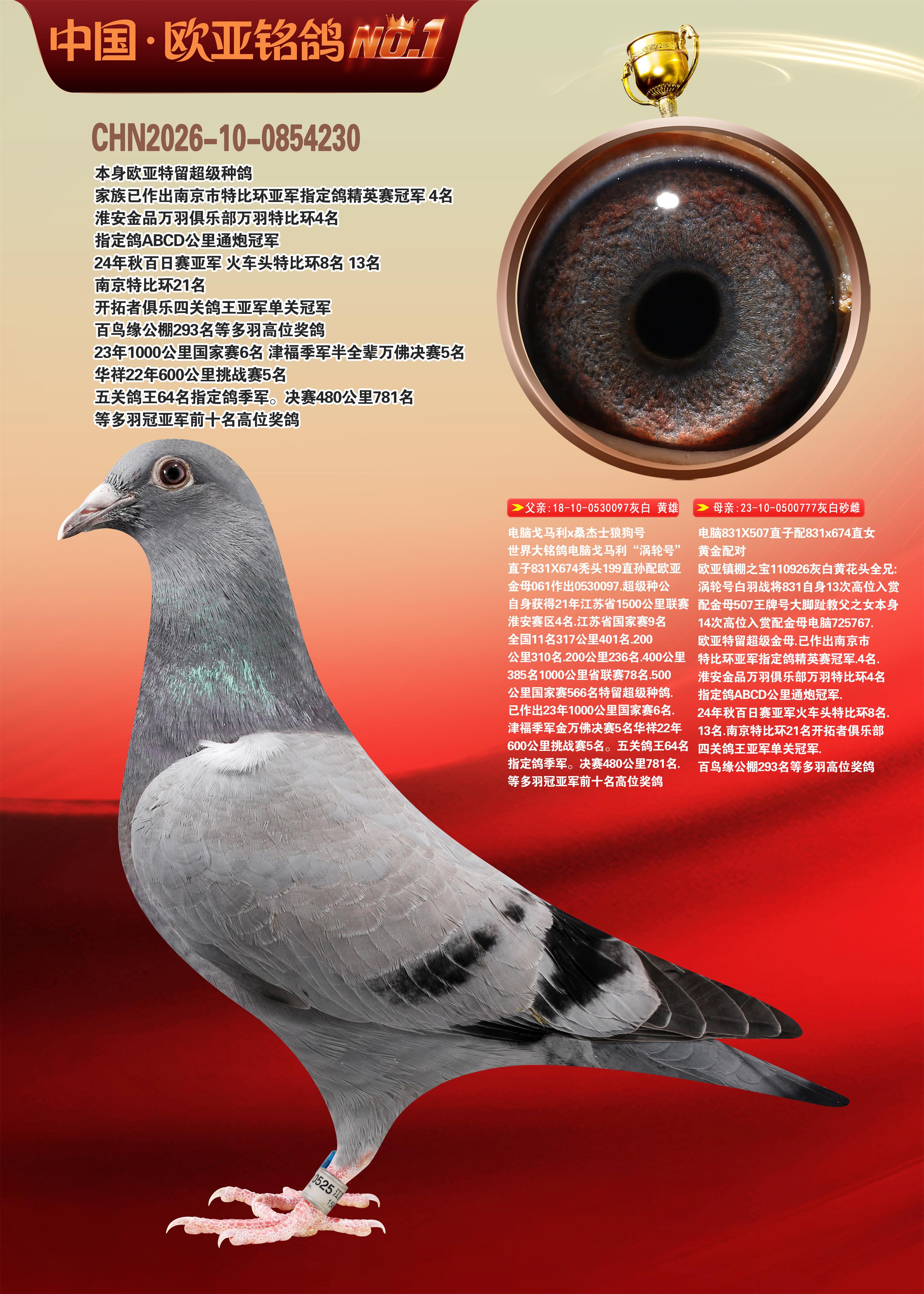 24年秋南京特比环欧亚荣获大团体冠军.小团体冠军551公里大特比13名.14名.16名.19名.20名.21名.24名.26名.27名.28名.42名.52名.54名.57名.65名.66名.68名.70名.71名.72名.74名.76名.80名.82名.83名.84名.85名.86名.90名.92名.110名.116名.121名.122名.128名.131名.158名.161名.164名.165名.166名.172名.174名.177名.182名.195名.196名.201名.205名.208名.210名.216名.253名.269名.275名.276名.294名.296名.299名,,24年秋云南天南铜都公棚决赛415名.天南铜都小棚决赛409名.云南玉活公棚决赛102名.490名.团体32名上笼二羽进二羽,天南铜都大棚506公里决赛445名。热烈祝贺河北省巨鹿县李兰生老师用欧亚泰山号血系连续十一年夺冠军,河北省国家赛冠军.全国季军等多次前十名高位,扬州王军王总用欧亚利奥24年春季获山东翔宇公棚决赛33名盖比53名。南京刘正龙刘总用欧亚盖比获得24年秋山东潍坊国际公棚决赛42名.精英赛30名.三关鸽王71名.决赛86名.加站赛16名.南京市特比环A组鸽王9名.B组鸽王5名.6名.C组鸽王5名.精英赛冠军4名.技能赛A组冠军4名.5名.秦淮区特比环荣获15名.46名.48名.87名。四川西昌徐亮徐总用欧亚利奥获得凉山州聚友决赛177名.第二关亚军双关鸽王19名.三关鸽王105名.云南豪庭公棚决赛603名。热烈祝贺24年四川重庆翔园鸽舍用欧亚泰山号荣获春季400公里冠军.秋季500公里冠军,河北王总用詹森X利奥获得千羽千翔公棚400公里冠军,广东蔡楷焕荣获24年秋爱好者 赛鸽俱乐部三关鸽王季军.一关420公里99名.二关450公里11名.三关520公里32名.单关季军.7名.12名,江西李卫兴荣获贵州红枫公棚8名.共翔俱乐部寄养棚四关综合鸽王30名.一关400公里78名.二关500公里55名.三关520公里37名.四关500公里57名.同父母获公棚18名.雷鸣获得武汉黄浦育翔中心冠军,四川陈文获得四川明鸿俱乐部300公里梦幻2名.3名.4名.9名.10名.13名.14名.15名.31名.34名.40名.41名.42名.43名.69名.71名.72名.73名.74名.94名.95名.97名.98名.99名.419公里决赛荣获总冠军7名.总共归巢9羽,四川徐亮获豪庭决赛603名,山西郑勇获得山西泰鑫公棚决赛255名詹森红狐,热烈祝贺马总获得开尔(飞跃队)决赛9名获奖金1310000万元.第一关52名,天津津福资赛180公里96名.获奖金429543万元,欧亚支持全国鸽友24年秋多人报喜 祝大家取得更好成绩,给欧亚报喜鸽友欧亚决定给每人赠送一羽超级种鸽。欧亚俱乐部特比环多关鸽王成绩:15年秋淮安特比环黑色星期一全会上笼9700多羽,当天无鸽归巢,第二天全会归巢357羽,本舍归巢158羽.前十名八羽.前一百名归巢57羽,16年春季获五关鸽王总冠军,总亚军四名.六名.七名.九名.十名.晶艺俱乐部520公里冠亚季军5名.6名.7名.9名.11名等,火车头冠军.季军6名.8名.9名.10名,16年秋晶艺俱乐部特比环520公里亚军.季军4名.6名.7名.9名,15年春南京白下特比环冠军.亚军.季军6名.7名.8名.9名.10名.指定鸽A B组获得冠军.亚军.季军4名.5名.,17年淮安特比环亚军.4名.5名.7名.8名.10名.六关鸽王总冠军.4名.6名.9名.10名,寄养棚宿迁刘总20羽特比环获冠军.季军.4名.7名.8名.9名等。18年荣获万羽特比环六关鸽王总冠军.总亚军.总季军.6名.8名.十名.单关四羽冠军.二羽亚军.四羽季军.前十名27羽。19年秋万羽特比环六关鸽王总亚军.总季军.5名.8名等,单关二羽冠军.三羽亚军.一羽季军前十名31羽。20年秋淮安市鸽会四关特比环大赛风雨无阻鸽王亚军.鸽王六名,金品俱乐部万羽特比环六关鸽王总冠军,总亚军.四名.五名.六名.七名.八名.十名.前二百名鸽王35羽,单关冠亚季军前十名四十多羽,火车头五关鸽王季军.六名.八名.前二百名鸽王十七羽。20年春荣获淮安五区一市四关鸽王总冠军.亚军.四名.八名.九名。21年秋荣获金品万羽特比环大赛六关鸽王总亚军.总季军.四名.七名.九名.十名.单关冠亚军季军前十名三十多羽。火车头协会鸽王六名.七名.十名.单关前十名十七羽。22年秋荣获鸽王总冠军.总亚军.5名.7名.8名.9名.11名.单关冠亚季军前十名三十多羽,第一关单关前二百名四十多羽,第二关前二百名三十多羽,第三关前二百名四十多羽,第四关前二百名四十多羽,第五关前一百名53羽。23年秋荣获鸽王季军.五名.八名.十名.13名.17名.20名.27名等多羽鸽王.单关前十名二十多羽。公棚.寄养棚部分成绩:16年秋宁夏黄河公棚总冠军电脑戈马力指定通炮冠军,17年送八羽参赛获得鸽王八名进奖四名,支持韩总荣获八名。支持鸽友荣获宁夏中卫公棚决赛总冠军.精英赛冠军,支持18年宁夏黄河公棚决赛冠军詹森X泰山。安徽鼎博寄养棚院内外四关鸽王总冠军.鸽王十七名.三十七名同窝,鸽王39名.42名.58名.67名。18年山东公棚预赛冠军.决赛65名.送八羽进奖五羽.指定获奔驰汽车一辆。支持鸽友获得云南蓝云公棚冠军.盖比X佛卡门。支持鸽友荣获云南银集公棚决赛冠军 詹森427X520血系 速度赛6700羽冠军。17年荣获金马俱乐部寄养棚四关鸽王总冠军.季军.六名.八名.第一关冠军.亚军.季军四名.七名.十一名.金牌教练奖。支持鸽友18年北京费翔公棚预赛九名电脑X桑杰士,支持鸽友荣获陕西威力公棚决赛11名.内蒙古临河寄养棚四关鸽王六名.詹森配泰山,支持河北王总用欧亚詹森427配胡本喜获20年秋开尔青年棚季军。云南东荣公棚16年预赛冠军.决赛77名.17年决赛12名.詹森红狐X泰山,17年平安公棚决赛4名 詹森427。欧亚获得21年金母寄养棚第一关四名.第二关5名.第三关5名.6名.7名.10名.三关鸽王总冠军,四关鸽王14名.十羽鸽王。支持河