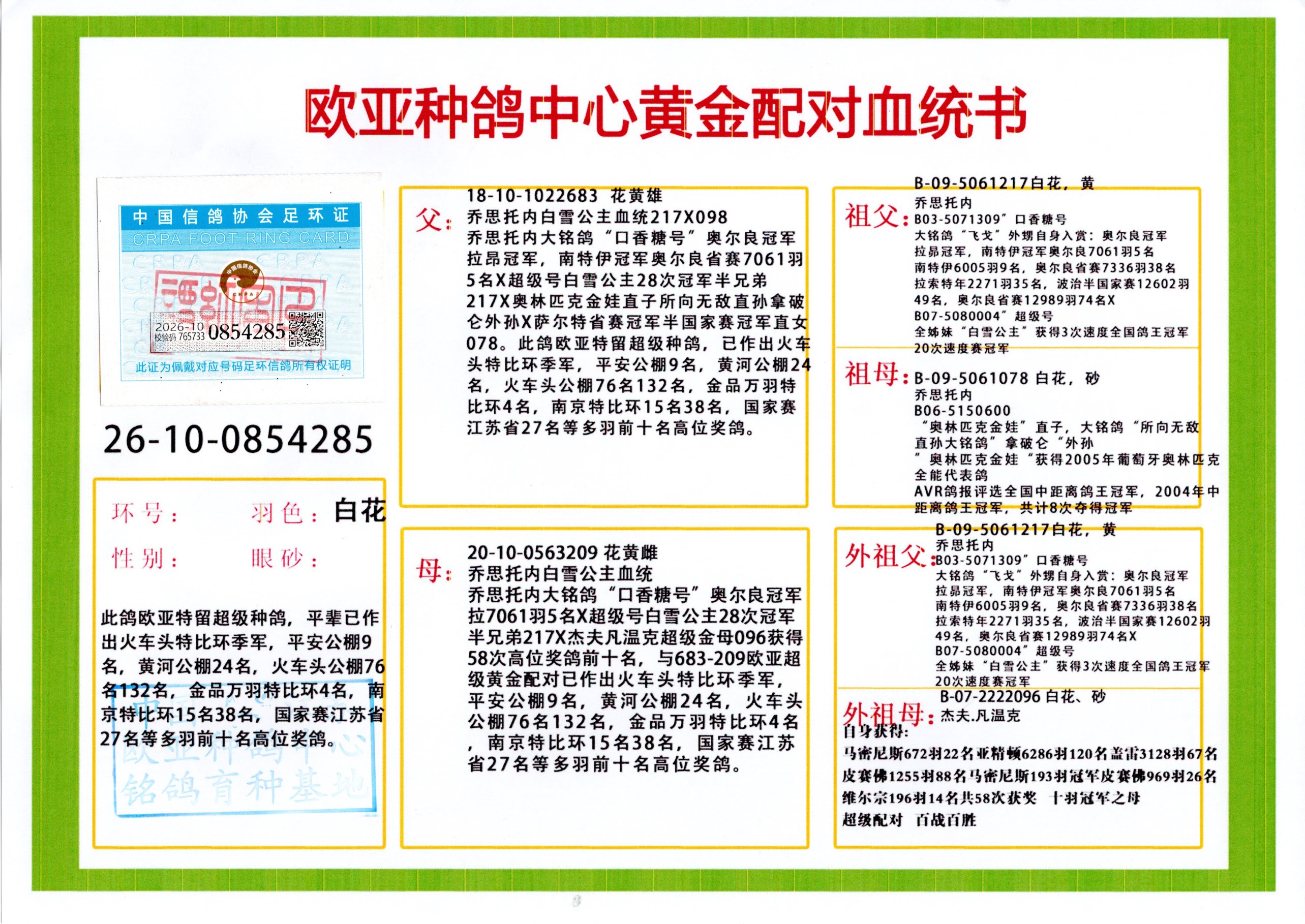 24年秋南京特比环欧亚荣获大团体冠军.小团体冠军551公里大特比13名.14名.16名.19名.20名.21名.24名.26名.27名.28名.42名.52名.54名.57名.65名.66名.68名.70名.71名.72名.74名.76名.80名.82名.83名.84名.85名.86名.90名.92名.110名.116名.121名.122名.128名.131名.158名.161名.164名.165名.166名.172名.174名.177名.182名.195名.196名.201名.205名.208名.210名.216名.253名.269名.275名.276名.294名.296名.299名,,24年秋云南天南铜都公棚决赛415名.天南铜都小棚决赛409名.云南玉活公棚决赛102名.490名.团体32名上笼二羽进二羽,天南铜都大棚506公里决赛445名。热烈祝贺河北省巨鹿县李兰生老师用欧亚泰山号血系连续十一年夺冠军,河北省国家赛冠军.全国季军等多次前十名高位,扬州王军王总用欧亚利奥24年春季获山东翔宇公棚决赛33名盖比53名。南京刘正龙刘总用欧亚盖比获得24年秋山东潍坊国际公棚决赛42名.精英赛30名.三关鸽王71名.决赛86名.加站赛16名.南京市特比环A组鸽王9名.B组鸽王5名.6名.C组鸽王5名.精英赛冠军4名.技能赛A组冠军4名.5名.秦淮区特比环荣获15名.46名.48名.87名。四川西昌徐亮徐总用欧亚利奥获得凉山州聚友决赛177名.第二关亚军双关鸽王19名.三关鸽王105名.云南豪庭公棚决赛603名。热烈祝贺24年四川重庆翔园鸽舍用欧亚泰山号荣获春季400公里冠军.秋季500公里冠军,河北王总用詹森X利奥获得千羽千翔公棚400公里冠军,广东蔡楷焕荣获24年秋爱好者 赛鸽俱乐部三关鸽王季军.一关420公里99名.二关450公里11名.三关520公里32名.单关季军.7名.12名,江西李卫兴荣获贵州红枫公棚8名.共翔俱乐部寄养棚四关综合鸽王30名.一关400公里78名.二关500公里55名.三关520公里37名.四关500公里57名.同父母获公棚18名.雷鸣获得武汉黄浦育翔中心冠军,四川陈文获得四川明鸿俱乐部300公里梦幻2名.3名.4名.9名.10名.13名.14名.15名.31名.34名.40名.41名.42名.43名.69名.71名.72名.73名.74名.94名.95名.97名.98名.99名.419公里决赛荣获总冠军7名.总共归巢9羽,四川徐亮获豪庭决赛603名,山西郑勇获得山西泰鑫公棚决赛255名詹森红狐,热烈祝贺马总获得开尔(飞跃队)决赛9名获奖金1310000万元.第一关52名,天津津福资赛180公里96名.获奖金429543万元,欧亚支持全国鸽友24年秋多人报喜 祝大家取得更好成绩,给欧亚报喜鸽友欧亚决定给每人赠送一羽超级种鸽。欧亚俱乐部特比环多关鸽王成绩:15年秋淮安特比环黑色星期一全会上笼9700多羽,当天无鸽归巢,第二天全会归巢357羽,本舍归巢158羽.前十名八羽.前一百名归巢57羽,16年春季获五关鸽王总冠军,总亚军四名.六名.七名.九名.十名.晶艺俱乐部520公里冠亚季军5名.6名.7名.9名.11名等,火车头冠军.季军6名.8名.9名.10名,16年秋晶艺俱乐部特比环520公里亚军.季军4名.6名.7名.9名,15年春南京白下特比环冠军.亚军.季军6名.7名.8名.9名.10名.指定鸽A B组获得冠军.亚军.季军4名.5名.,17年淮安特比环亚军.4名.5名.7名.8名.10名.六关鸽王总冠军.4名.6名.9名.10名,寄养棚宿迁刘总20羽特比环获冠军.季军.4名.7名.8名.9名等。18年荣获万羽特比环六关鸽王总冠军.总亚军.总季军.6名.8名.十名.单关四羽冠军.二羽亚军.四羽季军.前十名27羽。19年秋万羽特比环六关鸽王总亚军.总季军.5名.8名等,单关二羽冠军.三羽亚军.一羽季军前十名31羽。20年秋淮安市鸽会四关特比环大赛风雨无阻鸽王亚军.鸽王六名,金品俱乐部万羽特比环六关鸽王总冠军,总亚军.四名.五名.六名.七名.八名.十名.前二百名鸽王35羽,单关冠亚季军前十名四十多羽,火车头五关鸽王季军.六名.八名.前二百名鸽王十七羽。20年春荣获淮安五区一市四关鸽王总冠军.亚军.四名.八名.九名。21年秋荣获金品万羽特比环大赛六关鸽王总亚军.总季军.四名.七名.九名.十名.单关冠亚军季军前十名三十多羽。火车头协会鸽王六名.七名.十名.单关前十名十七羽。22年秋荣获鸽王总冠军.总亚军.5名.7名.8名.9名.11名.单关冠亚季军前十名三十多羽,第一关单关前二百名四十多羽,第二关前二百名三十多羽,第三关前二百名四十多羽,第四关前二百名四十多羽,第五关前一百名53羽。23年秋荣获鸽王季军.五名.八名.十名.13名.17名.20名.27名等多羽鸽王.单关前十名二十多羽。公棚.寄养棚部分成绩:16年秋宁夏黄河公棚总冠军电脑戈马力指定通炮冠军,17年送八羽参赛获得鸽王八名进奖四名,支持韩总荣获八名。支持鸽友荣获宁夏中卫公棚决赛总冠军.精英赛冠军,支持18年宁夏黄河公棚决赛冠军詹森X泰山。安徽鼎博寄养棚院内外四关鸽王总冠军.鸽王十七名.三十七名同窝,鸽王39名.42名.58名.67名。18年山东公棚预赛冠军.决赛65名.送八羽进奖五羽.指定获奔驰汽车一辆。支持鸽友获得云南蓝云公棚冠军.盖比X佛卡门。支持鸽友荣获云南银集公棚决赛冠军 詹森427X520血系 速度赛6700羽冠军。17年荣获金马俱乐部寄养棚四关鸽王总冠军.季军.六名.八名.第一关冠军.亚军.季军四名.七名.十一名.金牌教练奖。支持鸽友18年北京费翔公棚预赛九名电脑X桑杰士,支持鸽友荣获陕西威力公棚决赛11名.内蒙古临河寄养棚四关鸽王六名.詹森配泰山,支持河北王总用欧亚詹森427配胡本喜获20年秋开尔青年棚季军。云南东荣公棚16年预赛冠军.决赛77名.17年决赛12名.詹森红狐X泰山,17年平安公棚决赛4名 詹森427。欧亚获得21年金母寄养棚第一关四名.第二关5名.第三关5名.6名.7名.10名.三关鸽王总冠军,四关鸽王14名.十羽鸽王。支持河