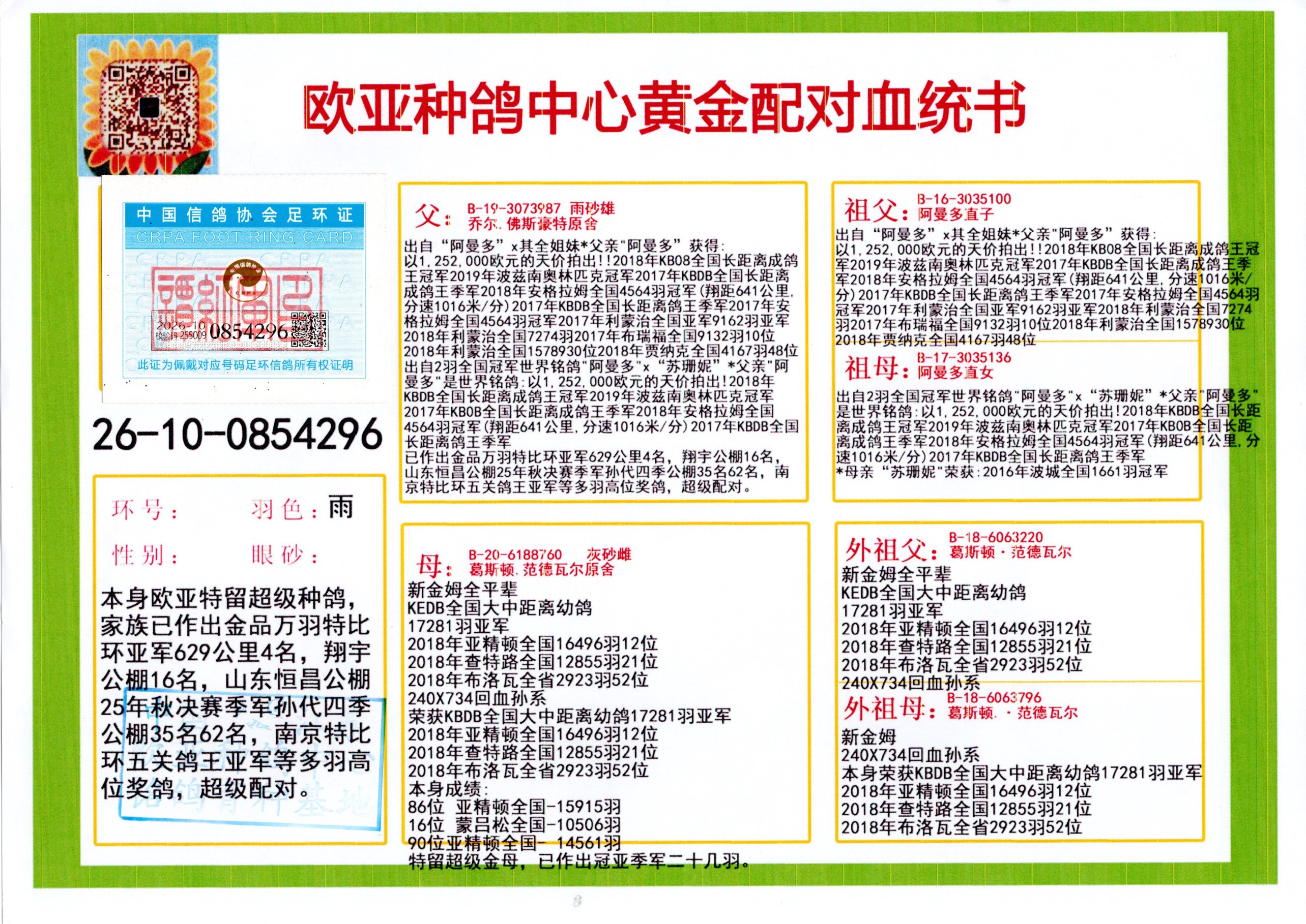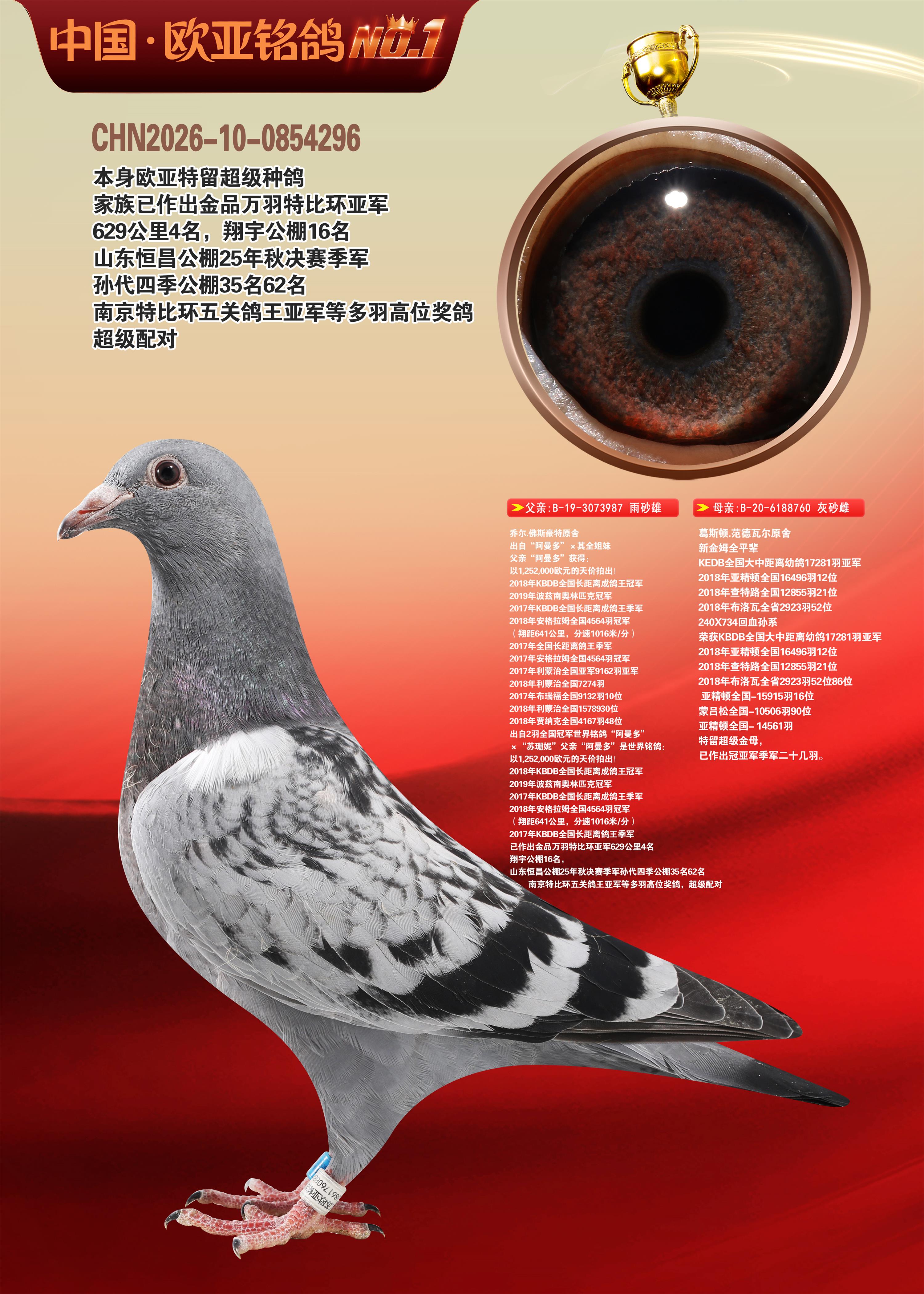 24年秋南京特比环欧亚荣获大团体冠军.小团体冠军551公里大特比13名.14名.16名.19名.20名.21名.24名.26名.27名.28名.42名.52名.54名.57名.65名.66名.68名.70名.71名.72名.74名.76名.80名.82名.83名.84名.85名.86名.90名.92名.110名.116名.121名.122名.128名.131名.158名.161名.164名.165名.166名.172名.174名.177名.182名.195名.196名.201名.205名.208名.210名.216名.253名.269名.275名.276名.294名.296名.299名,,24年秋云南天南铜都公棚决赛415名.天南铜都小棚决赛409名.云南玉活公棚决赛102名.490名.团体32名上笼二羽进二羽,天南铜都大棚506公里决赛445名。热烈祝贺河北省巨鹿县李兰生老师用欧亚泰山号血系连续十一年夺冠军,河北省国家赛冠军.全国季军等多次前十名高位,扬州王军王总用欧亚利奥24年春季获山东翔宇公棚决赛33名盖比53名。南京刘正龙刘总用欧亚盖比获得24年秋山东潍坊国际公棚决赛42名.精英赛30名.三关鸽王71名.决赛86名.加站赛16名.南京市特比环A组鸽王9名.B组鸽王5名.6名.C组鸽王5名.精英赛冠军4名.技能赛A组冠军4名.5名.秦淮区特比环荣获15名.46名.48名.87名。四川西昌徐亮徐总用欧亚利奥获得凉山州聚友决赛177名.第二关亚军双关鸽王19名.三关鸽王105名.云南豪庭公棚决赛603名。热烈祝贺24年四川重庆翔园鸽舍用欧亚泰山号荣获春季400公里冠军.秋季500公里冠军,河北王总用詹森X利奥获得千羽千翔公棚400公里冠军,广东蔡楷焕荣获24年秋爱好者 赛鸽俱乐部三关鸽王季军.一关420公里99名.二关450公里11名.三关520公里32名.单关季军.7名.12名,江西李卫兴荣获贵州红枫公棚8名.共翔俱乐部寄养棚四关综合鸽王30名.一关400公里78名.二关500公里55名.三关520公里37名.四关500公里57名.同父母获公棚18名.雷鸣获得武汉黄浦育翔中心冠军,四川陈文获得四川明鸿俱乐部300公里梦幻2名.3名.4名.9名.10名.13名.14名.15名.31名.34名.40名.41名.42名.43名.69名.71名.72名.73名.74名.94名.95名.97名.98名.99名.419公里决赛荣获总冠军7名.总共归巢9羽,四川徐亮获豪庭决赛603名,山西郑勇获得山西泰鑫公棚决赛255名詹森红狐,热烈祝贺马总获得开尔(飞跃队)决赛9名获奖金1310000万元.第一关52名,天津津福资赛180公里96名.获奖金429543万元,欧亚支持全国鸽友24年秋多人报喜 祝大家取得更好成绩,给欧亚报喜鸽友欧亚决定给每人赠送一羽超级种鸽。欧亚俱乐部特比环多关鸽王成绩:15年秋淮安特比环黑色星期一全会上笼9700多羽,当天无鸽归巢,第二天全会归巢357羽,本舍归巢158羽.前十名八羽.前一百名归巢57羽,16年春季获五关鸽王总冠军,总亚军四名.六名.七名.九名.十名.晶艺俱乐部520公里冠亚季军5名.6名.7名.9名.11名等,火车头冠军.季军6名.8名.9名.10名,16年秋晶艺俱乐部特比环520公里亚军.季军4名.6名.7名.9名,15年春南京白下特比环冠军.亚军.季军6名.7名.8名.9名.10名.指定鸽A B组获得冠军.亚军.季军4名.5名.,17年淮安特比环亚军.4名.5名.7名.8名.10名.六关鸽王总冠军.4名.6名.9名.10名,寄养棚宿迁刘总20羽特比环获冠军.季军.4名.7名.8名.9名等。18年荣获万羽特比环六关鸽王总冠军.总亚军.总季军.6名.8名.十名.单关四羽冠军.二羽亚军.四羽季军.前十名27羽。19年秋万羽特比环六关鸽王总亚军.总季军.5名.8名等,单关二羽冠军.三羽亚军.一羽季军前十名31羽。20年秋淮安市鸽会四关特比环大赛风雨无阻鸽王亚军.鸽王六名,金品俱乐部万羽特比环六关鸽王总冠军,总亚军.四名.五名.六名.七名.八名.十名.前二百名鸽王35羽,单关冠亚季军前十名四十多羽,火车头五关鸽王季军.六名.八名.前二百名鸽王十七羽。20年春荣获淮安五区一市四关鸽王总冠军.亚军.四名.八名.九名。21年秋荣获金品万羽特比环大赛六关鸽王总亚军.总季军.四名.七名.九名.十名.单关冠亚军季军前十名三十多羽。火车头协会鸽王六名.七名.十名.单关前十名十七羽。22年秋荣获鸽王总冠军.总亚军.5名.7名.8名.9名.11名.单关冠亚季军前十名三十多羽,第一关单关前二百名四十多羽,第二关前二百名三十多羽,第三关前二百名四十多羽,第四关前二百名四十多羽,第五关前一百名53羽。23年秋荣获鸽王季军.五名.八名.十名.13名.17名.20名.27名等多羽鸽王.单关前十名二十多羽。公棚.寄养棚部分成绩:16年秋宁夏黄河公棚总冠军电脑戈马力指定通炮冠军,17年送八羽参赛获得鸽王八名进奖四名,支持韩总荣获八名。支持鸽友荣获宁夏中卫公棚决赛总冠军.精英赛冠军,支持18年宁夏黄河公棚决赛冠军詹森X泰山。安徽鼎博寄养棚院内外四关鸽王总冠军.鸽王十七名.三十七名同窝,鸽王39名.42名.58名.67名。18年山东公棚预赛冠军.决赛65名.送八羽进奖五羽.指定获奔驰汽车一辆。支持鸽友获得云南蓝云公棚冠军.盖比X佛卡门。支持鸽友荣获云南银集公棚决赛冠军 詹森427X520血系 速度赛6700羽冠军。17年荣获金马俱乐部寄养棚四关鸽王总冠军.季军.六名.八名.第一关冠军.亚军.季军四名.七名.十一名.金牌教练奖。支持鸽友18年北京费翔公棚预赛九名电脑X桑杰士,支持鸽友荣获陕西威力公棚决赛11名.内蒙古临河寄养棚四关鸽王六名.詹森配泰山,支持河北王总用欧亚詹森427配胡本喜获20年秋开尔青年棚季军。云南东荣公棚16年预赛冠军.决赛77名.17年决赛12名.詹森红狐X泰山,17年平安公棚决赛4名 詹森427。欧亚获得21年金母寄养棚第一关四名.第二关5名.第三关5名.6名.7名.10名.三关鸽王总冠军,四关鸽王14名.十羽鸽王。支持河